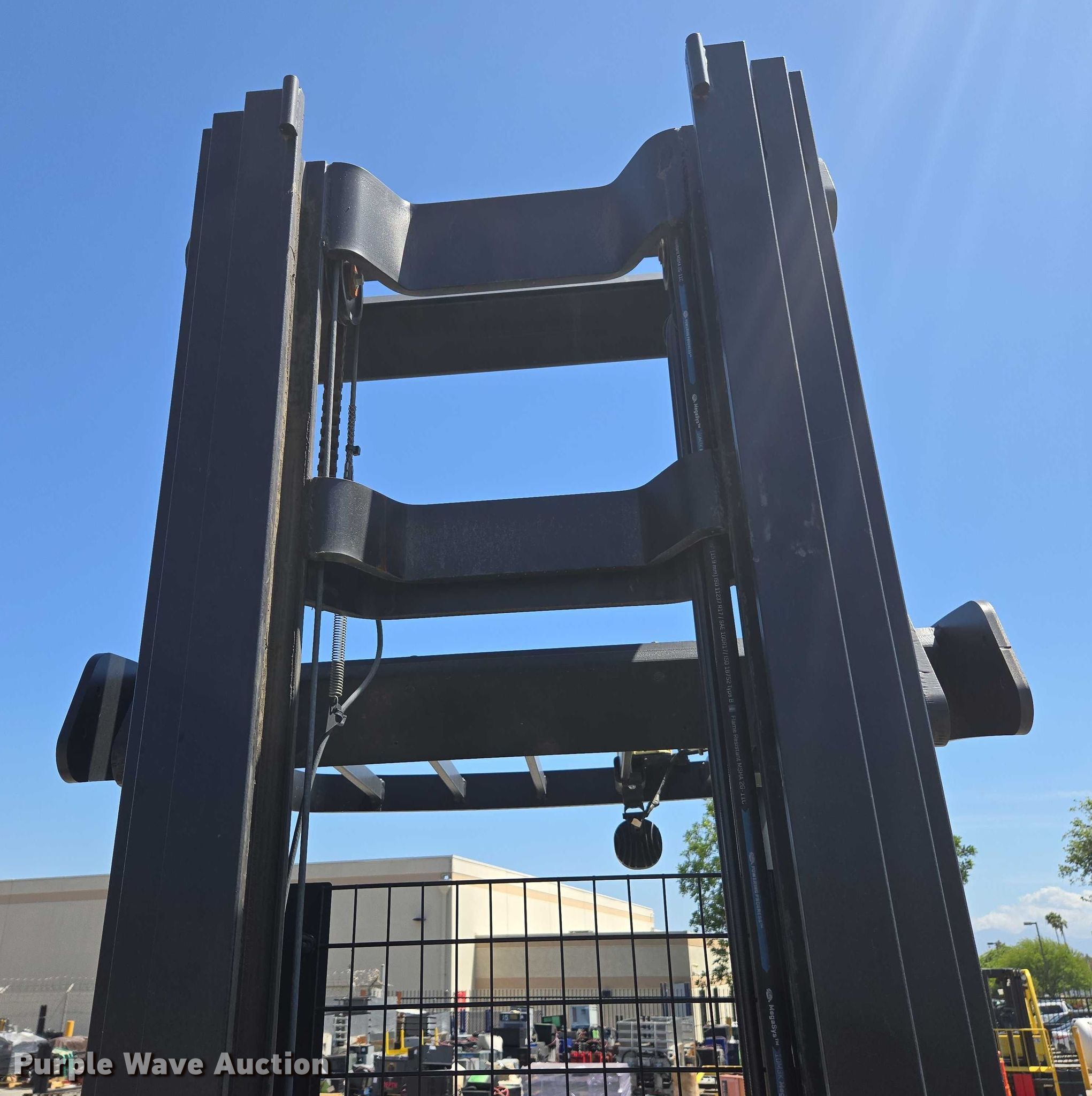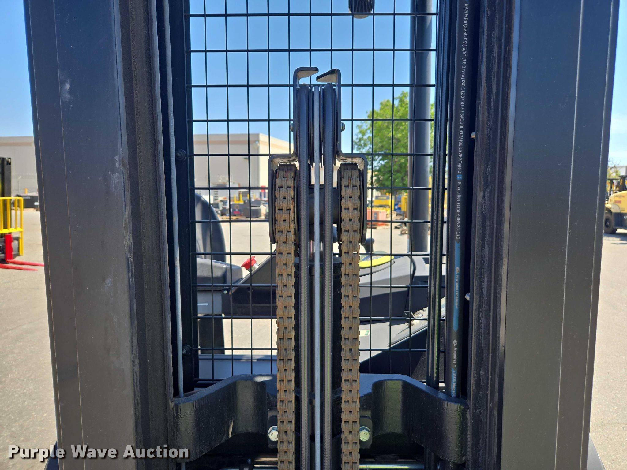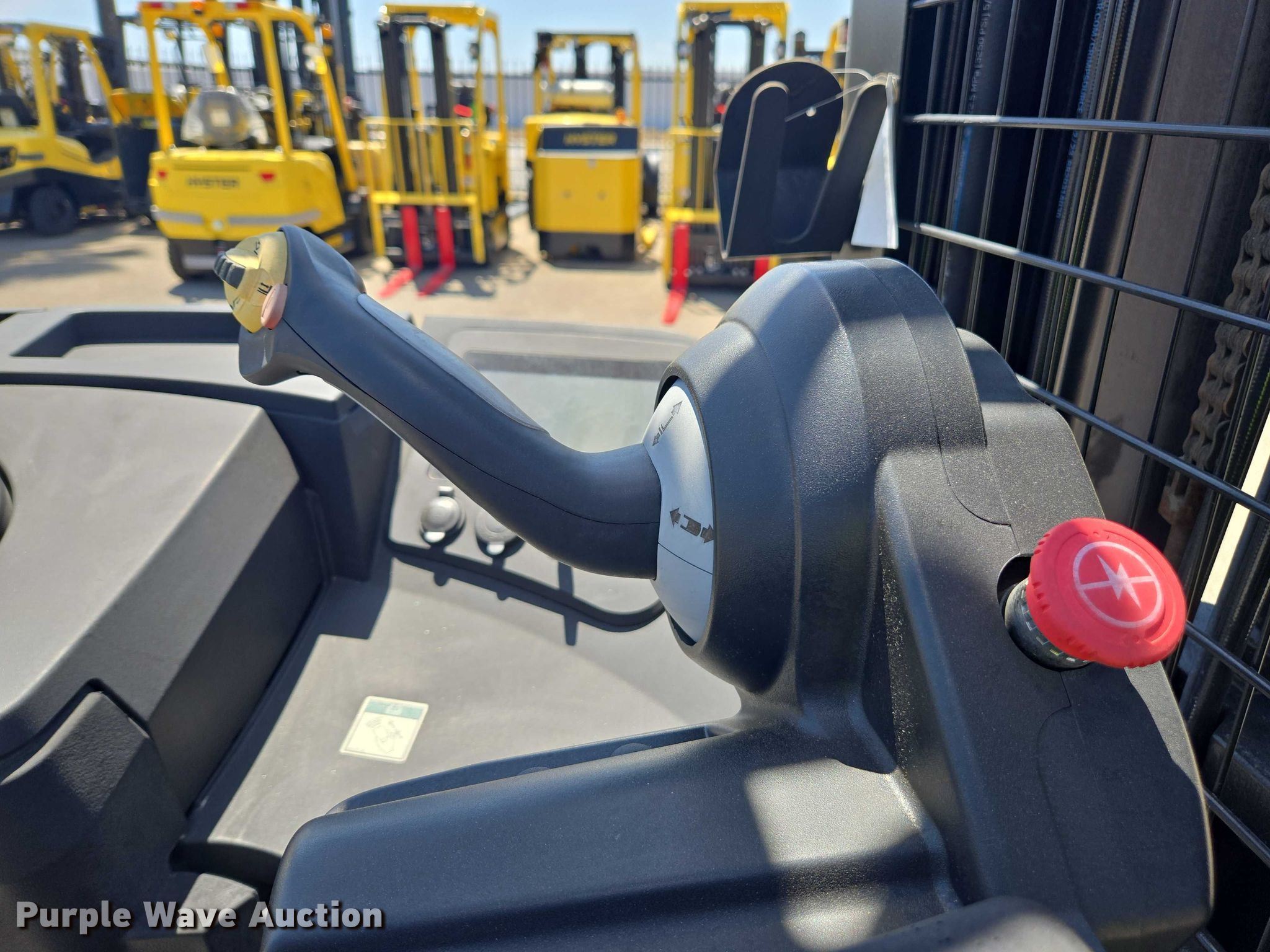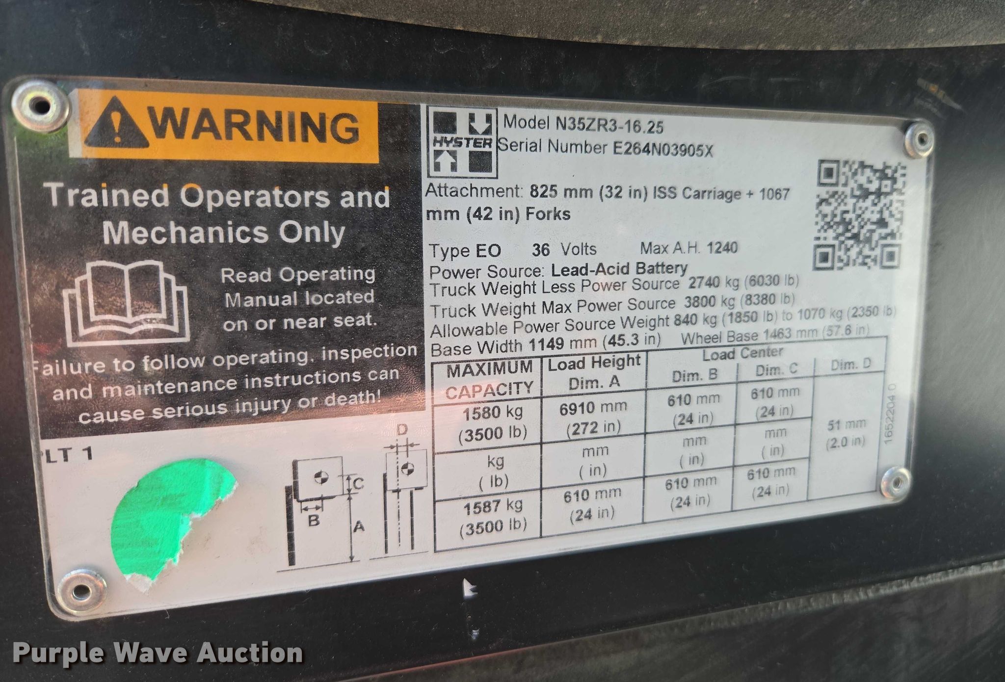 2023 Hyster N35ZR3-16.25 reach truck. Hours: 0 on meter, Serial: E264N03905X. Electric motor Volts: 36, Charger: Ecotec Access 13/36 /C, Battery: H2Go 18-125LM-13. Transmission Electric drive. Operators station OROPS. Features Maximum lift capacity: 3,500 lbs, Maximum lift height: 272", Collapsed mast height: 119", Basearm clearance Inner: 34", Outer: 45", Mast stages: 3, Mast tilt, Reach / retract, Fork length: 42". Tires Solid. Prologis. Fontana, CA 92335
