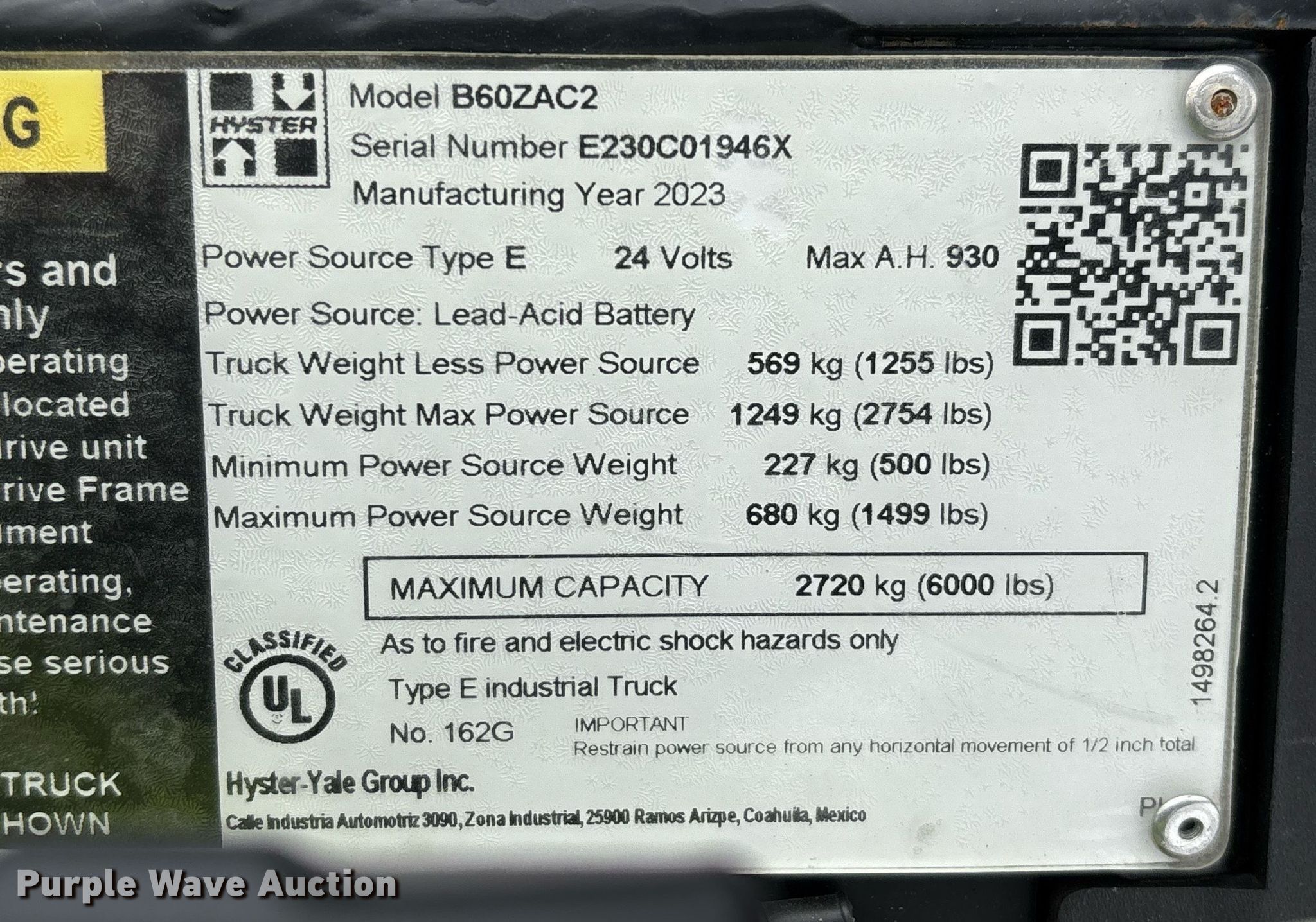 Purple Wave is selling a used Warehouse Forklift in California. This item is a 2023 Hyster B60ZAC2 pallet jack with the following: Hours: 0 on meter, Serial: E230C01946X
