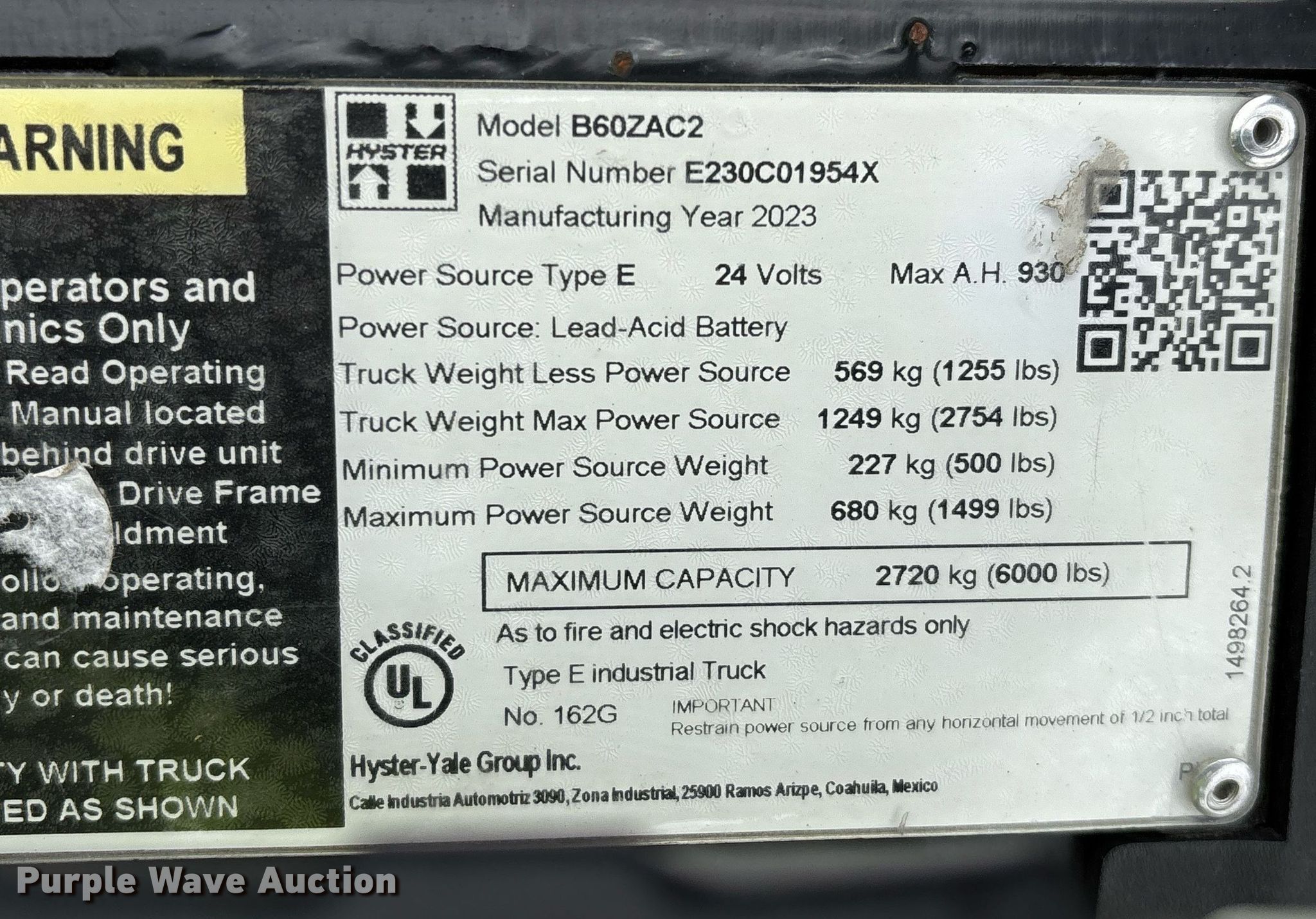 2023 Hyster B60ZAC2 pallet jack. Hours: 0 on meter, Serial: E230C01954X. Electric motor Volts: 24, Charger: Ecotec Access 13/36 /C, Battery: H2Go 18-85LM-13. Transmission Electric drive. Features Maximum lift capacity: 6,000 lbs, Fork length: 48". Notes Unused. Prologis. Fontana, CA 92335
