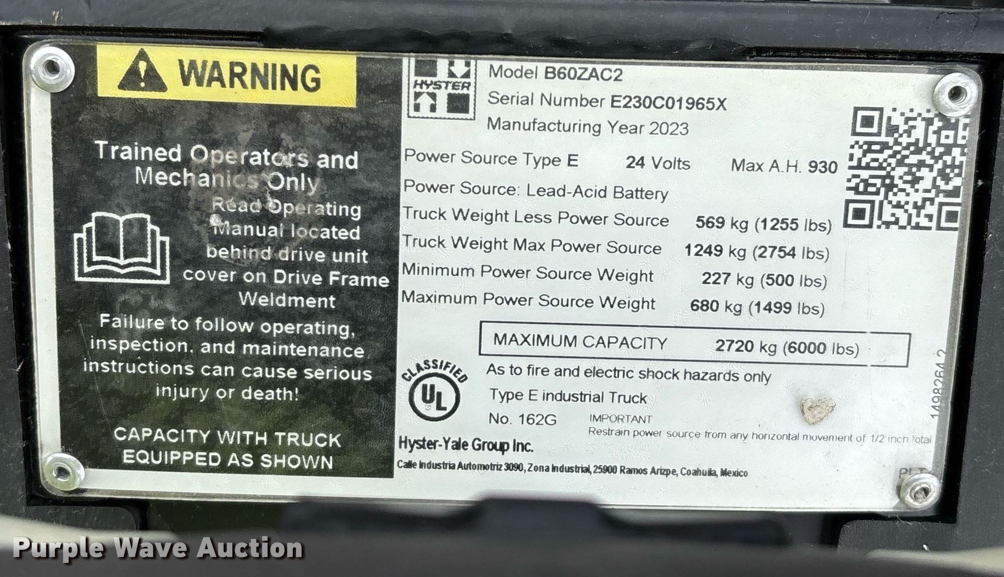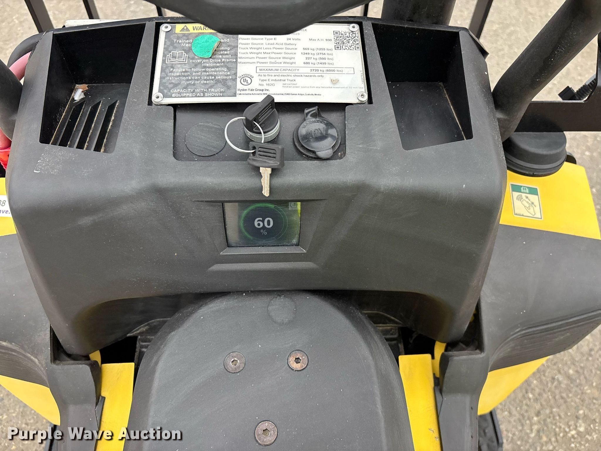 Purple Wave is selling a used Warehouse Forklift in California. This item is a 2023 Hyster B60ZAC2 pallet jack with the following: Hours: 0 on meter, Serial: E230C01965X