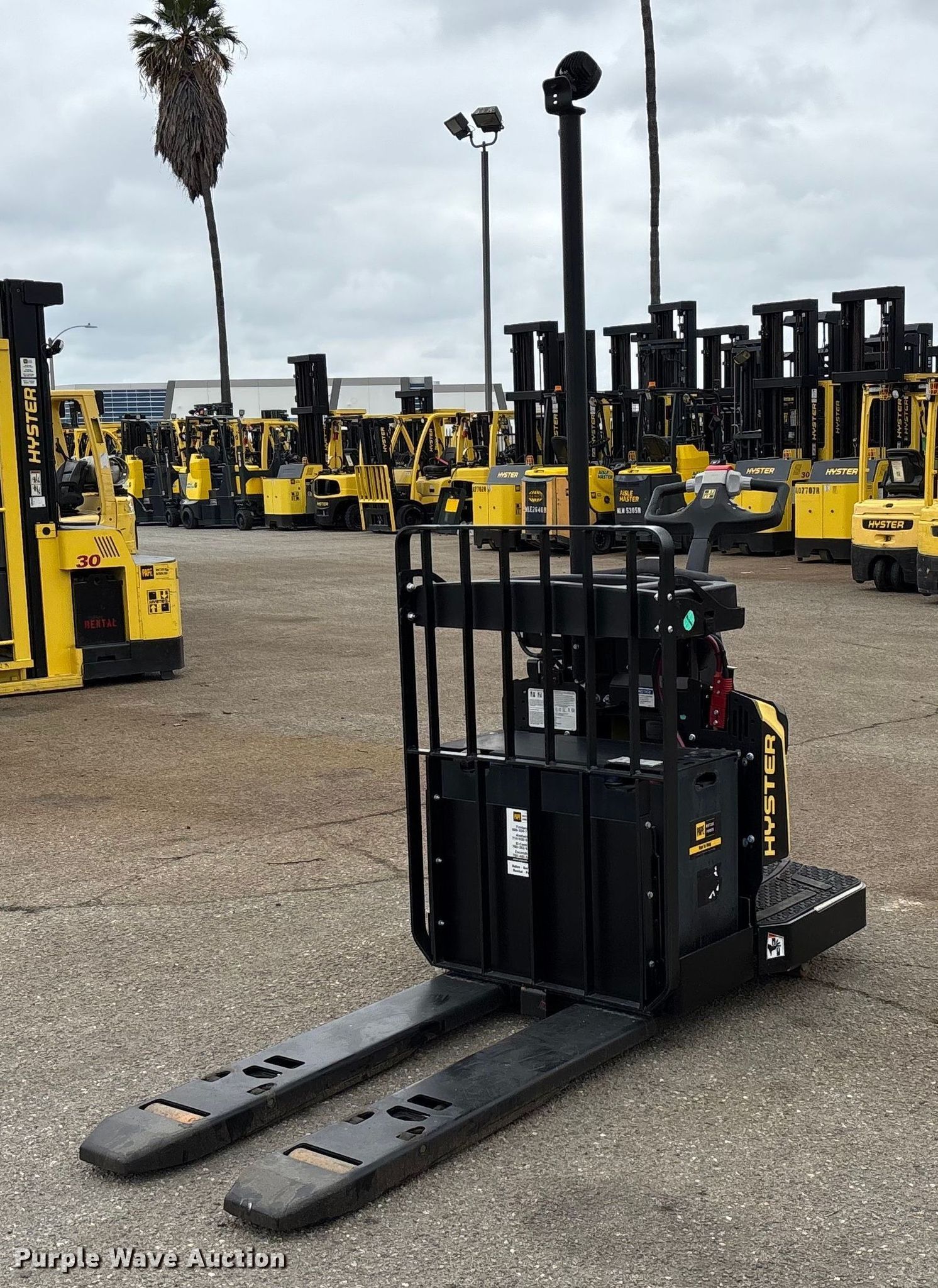 2023 Hyster B60ZAC2 pallet jack. Hours: 0 on meter, Serial: E230C01945X. Electric motor Volts: 24, Charger: Ecotec Access 13/36 /C, Battery: H2Go 18-85LM-13. Transmission Electric drive. Features Maximum lift capacity: 6,000 lbs, Fork length: 48". Notes Unused. Prologis. Fontana, CA 92335