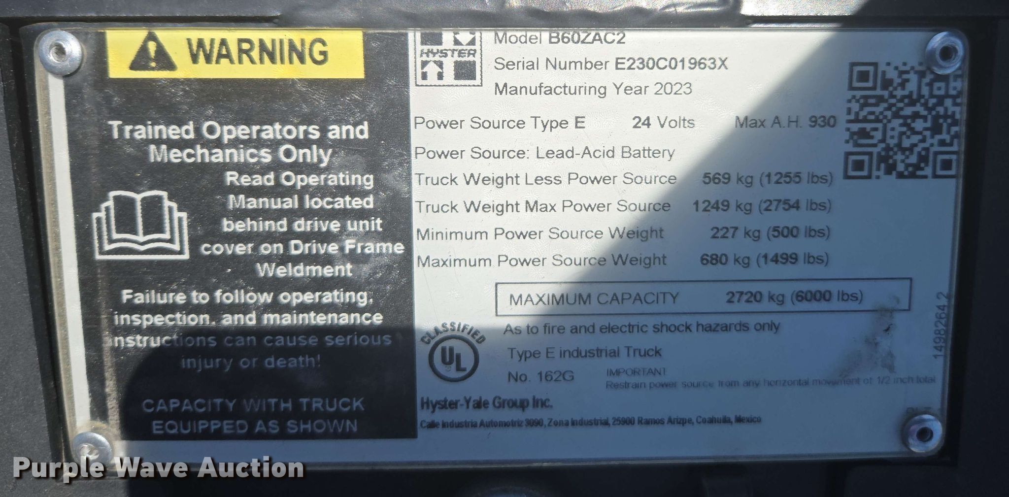 Purple Wave is selling a used Warehouse Forklift in California. This item is a 2023 Hyster B60ZAC2 pallet jack with the following: Hours: 0 on meter, Serial: E230C01963X