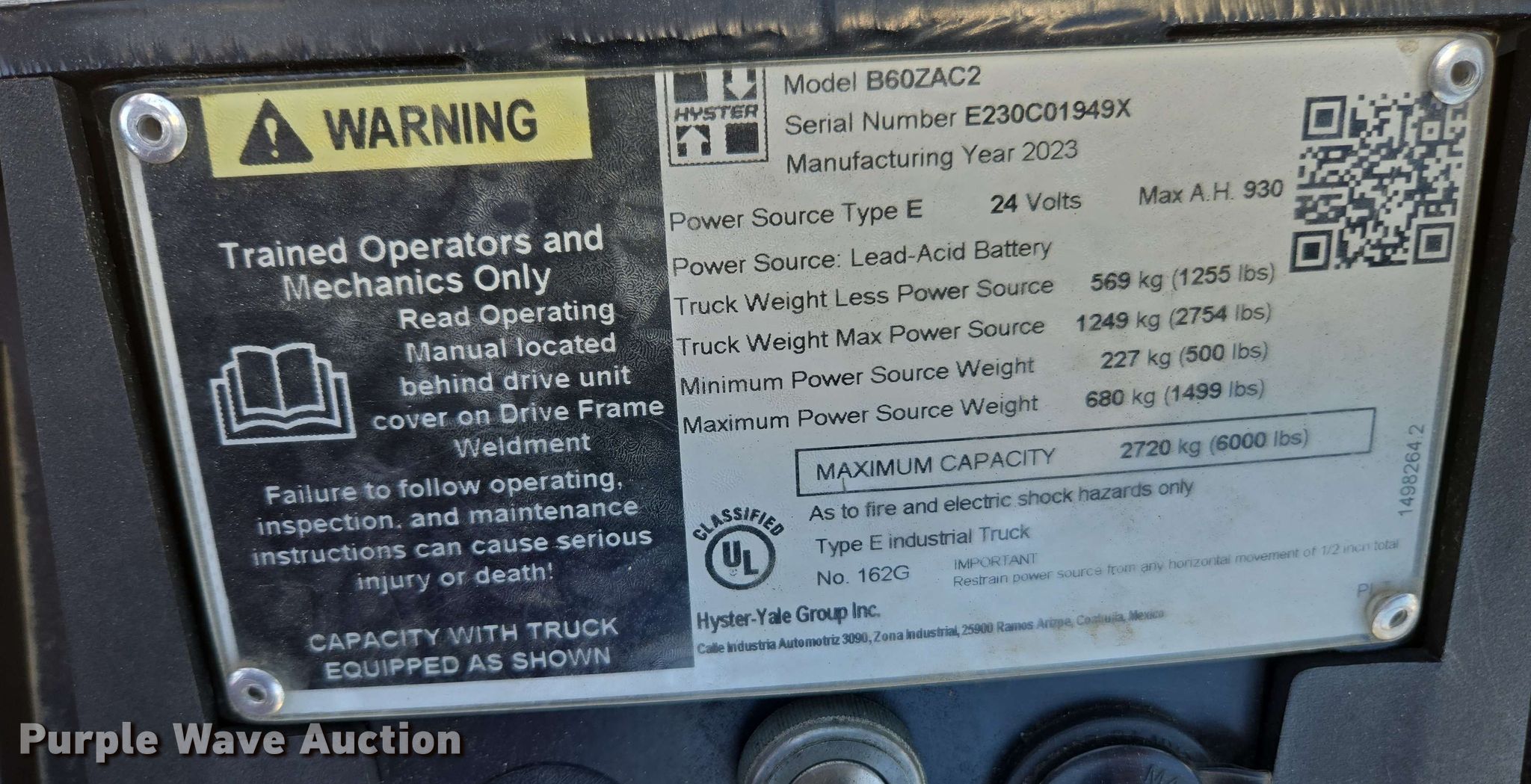 Purple Wave is selling a used Warehouse Forklift in California. This item is a 2023 Hyster B60ZAC2 pallet jack with the following: Hours: 0 on meter, Serial: E230C01949X