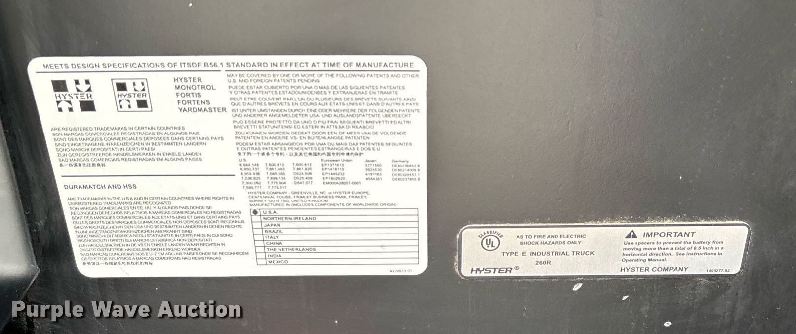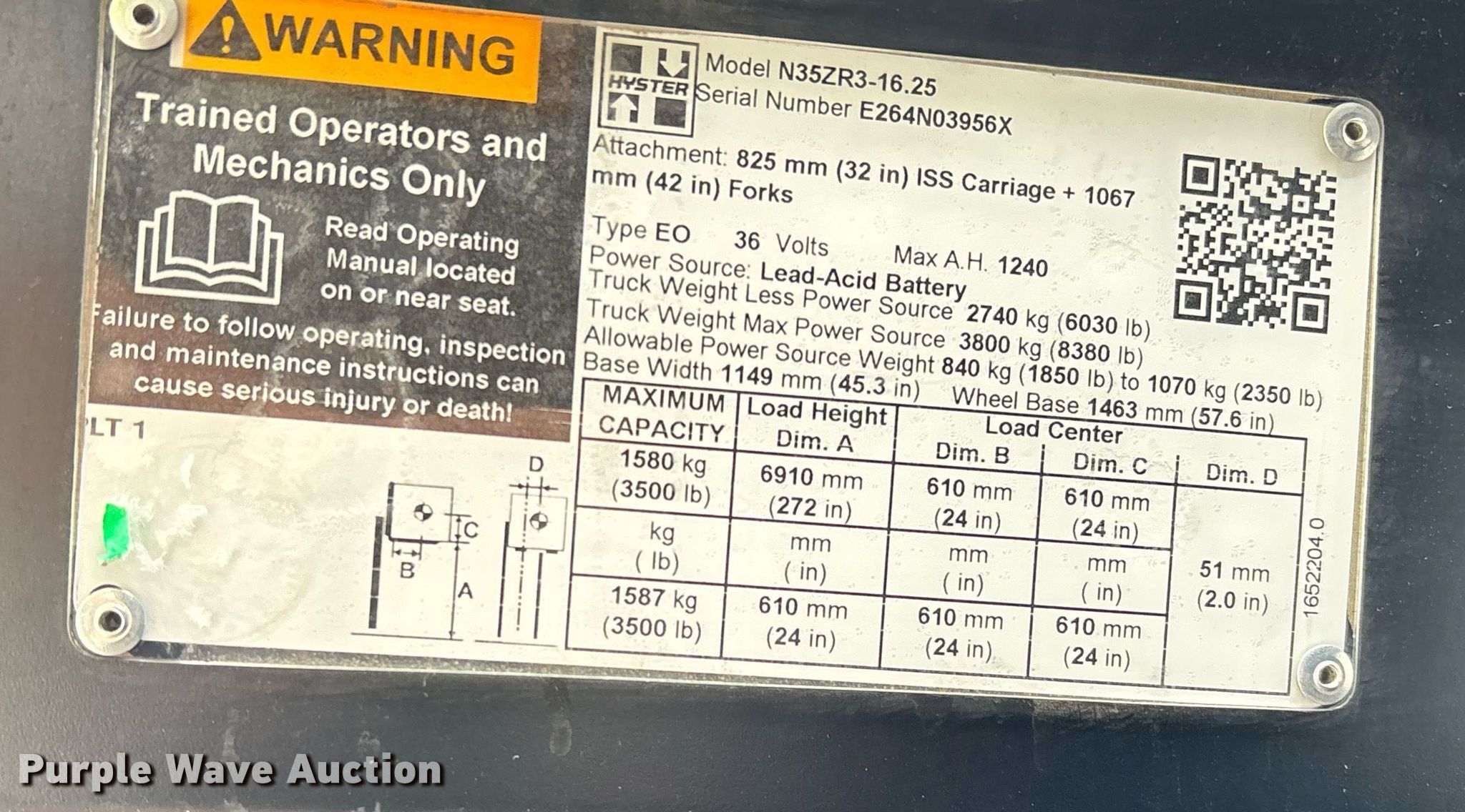 2023 Hyster N35ZR3-16.25 reach truck. Hours: 0 on meter, Serial: E264N03956X. Electric motor Volts: 36, Charger: Ecotec Access 13/36 /C, Battery: H2Go 18-125LM-13. Transmission Electric drive. Operators station OROPS. Features Maximum lift capacity: 3,500 lbs, Maximum lift height: 272", Collapsed mast height: 119", Mast stages: 3, Side shift, Reach / retract, Fork length: 42". Tires Solid. Notes Unused. Prologis. Fontana, CA 92335