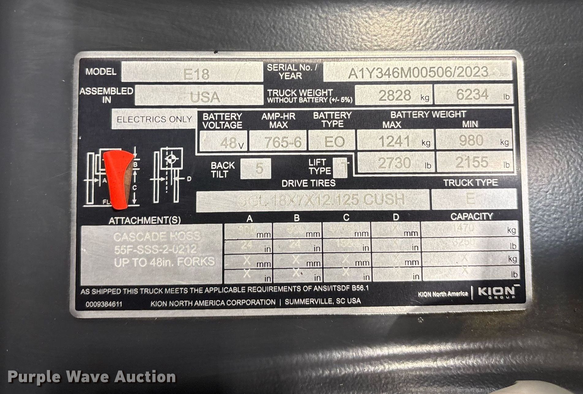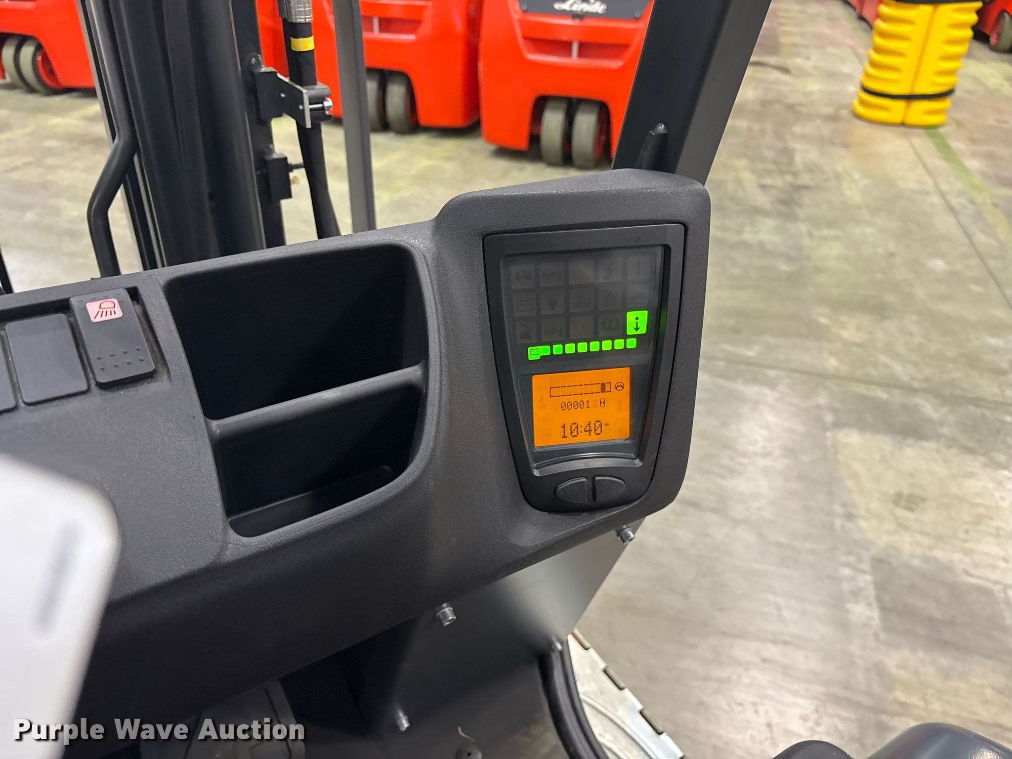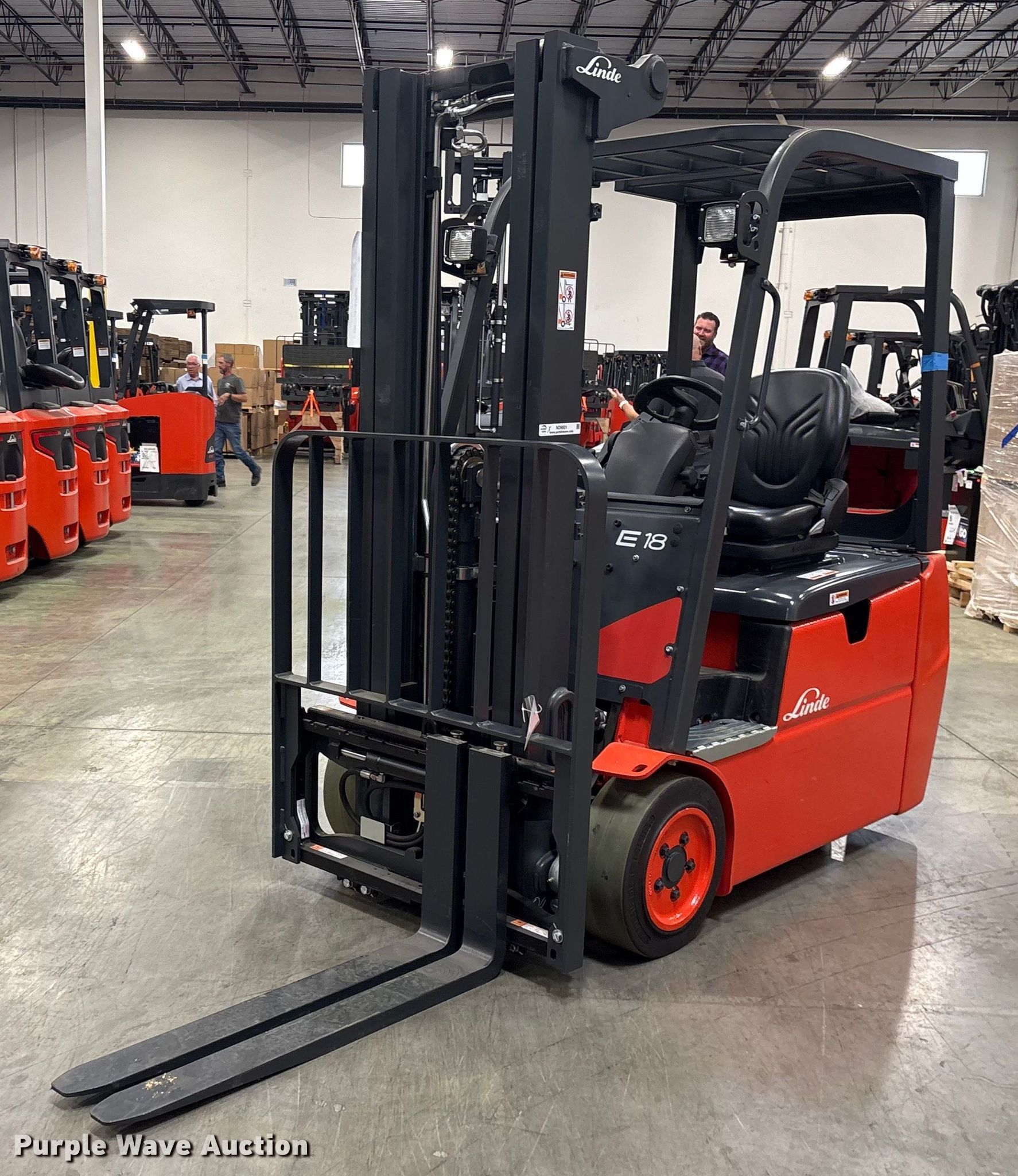 Purple Wave is selling a used Warehouse Forklift in Texas. This item is a 2023 Linde E18 forklift with the following: Hours: 1 on meter, Serial: A1Y346M00506