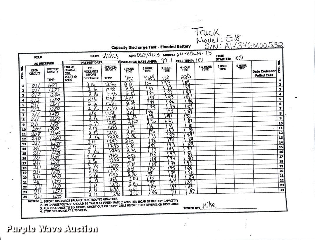 2023 Linde E18 forklift. Hours: 2 on meter, Serial: A1Y346M00532. Electric Motor Volts: 48, Phase: Three, Charger: Viking Ferro Phase: Three, Battery: Viking Intel Amp hour: 595. Transmission Electric drive. Operators station OROPS. Features Maximum lift capacity: 3,250 lbs, Maximum lift height: 188", Collapsed mast height: 84", Mast stages: 3, Side shift, Mast tilt. Tires Front: 18x7x12 1/8, Rear: 15x5x11 1/4, Solid. Notes 3 year or 6,000 hour warranty valid after predelivery inspection by licensed Linde dealer is complete Fees apply. Prologis - Linde Warranty Available. Lewisville, TX 75067