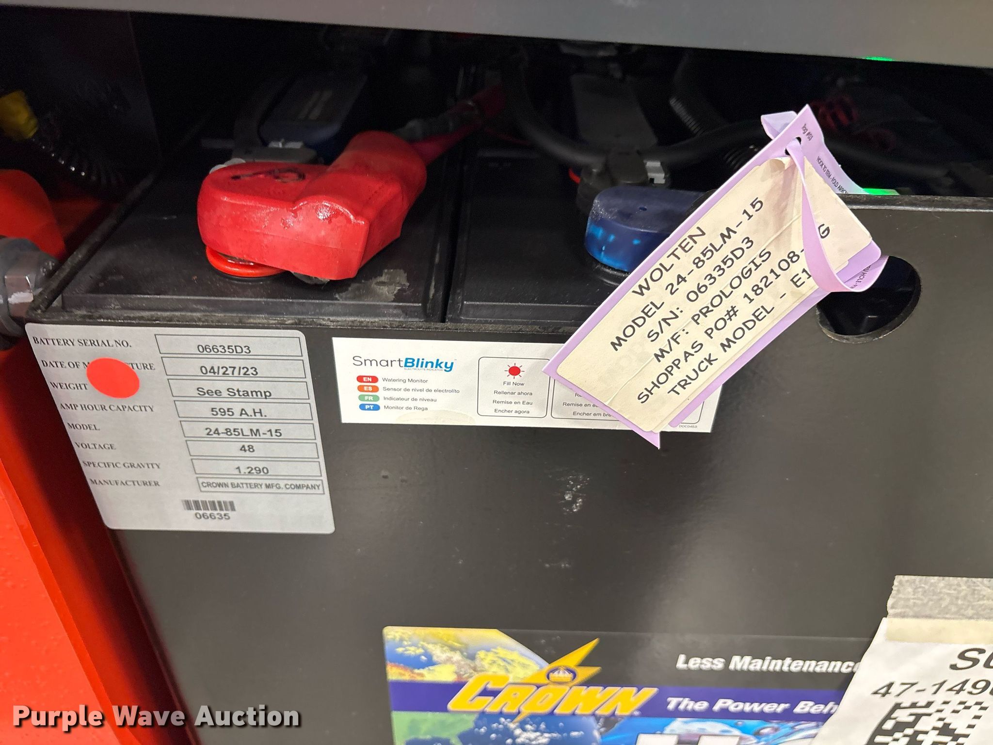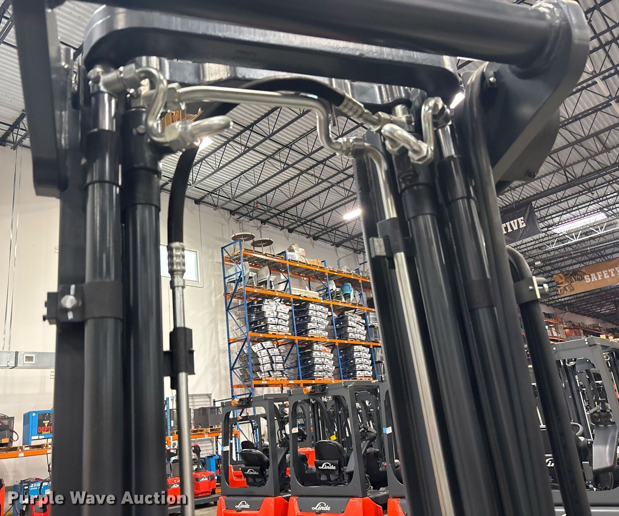 2023 Linde E18 forklift. Hours: 1 on meter, Serial: A1Y346M00500. Electric Motor Volts: 48, Phase: Three, Charger: Viking Ferro Phase: Three, Battery: Viking Intel Amp hour: 595. Transmission Electric drive. Operators station OROPS. Features Maximum lift capacity: 3,250 lbs, Maximum lift height: 188", Collapsed mast height: 84", Mast stages: 3, Side shift, Mast tilt, Fork length: 42". Tires Front: 18x7x12 1/8, Rear: 15x5x11 1/4, Solid. Notes 3 year or 6,000 hour warranty valid after predelivery inspection by licensed Linde dealer is complete Fees apply. Prologis - Linde Warranty Available. Lewisville, TX 75067