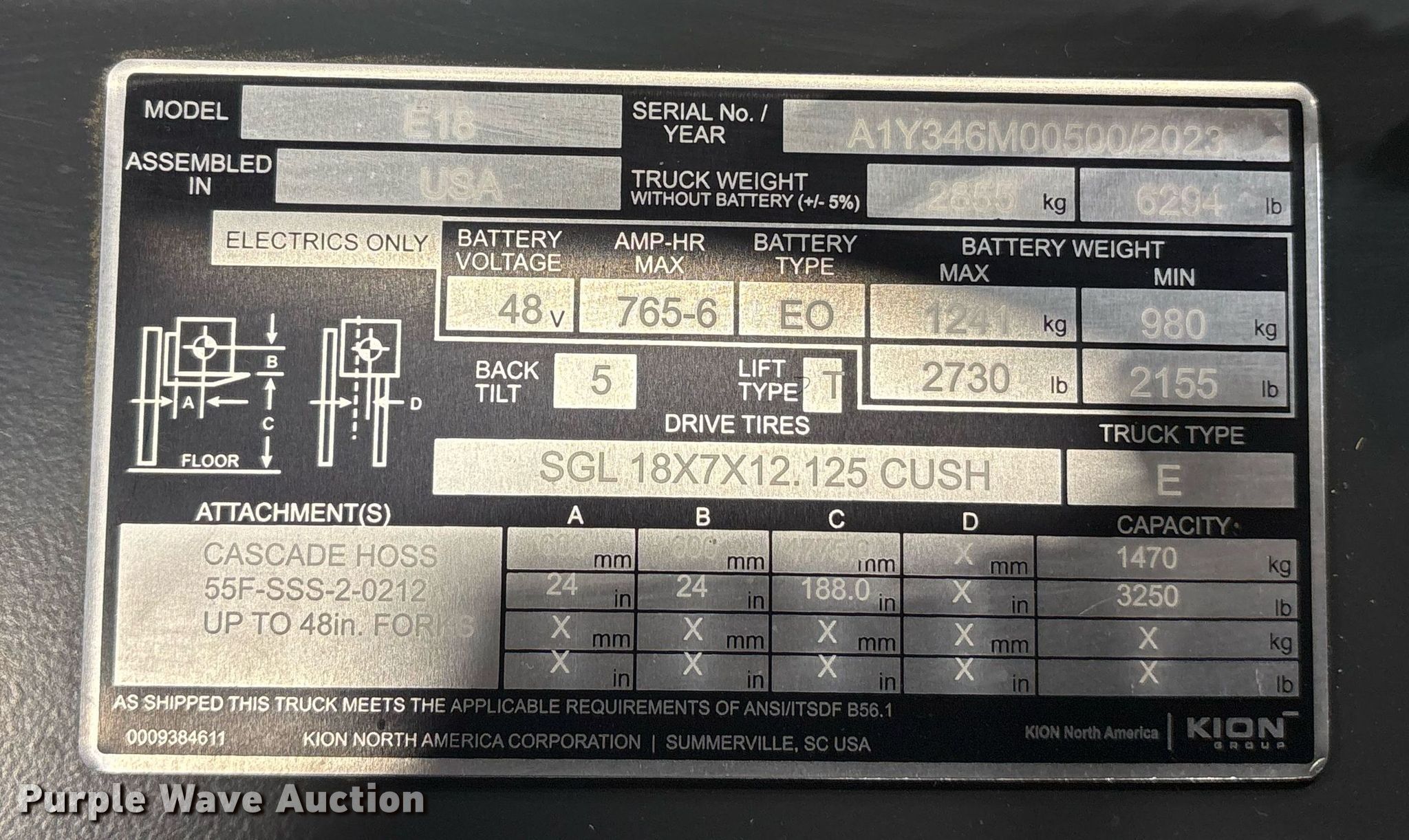 Purple Wave is selling a used Warehouse Forklift in Texas. This item is a 2023 Linde E18 forklift with the following: Hours: 1 on meter, Serial: A1Y346M00500