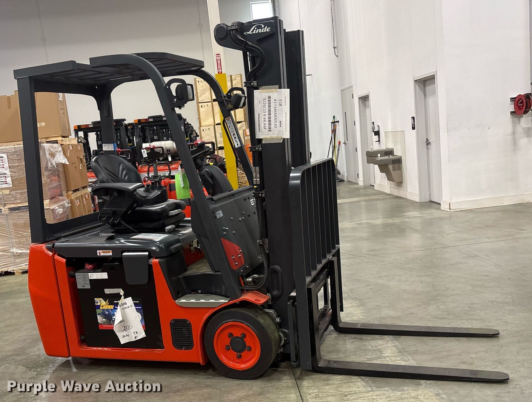 Purple Wave is selling a used Warehouse Forklift in Texas. This item is a 2023 Linde E18 forklift with the following: Hours: 1 on meter, Serial: A1Y346M00530