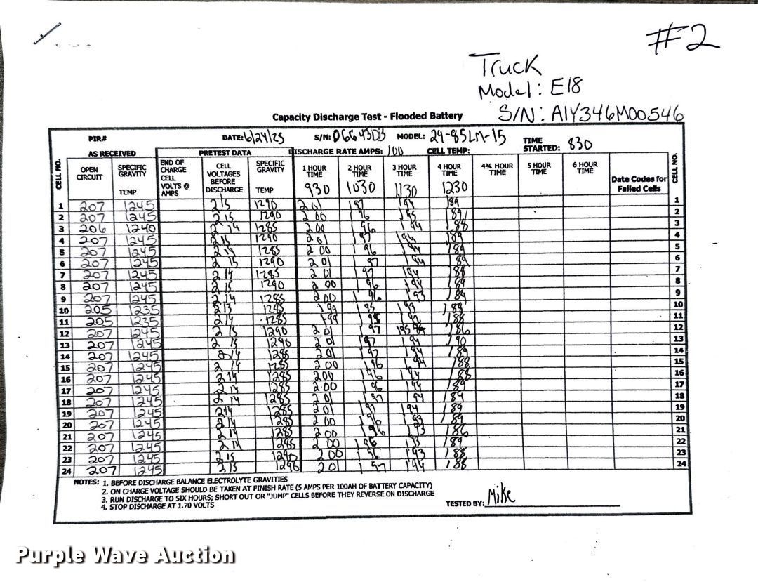 2023 Linde E18 forklift. Hours: 2 on meter, Serial: A1Y346M00546. Electric Motor Volts: 48, Phase: Three, Charger: Viking Ferro Phase: Three, Battery: Viking Intel Amp hour: 595. Transmission Electric drive. Operators station OROPS. Features Maximum lift capacity: 3,250 lbs, Maximum lift height: 188", Collapsed mast height: 84", Mast stages: 3, Side shift, Mast tilt, Fork length: 42". Tires Front: 18x7x12 1/8, Rear: 15x5x11 1/4, Solid. Notes 3 year or 6,000 hour warranty valid after predelivery inspection by licensed Linde dealer is complete Fees apply. Prologis - Linde Warranty Available. Lewisville, TX 75067