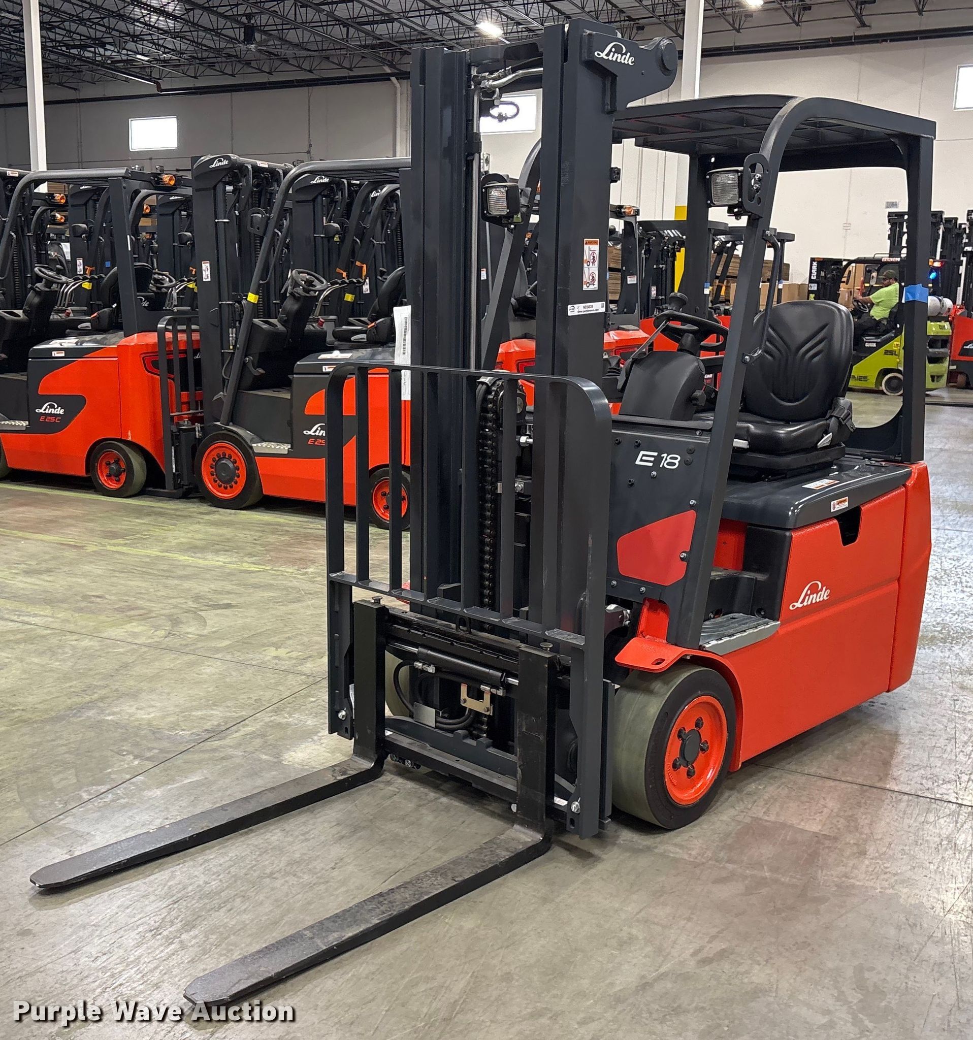 This 2023 Linde E18 forklift will sell to the highest bidder regardless of price.