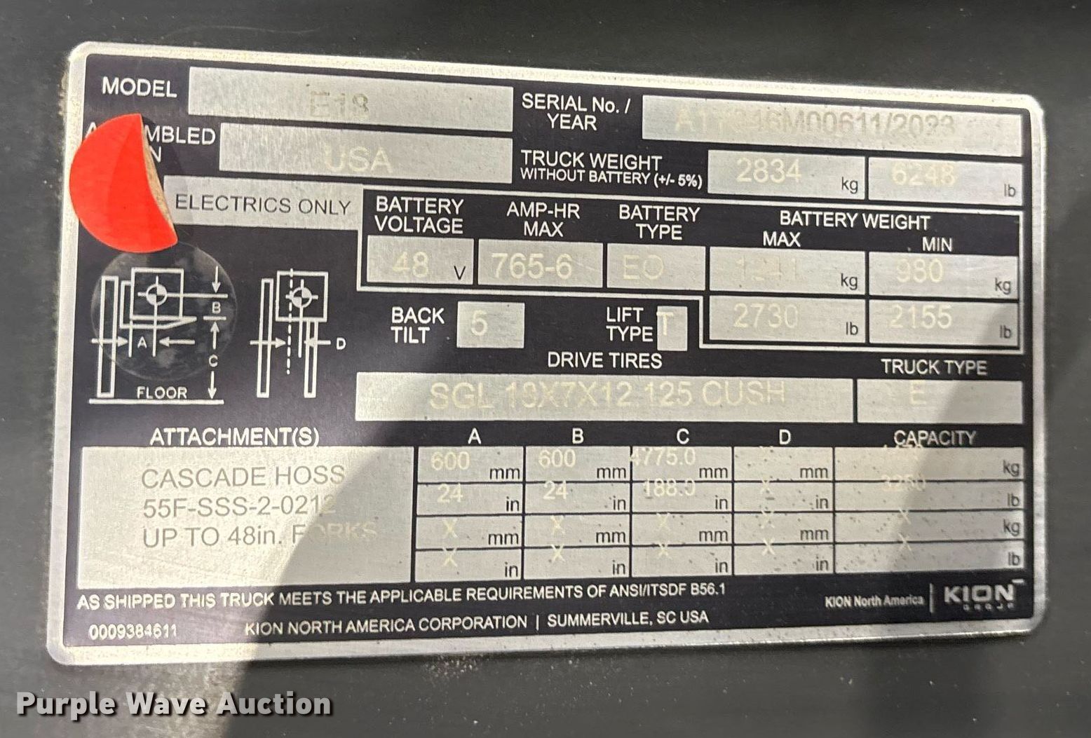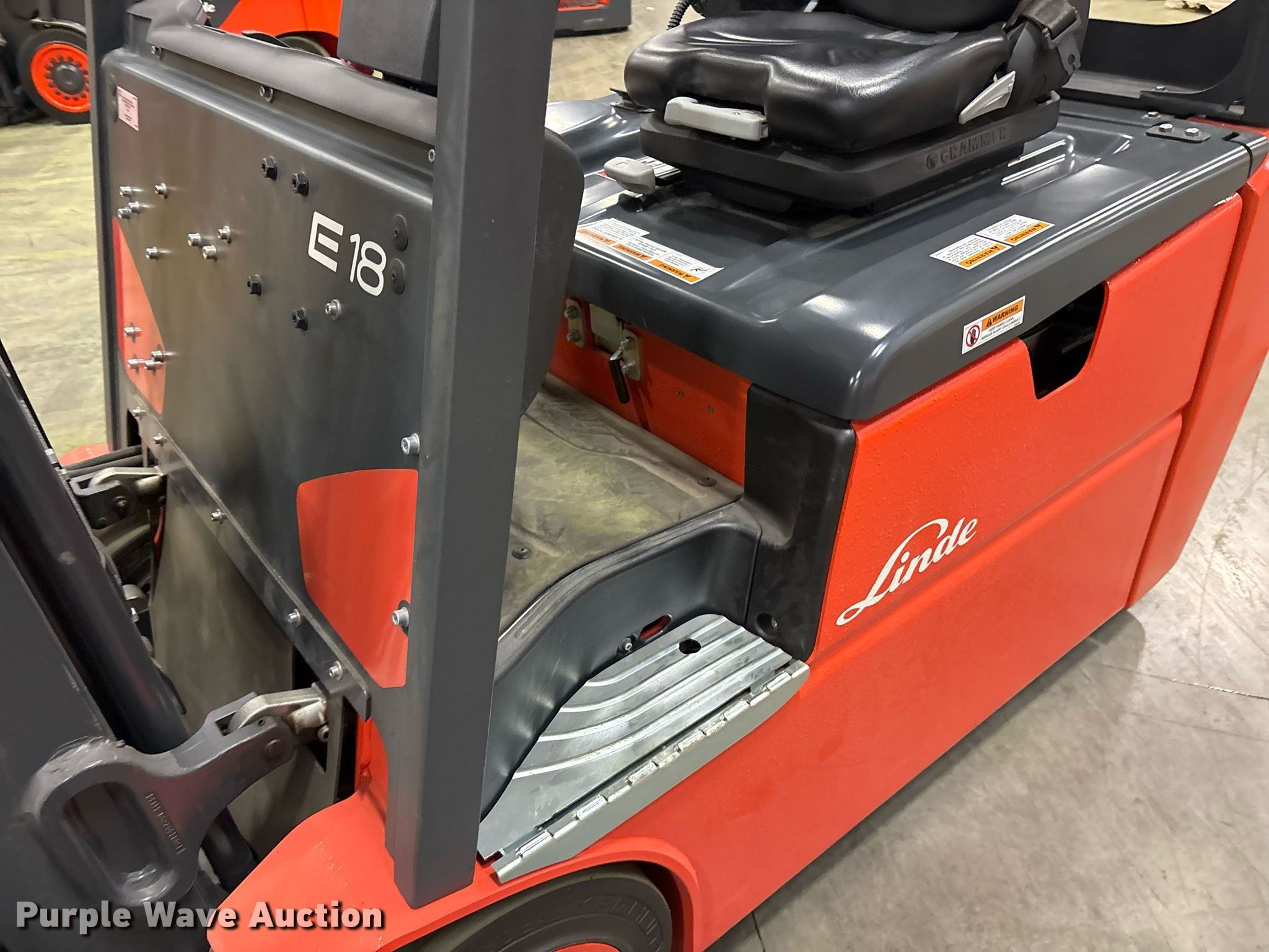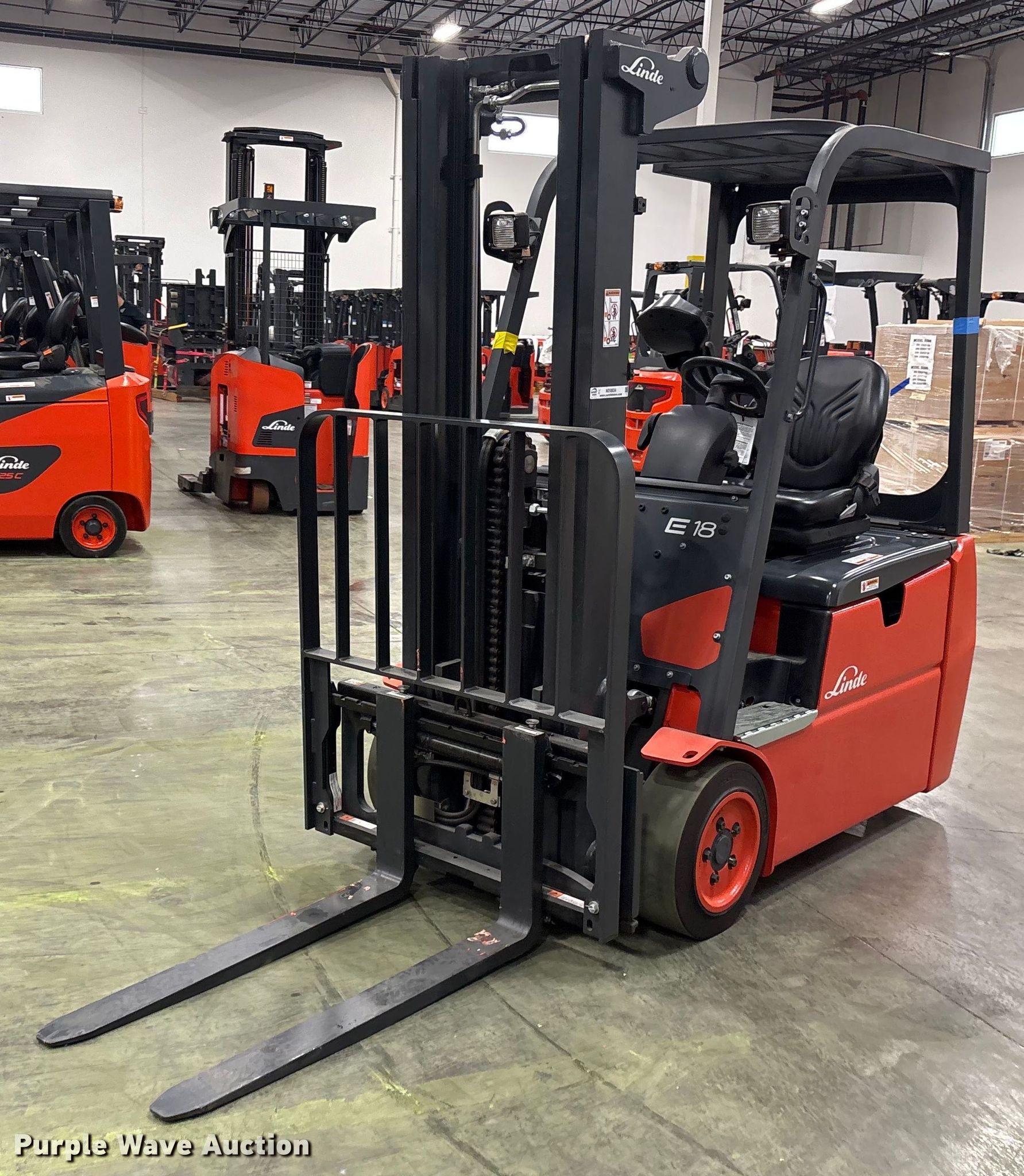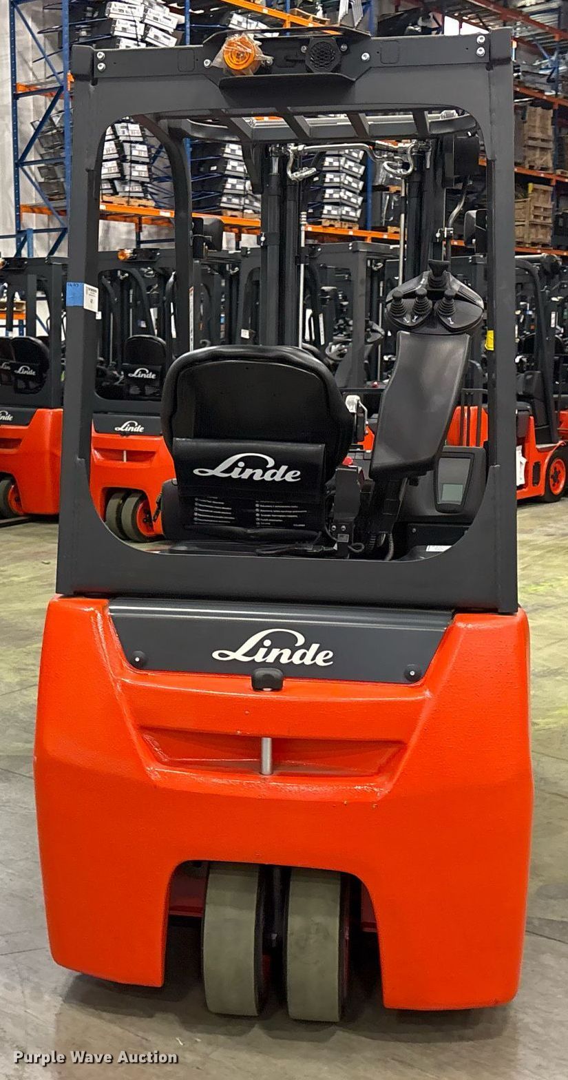 Purple Wave is selling a used Warehouse Forklift in Texas. This item is a 2023 Linde E18 forklift with the following: Hours: 2 on meter, Serial: A1Y346M00611