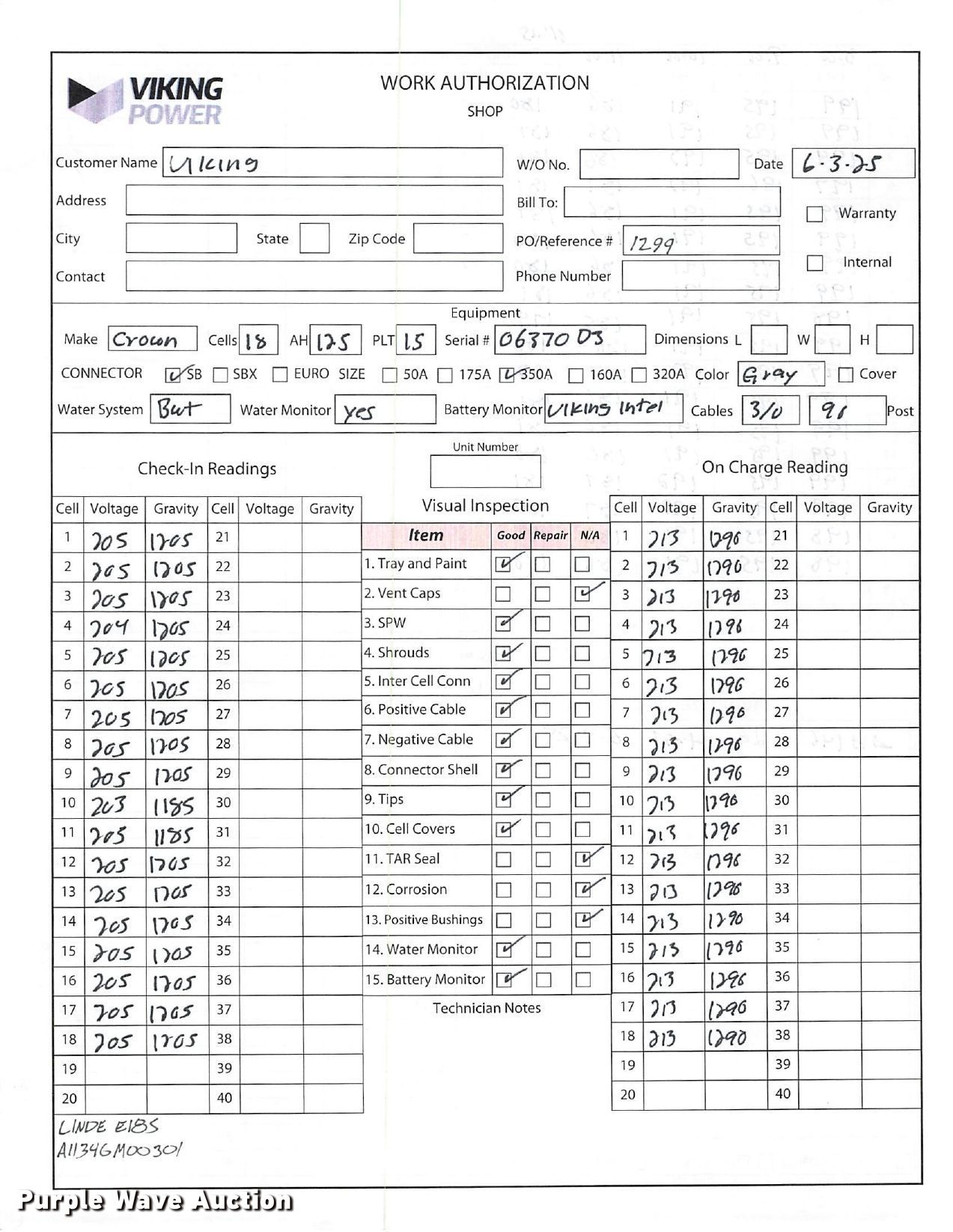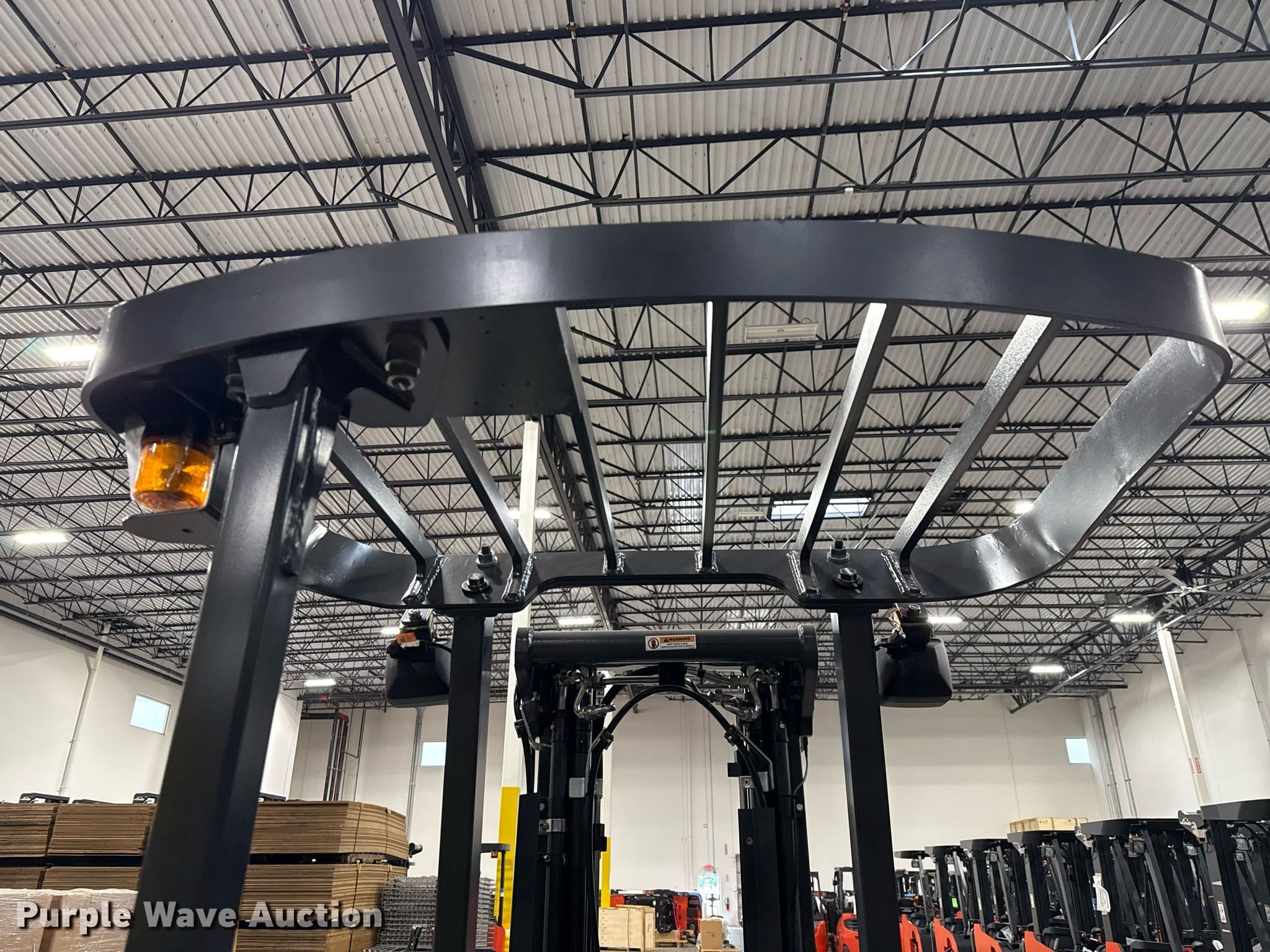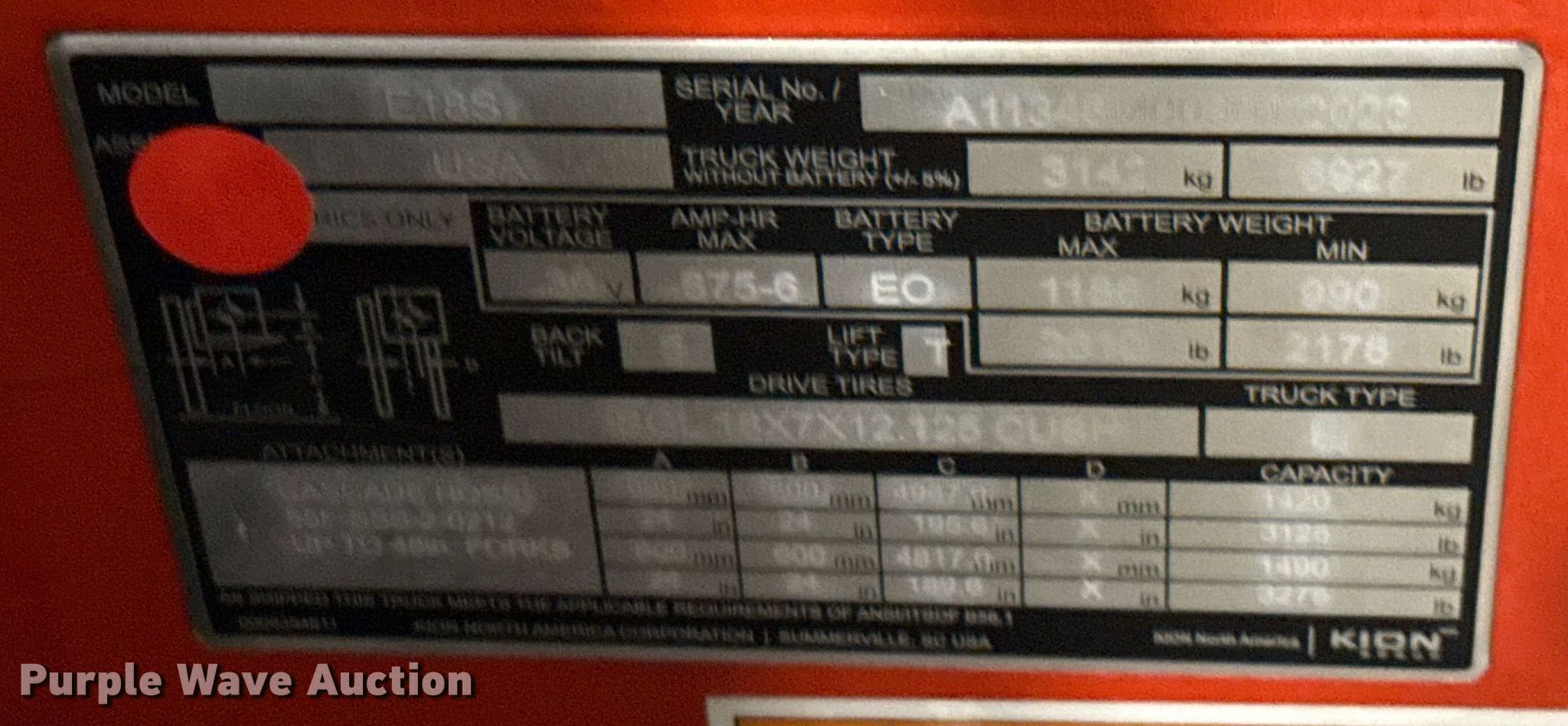 2023 Linde E18S forklift. Hours: 4 on meter, Serial: A11346M00301. Electric Motor Volts: 36, Charger: Viking Ferro Three phase, Battery: Crown 18-125LM-15 Serial 06370D3, 875AH, Water kit. Transmission Electric drive. Operators station OROPS. Features Maximum lift capacity: 3,275 lbs, Maximum lift height: 189", Collapsed mast height: 88", Mast stages: 3, Side shift, Mast tilt, Fork length: 42". Tires Front: 18x7x12 1/8, Rear: 10x5x6.5, Solid. Notes 3 year or 6,000 hour warranty valid after predelivery inspection by licensed Linde dealer is complete. Fees apply. Prologis - Linde Warranty Available. Lewisville, TX 75067