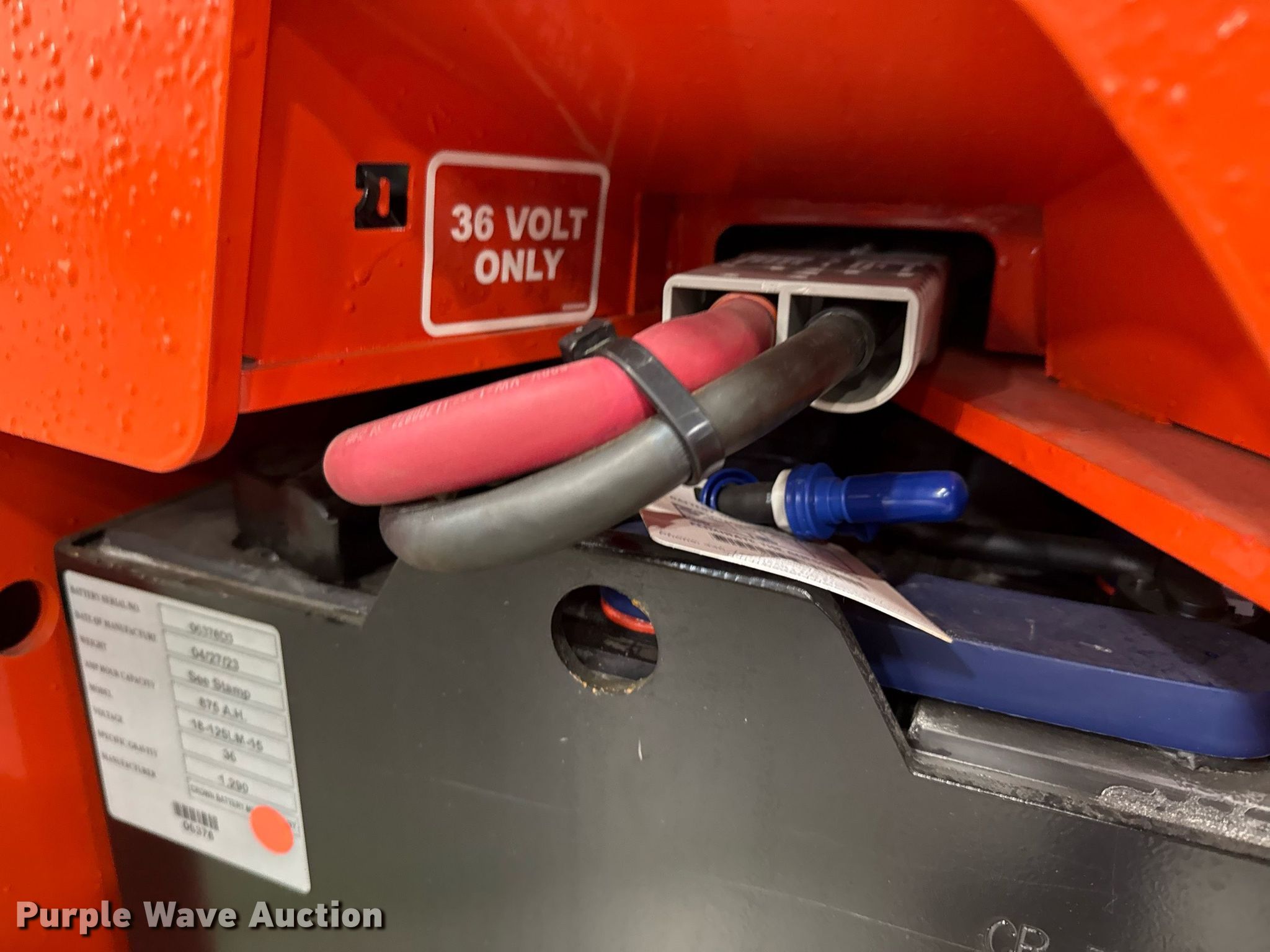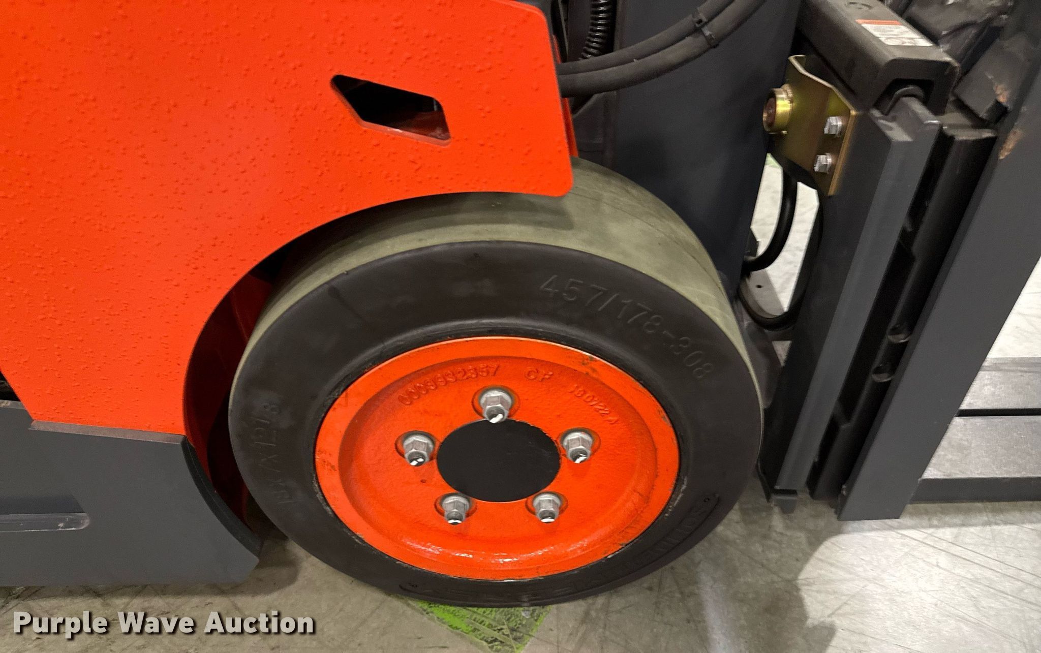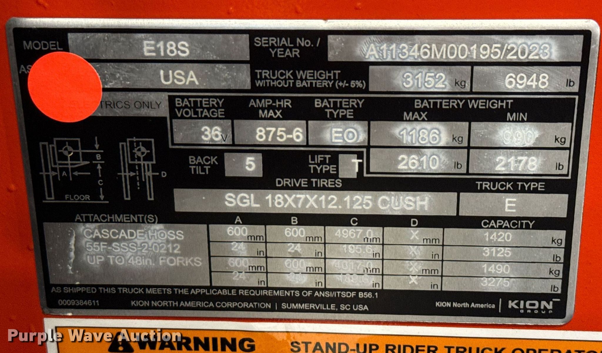 2023 Linde E18S forklift. Hours: 6 on meter, Serial: A11346M00195. Electric Motor Volts: 36, Charger: Viking Ferro Three phase, Battery: Crown 18-125LM-15 Serial: 06378D3, 875AH, Water kit. Transmission Electric drive. Operators station OROPS. Features Maximum lift capacity: 3,275 lbs, Maximum lift height: 189", Collapsed mast height: 88", Mast stages: 3, Side shift, Mast tilt, Fork length: 42". Tires Front: 18x7x12 1/8, Rear: 10x5x6.5, Solid. Notes 3 year or 6,000 hour warranty valid after predelivery inspection by licensed Linde dealer is complete. Fees apply. Prologis - Linde Warranty Available. Lewisville, TX 75067
