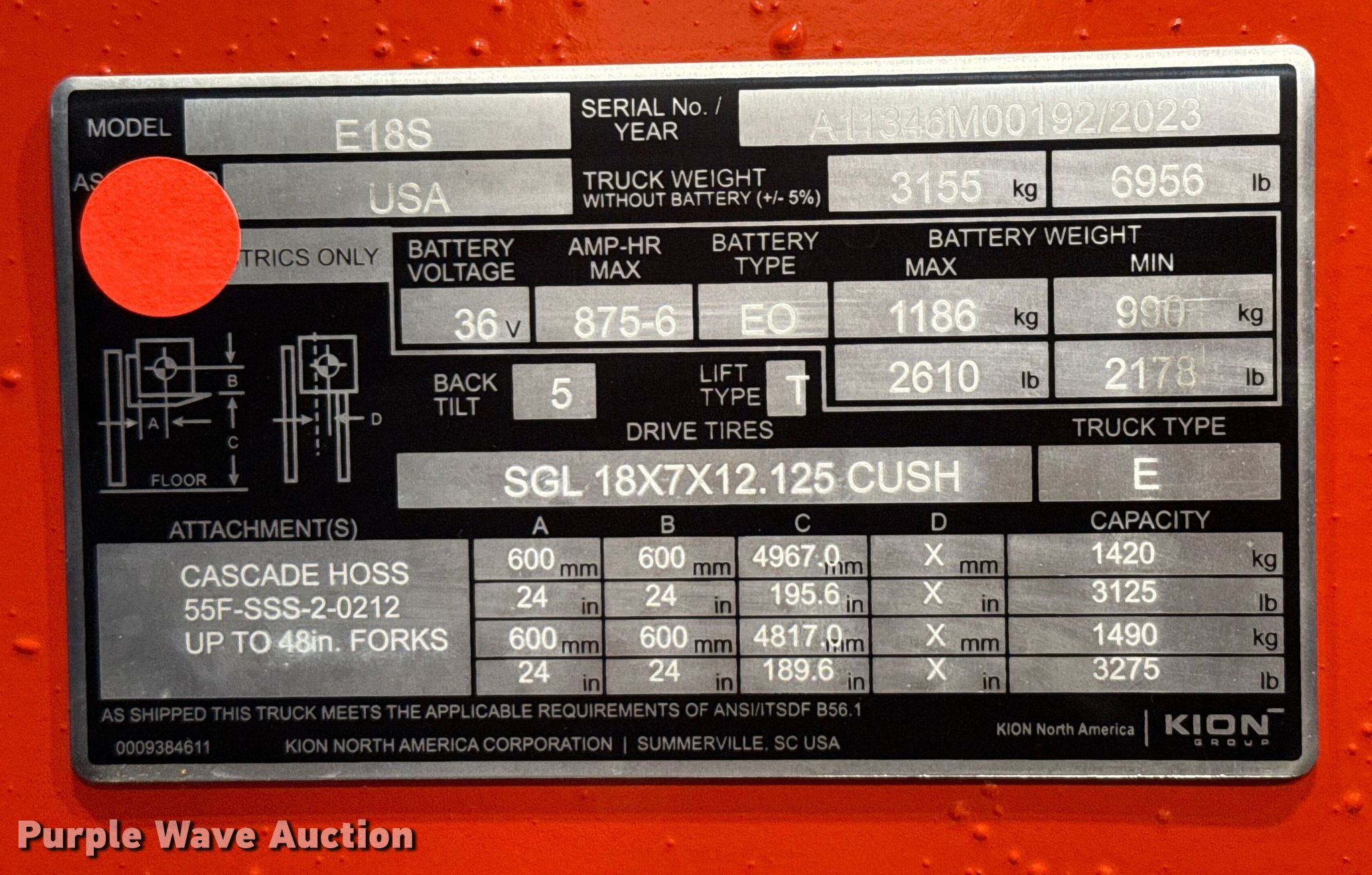 Purple Wave is selling a used Warehouse Forklift in Texas. This item is a 2023 Linde E18S forklift with the following: Hours: 4 on meter, Serial: A11346M00192
