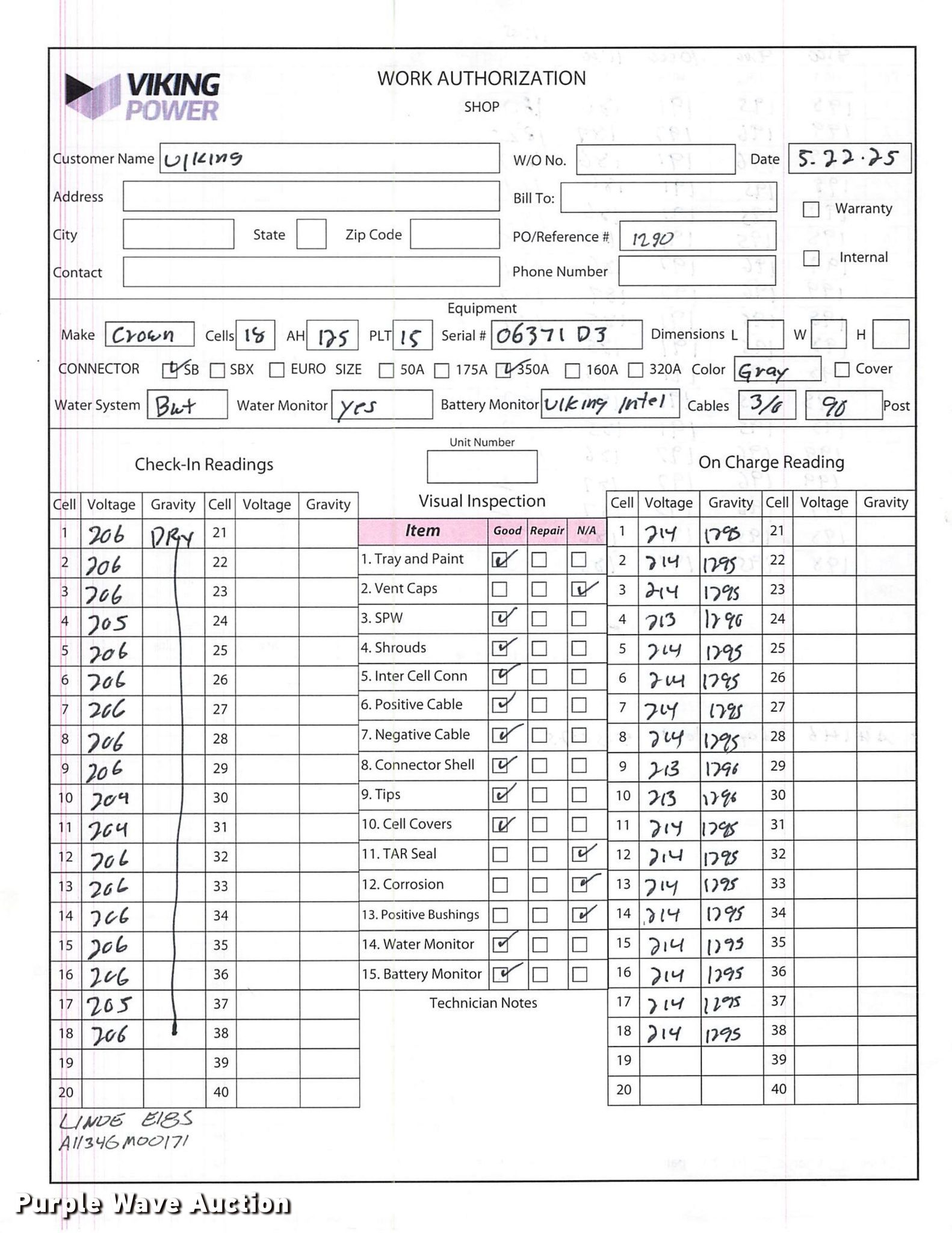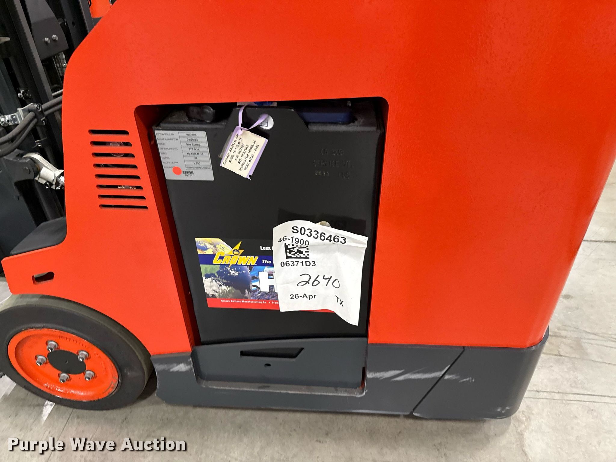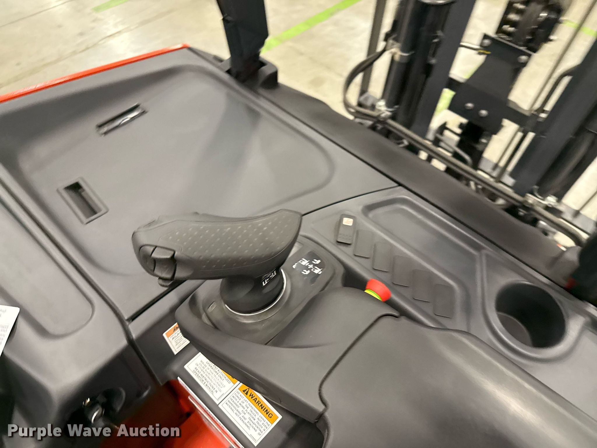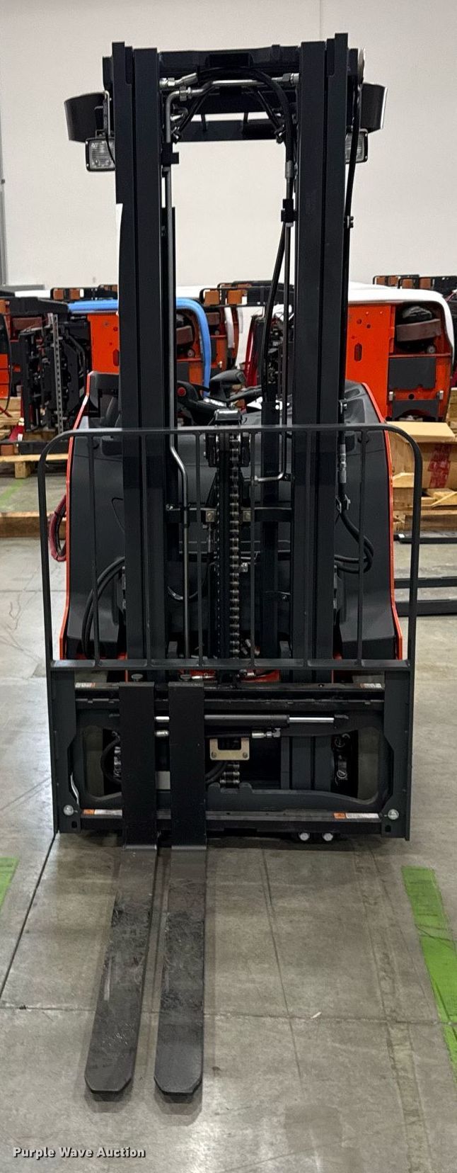 2023 Linde E18S forklift. Hours: 3 on meter, Serial: A11346M00171. Electric Motor Volts: 36, Charger: Viking Ferro Three phase, Battery: Crown 18-125LM-15 Serial 06371D3, 875AH, Water kit. Transmission Electric drive. Operators station OROPS. Features Maximum lift capacity: 3,275 lbs, Maximum lift height: 189", Collapsed mast height: 88", Mast stages: 3, Side shift, Mast tilt, Fork length: 42". Tires Front: 18x7x12 1/8, Rear: 10x5x6.5, Solid. Notes 3 year or 6,000 hour warranty valid after predelivery inspection by licensed Linde dealer is complete. Fees apply. Prologis - Linde Warranty Available. Lewisville, TX 75067