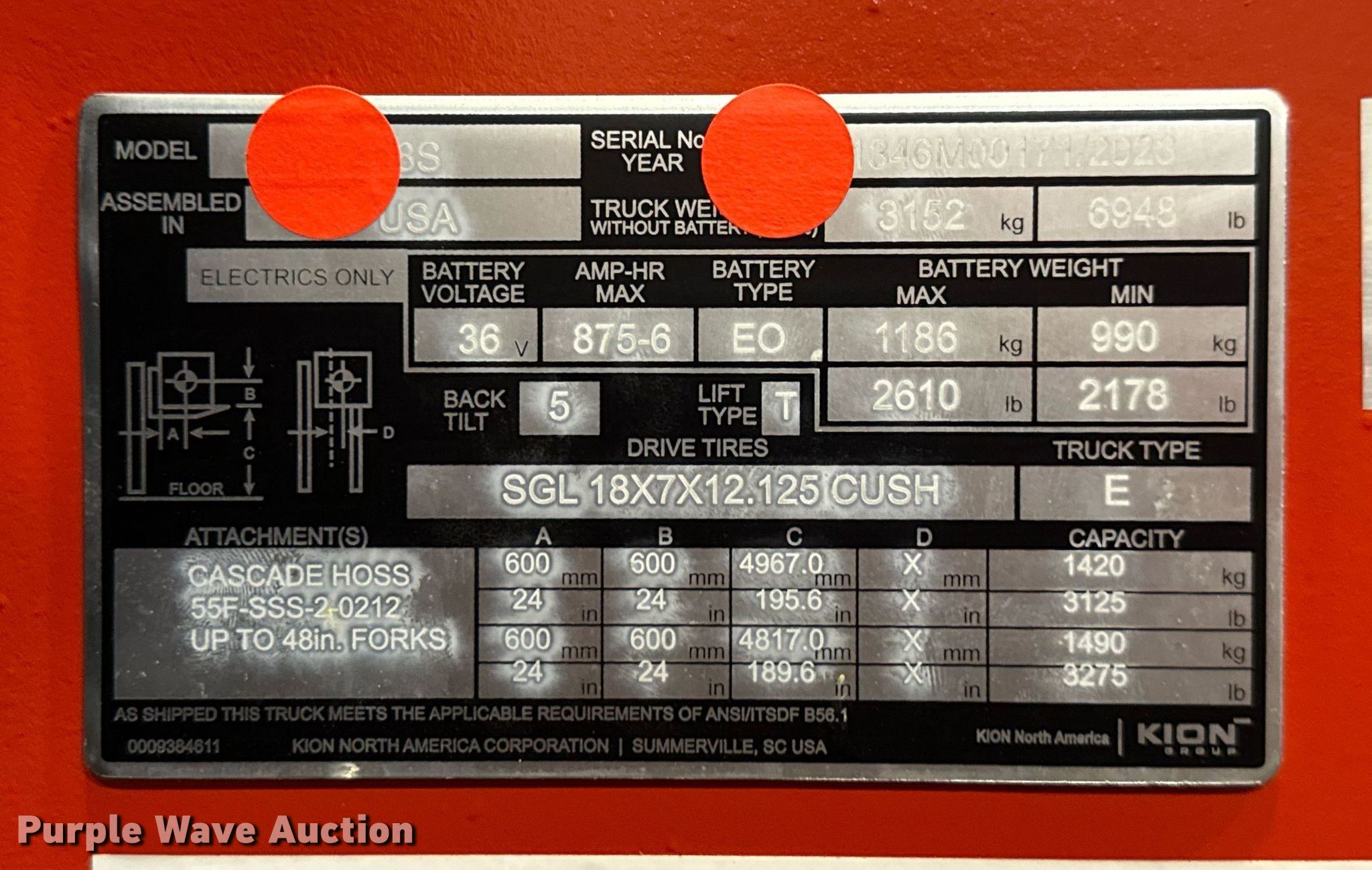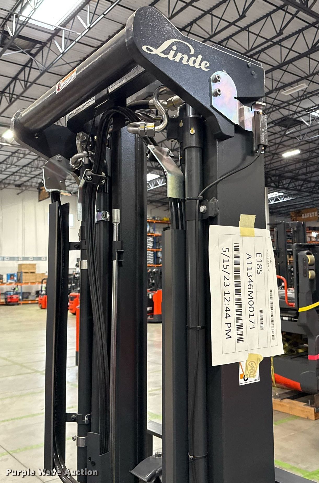 Purple Wave is selling a used Warehouse Forklift in Texas. This item is a 2023 Linde E18S forklift with the following: Hours: 3 on meter, Serial: A11346M00171