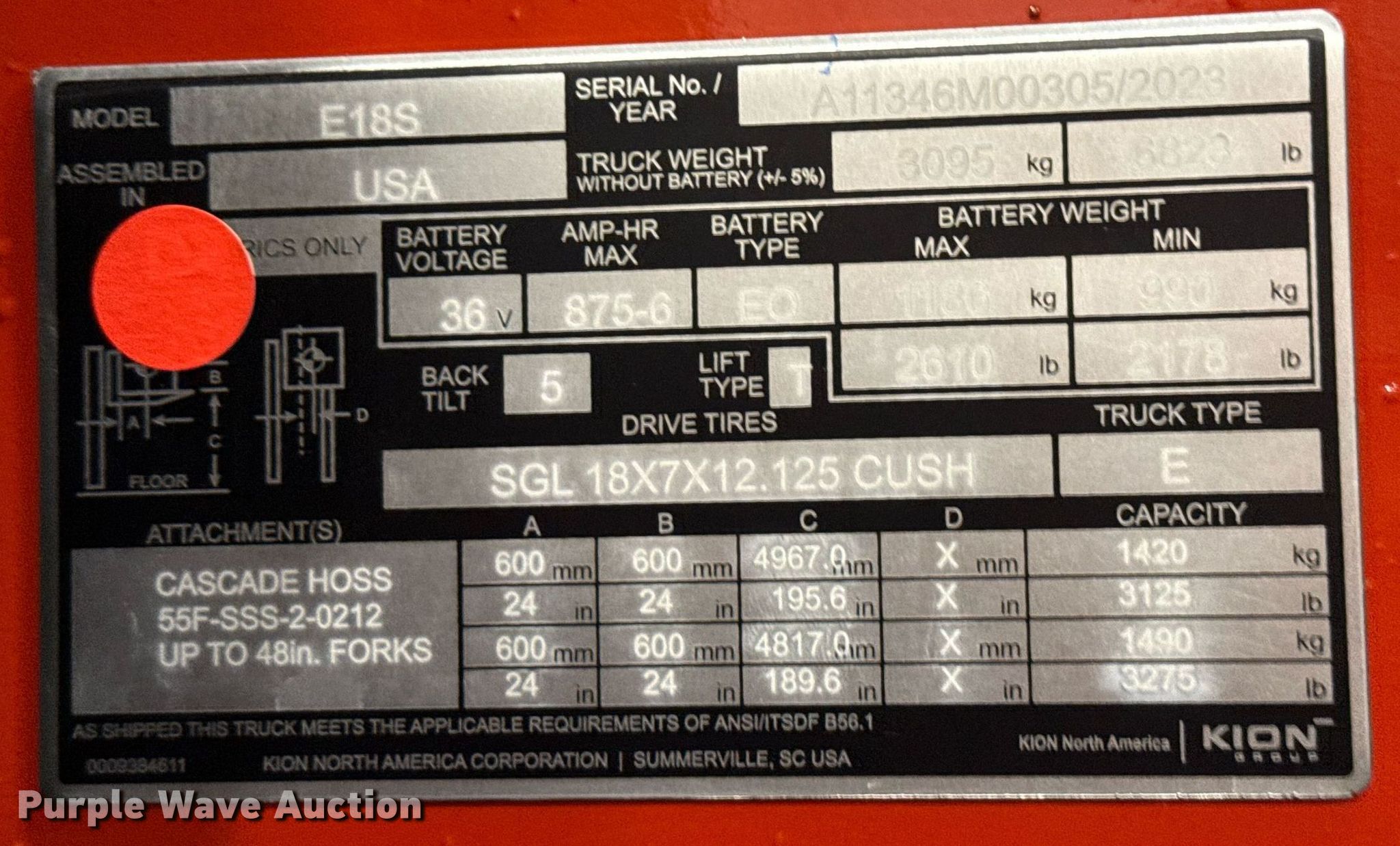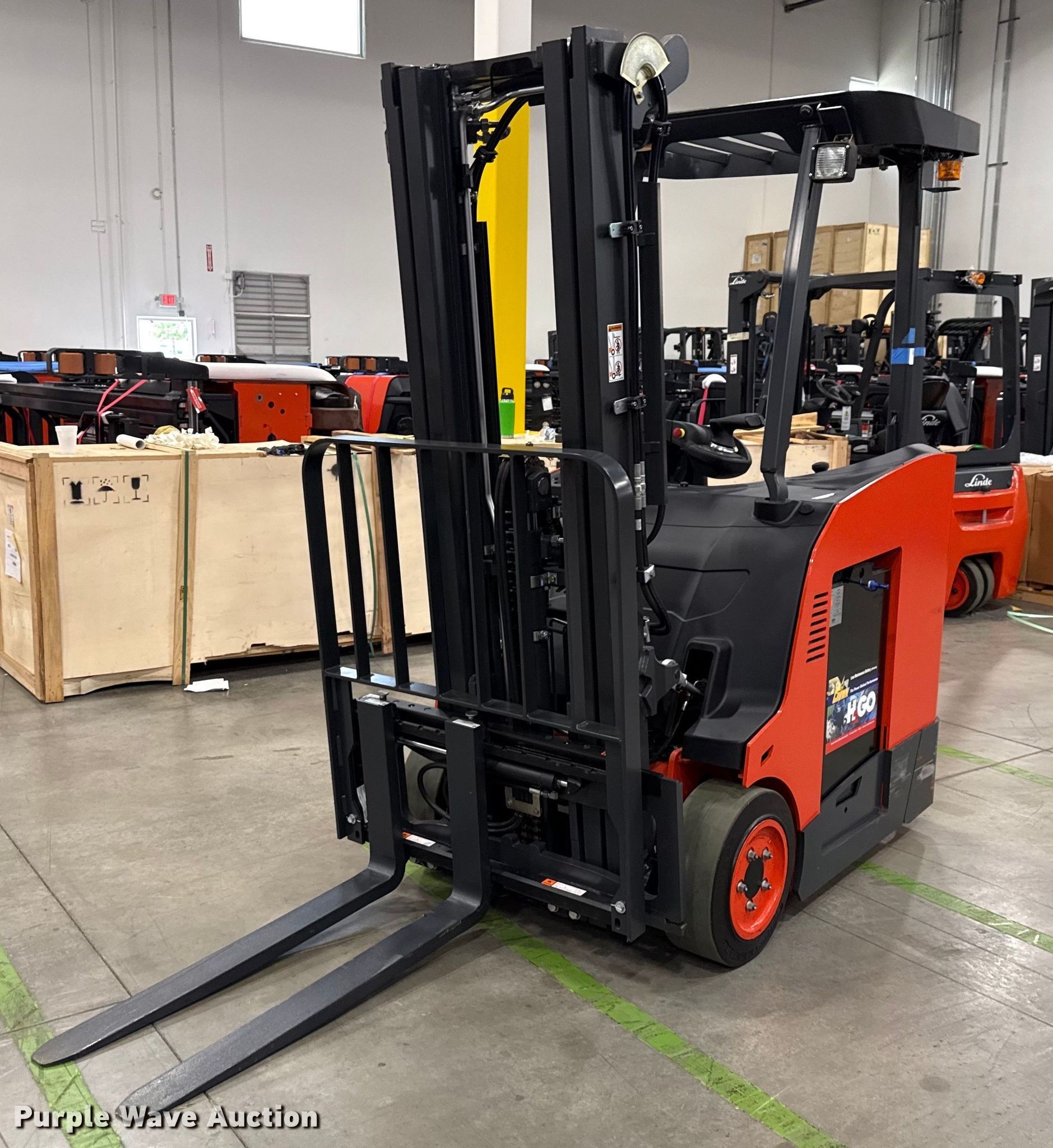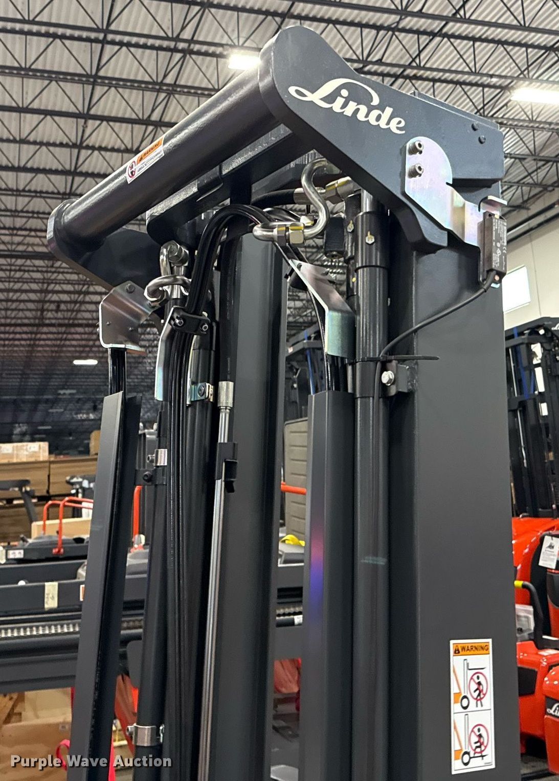 Purple Wave is selling a used Warehouse Forklift in Texas. This item is a 2023 Linde E18S forklift with the following: Hours: 5 on meter, Serial: A11346M00305