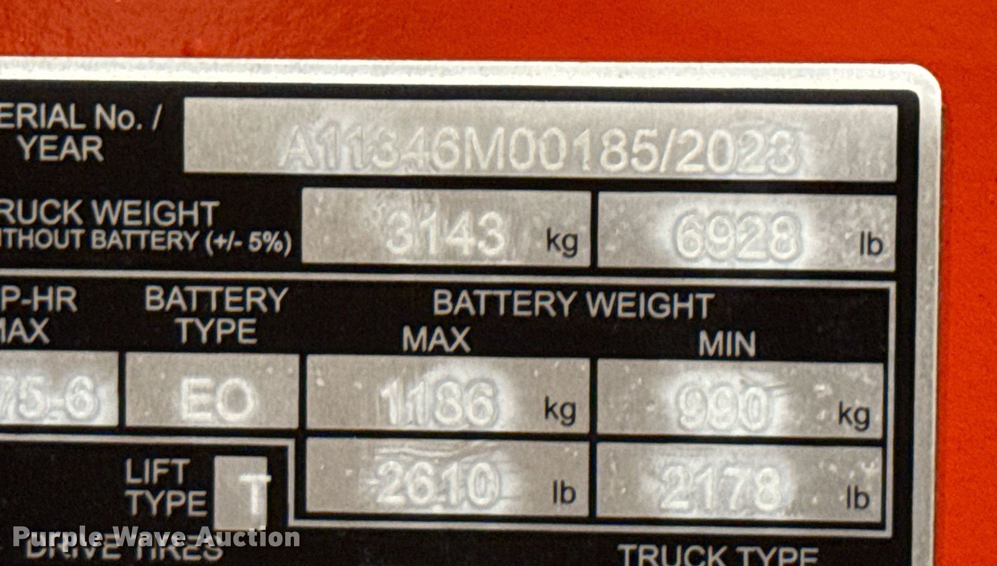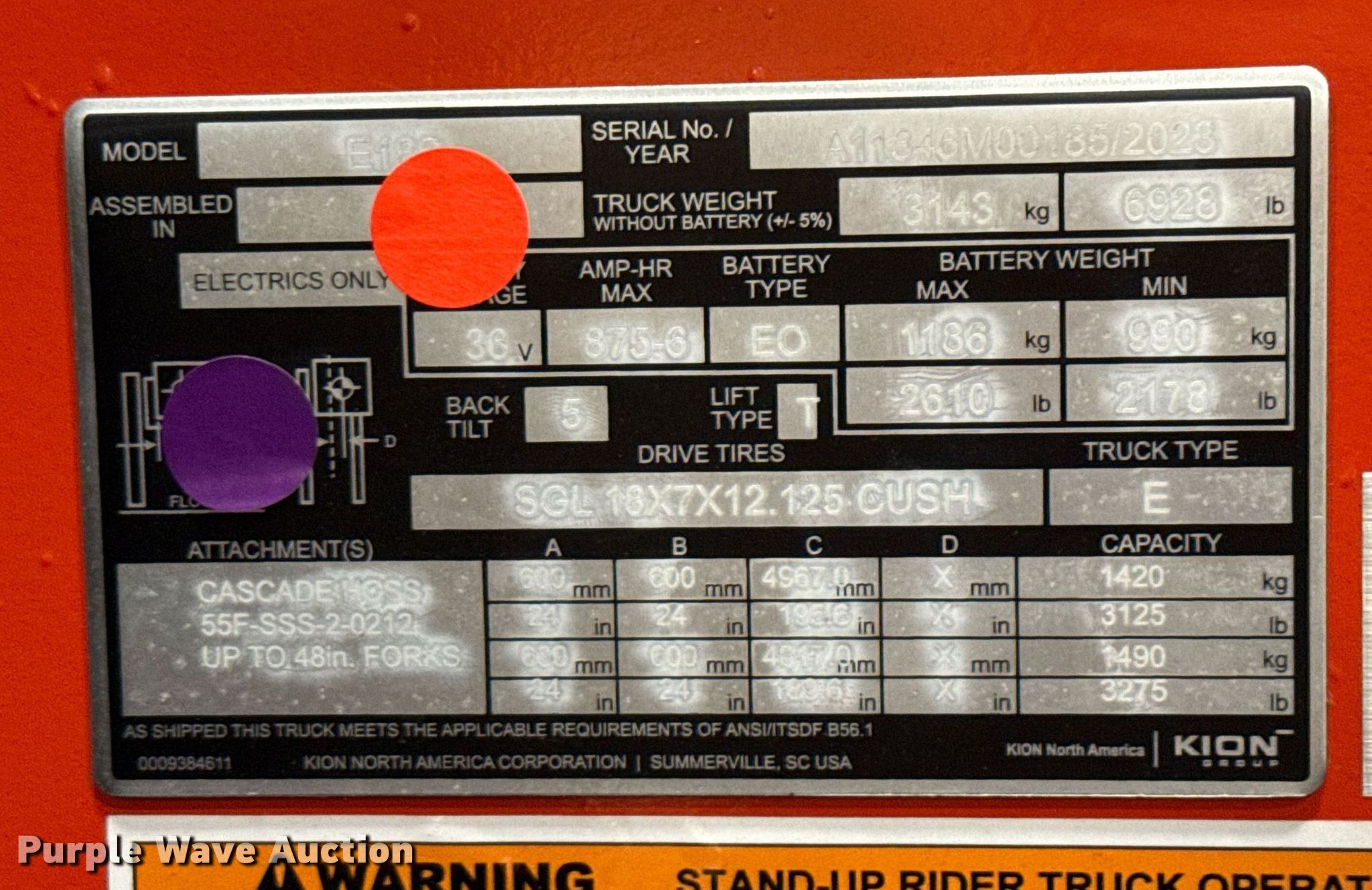 Purple Wave is selling a used Warehouse Forklift in Texas. This item is a 2023 Linde E18S forklift with the following: Hours: 2 on meter, Serial: A11346M00185