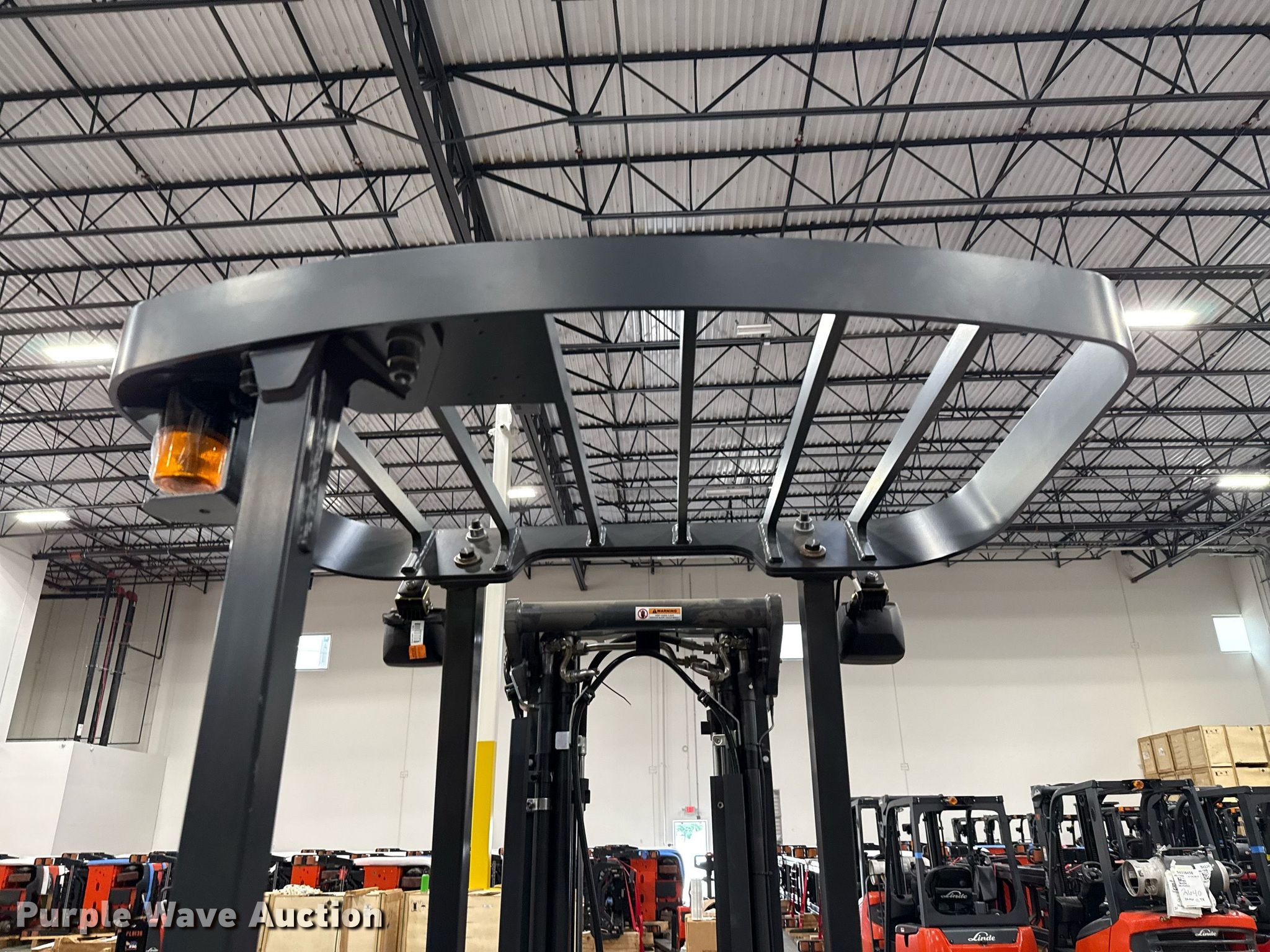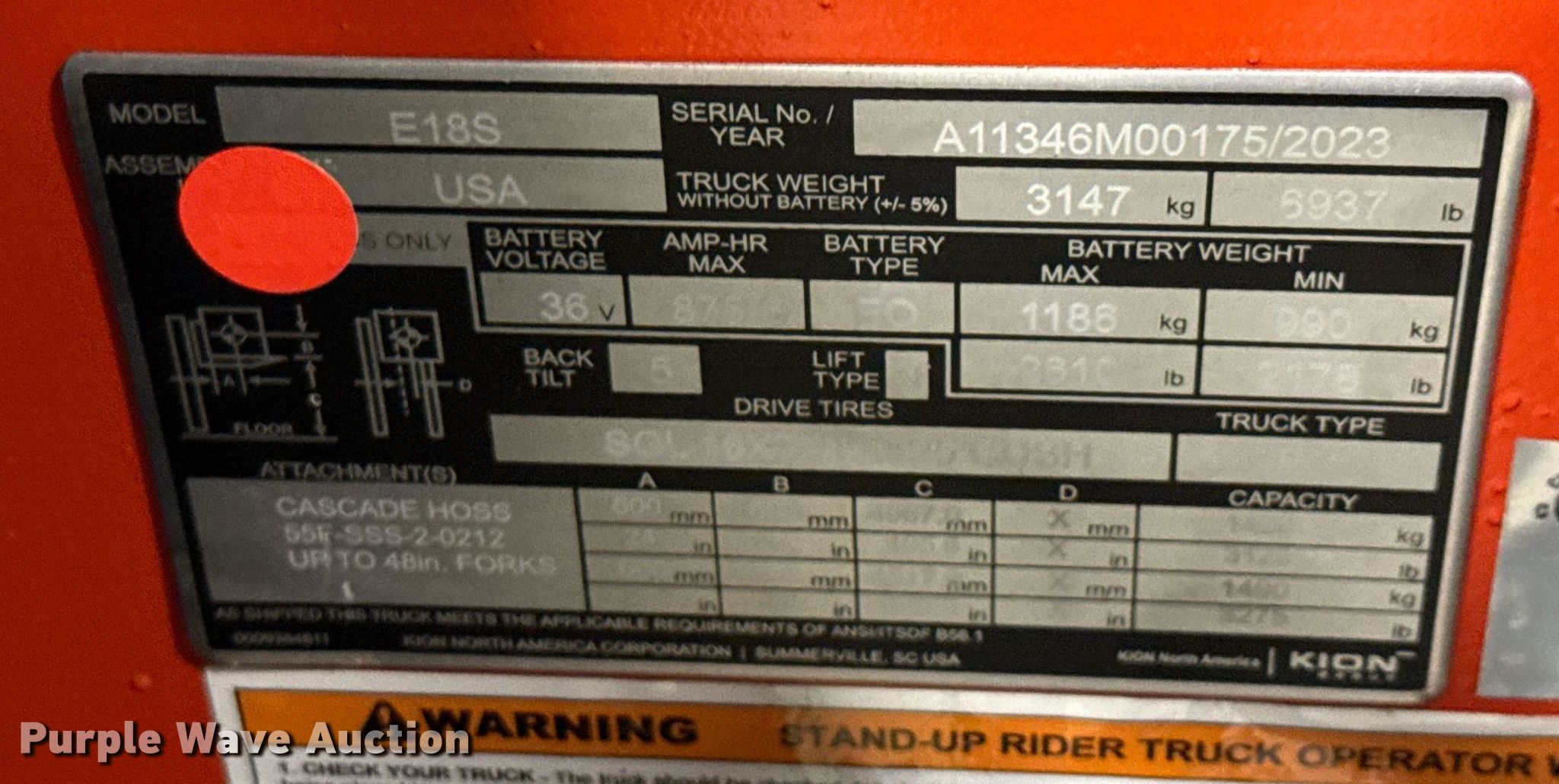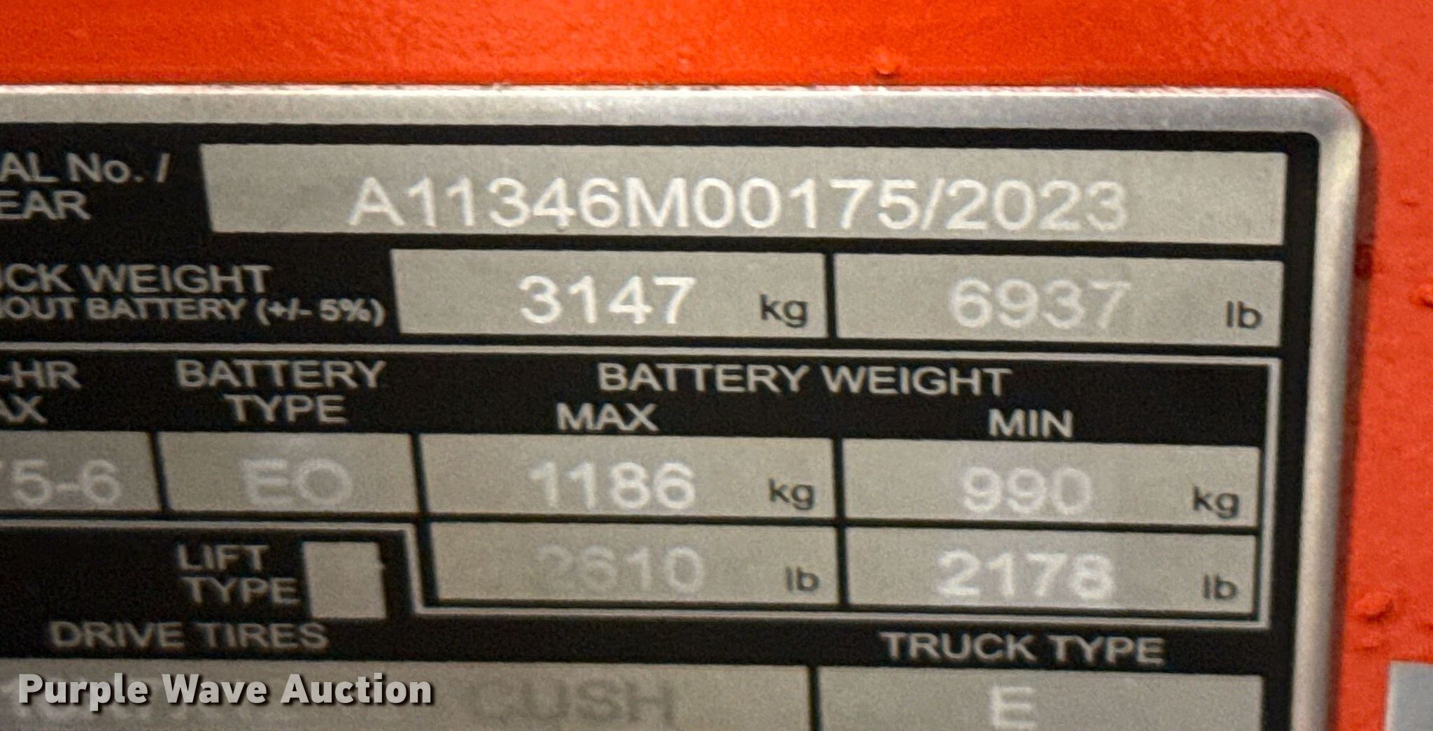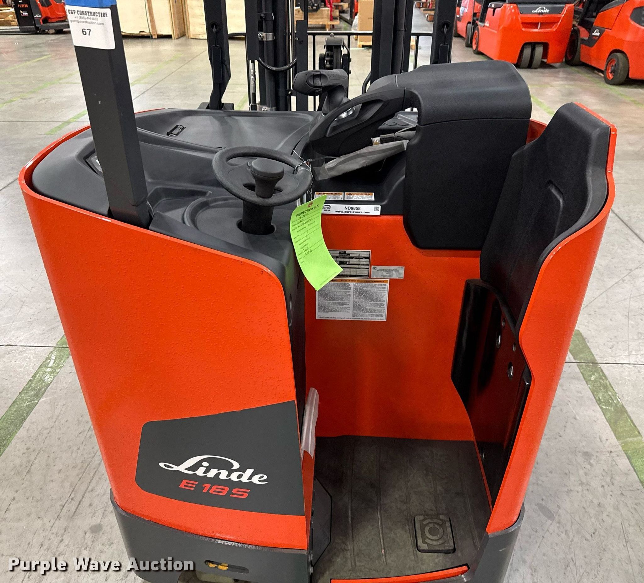 2023 Linde E18S forklift. Hours: 5 on meter, Serial: A11346M00175. Electric Motor Volts: 36, Charger: Viking Ferro Three phase, Battery: Crown 18-125LM-15 Serial 06373D3, 875AH, Water kit. Transmission Electric drive. Operators station OROPS. Features Maximum lift capacity: 3,275 lbs, Maximum lift height: 189", Collapsed mast height: 88", Mast stages: 3, Side shift, Mast tilt, Fork length: 42". Tires Front: 18x7x12 1/8, Rear: 10x5x6.5, Solid. Notes 3 year or 6,000 hour warranty valid after predelivery inspection by licensed Linde dealer is complete. Fees apply. Prologis - Linde Warranty Available. Lewisville, TX 75067