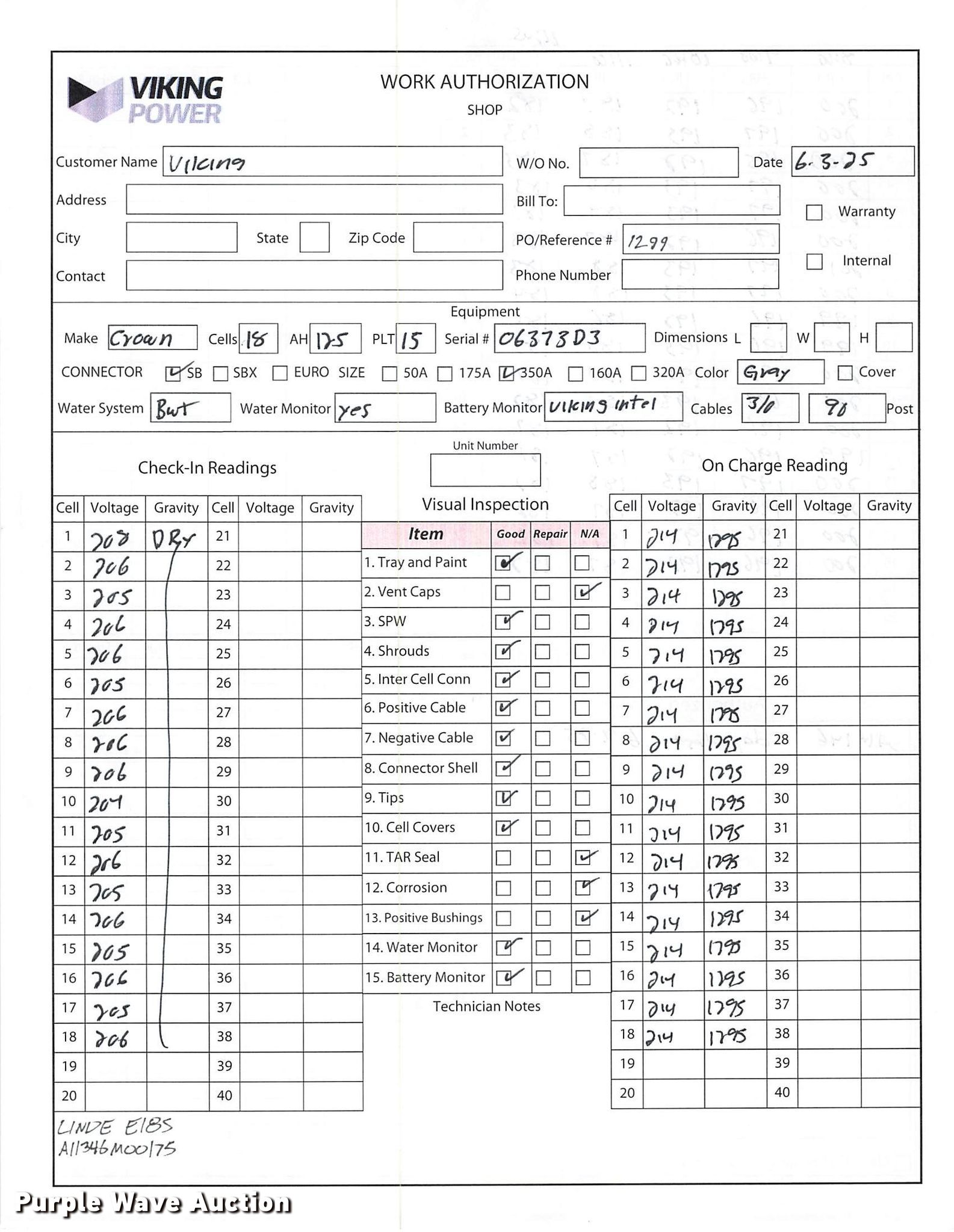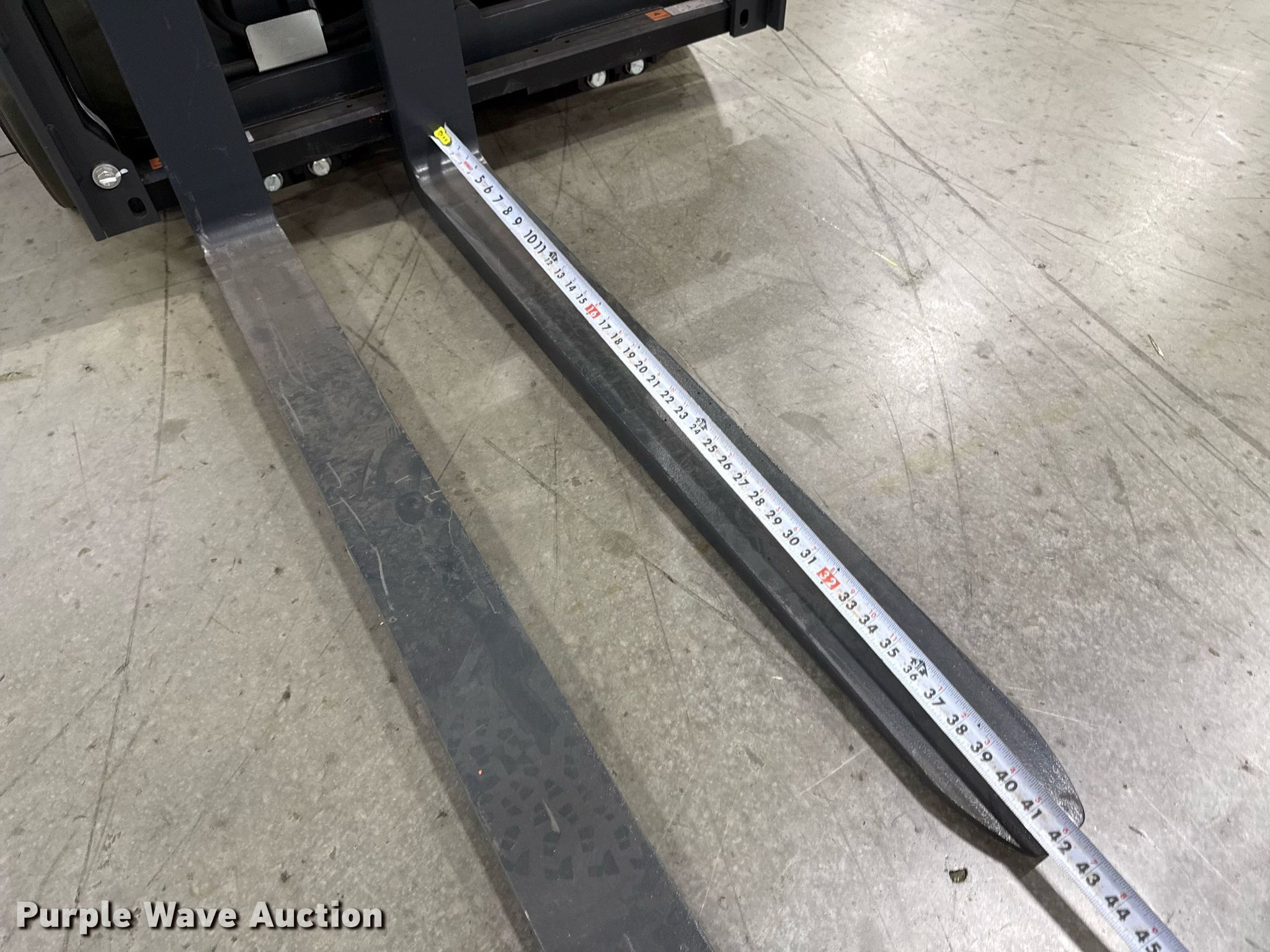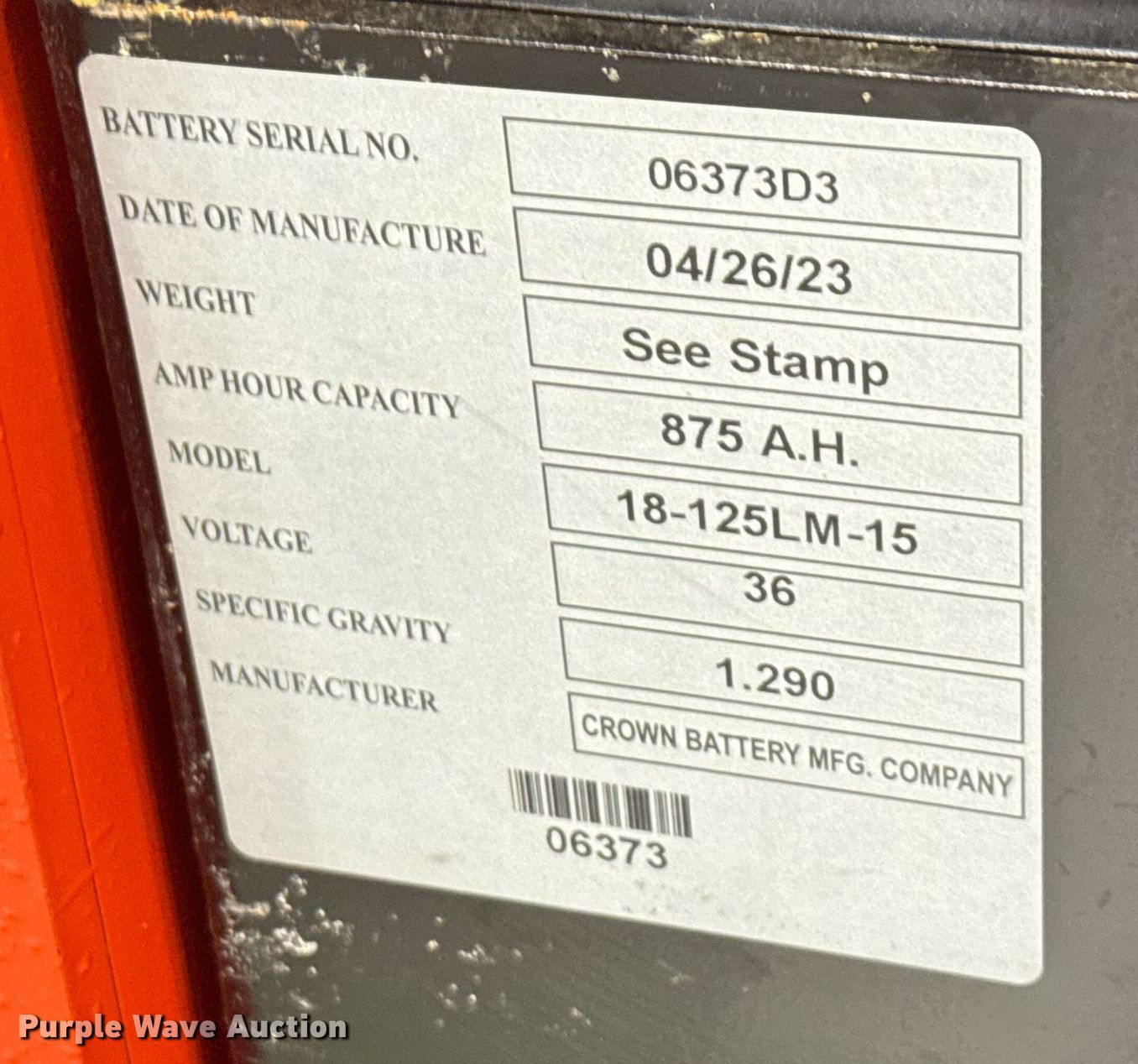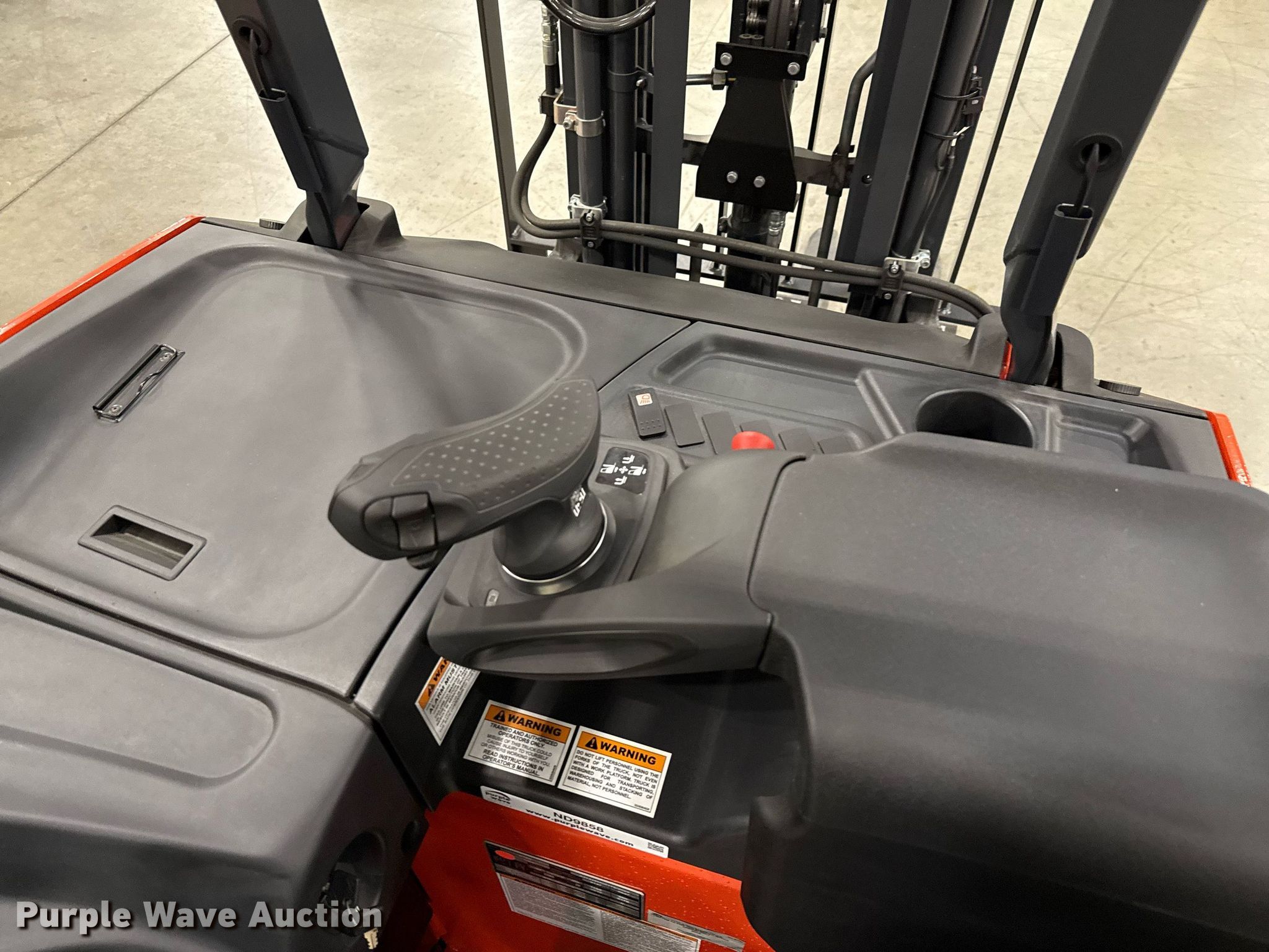 2023 Linde E18S forklift. Hours: 5 on meter, Serial: A11346M00175. Electric Motor Volts: 36, Charger: Viking Ferro Three phase, Battery: Crown 18-125LM-15 Serial 06373D3, 875AH, Water kit. Transmission Electric drive. Operators station OROPS. Features Maximum lift capacity: 3,275 lbs, Maximum lift height: 189", Collapsed mast height: 88", Mast stages: 3, Side shift, Mast tilt, Fork length: 42". Tires Front: 18x7x12 1/8, Rear: 10x5x6.5, Solid. Notes 3 year or 6,000 hour warranty valid after predelivery inspection by licensed Linde dealer is complete. Fees apply. Prologis - Linde Warranty Available. Lewisville, TX 75067