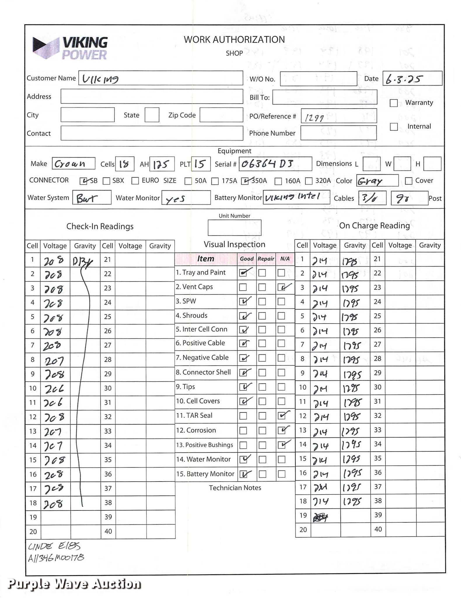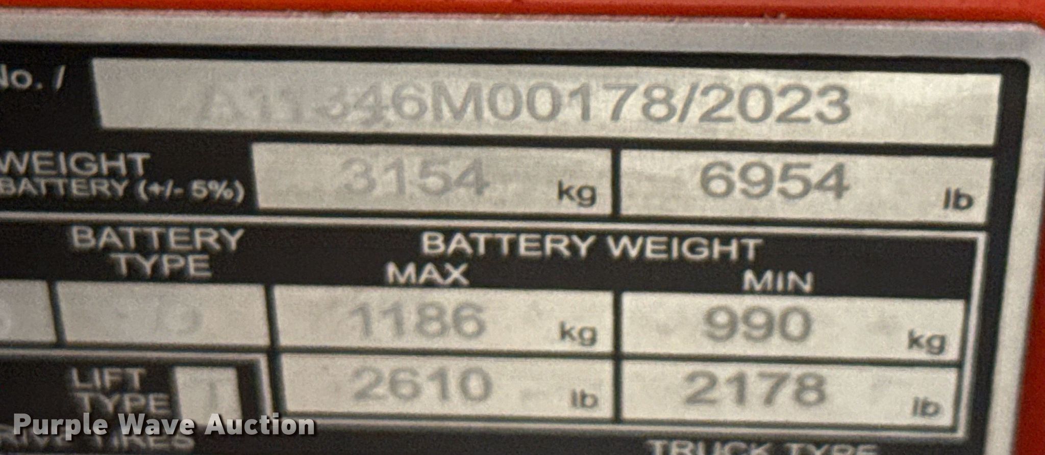 2023 Linde E18S forklift. Hours: 5 on meter, Serial: A11346M00178. Electric Motor Volts: 36, Charger: Viking Ferro Three phase, Battery: Crown 18-125LM-15 Serial 06364D3, 875AH, Water kit. Transmission Electric drive. Operators station OROPS. Features Maximum lift capacity: 3,275 lbs, Maximum lift height: 189", Collapsed mast height: 88", Mast stages: 3, Side shift, Mast tilt, Fork length: 42". Tires Front: 18x7x12 1/8, Rear: 10x5x6.5, Solid. Notes 3 year or 6,000 hour warranty valid after predelivery inspection by licensed Linde dealer is complete. Fees apply. Prologis - Linde Warranty Available. Lewisville, TX 75067
