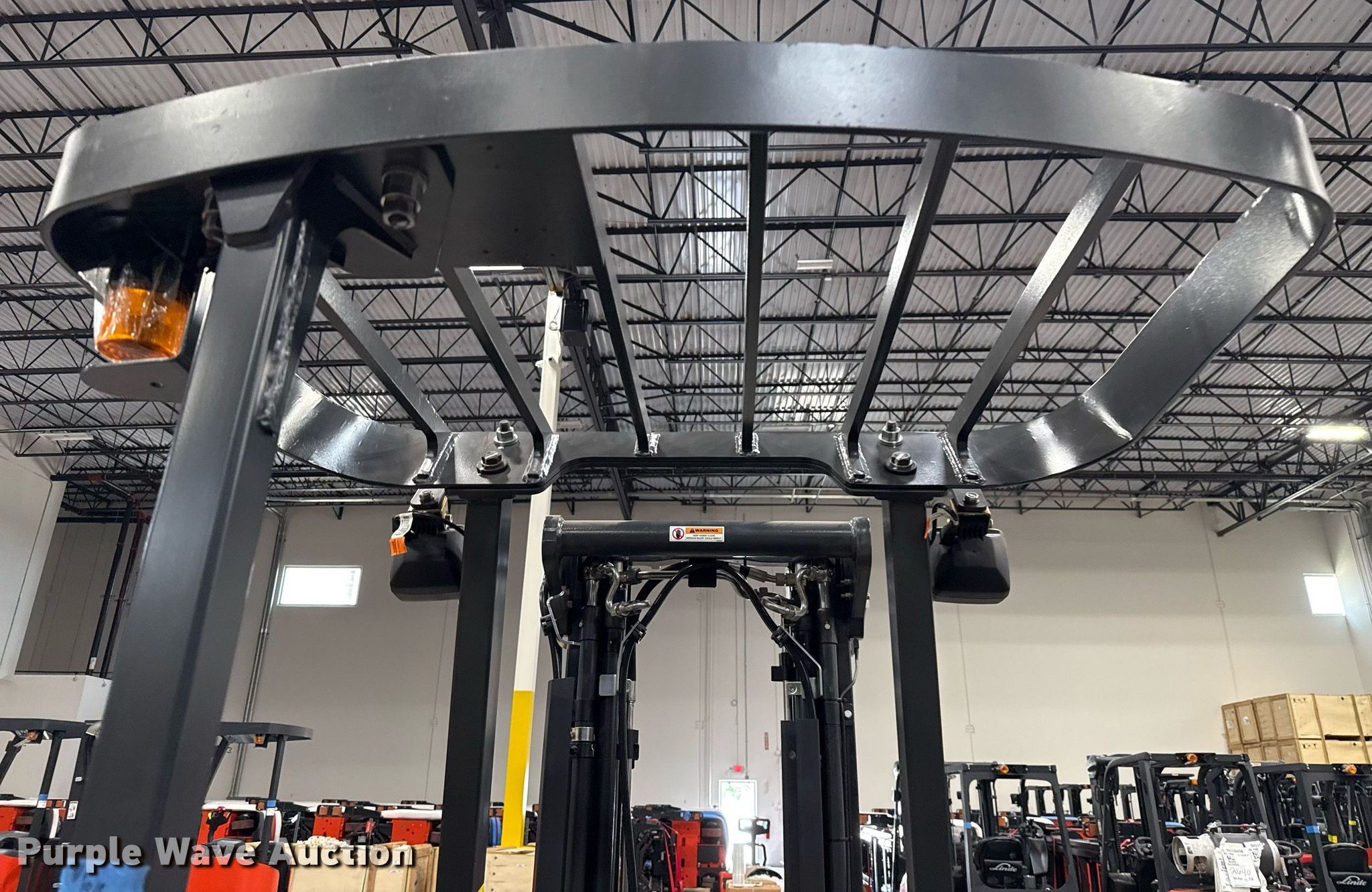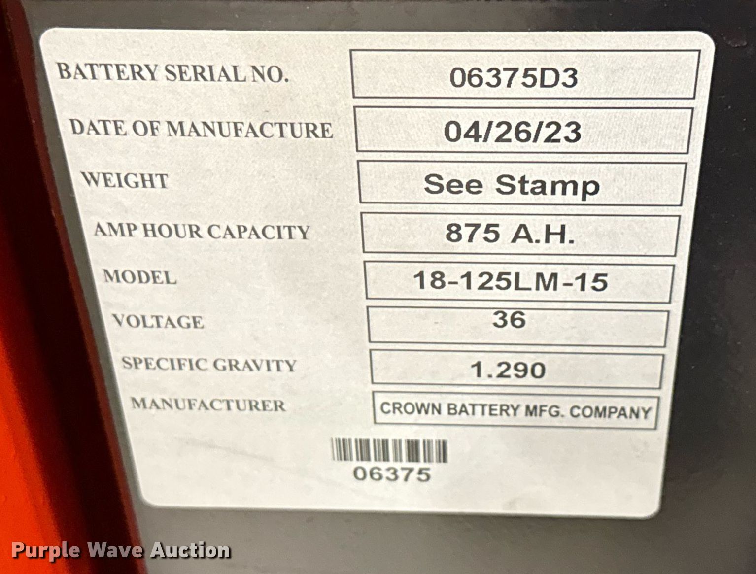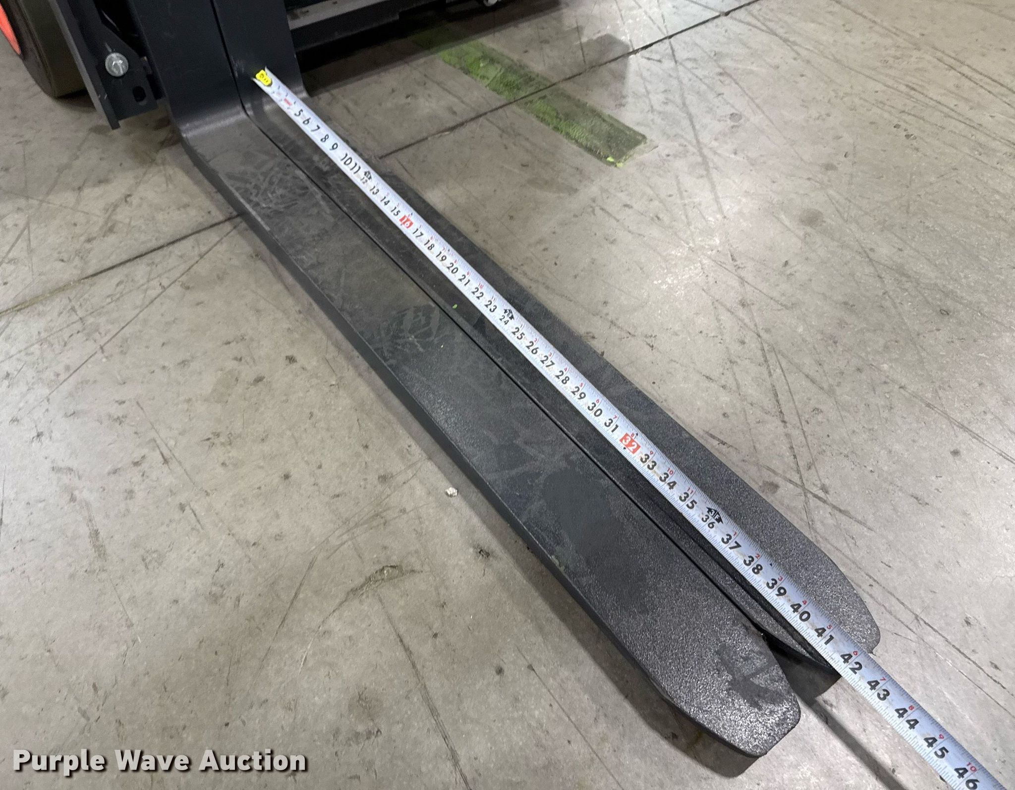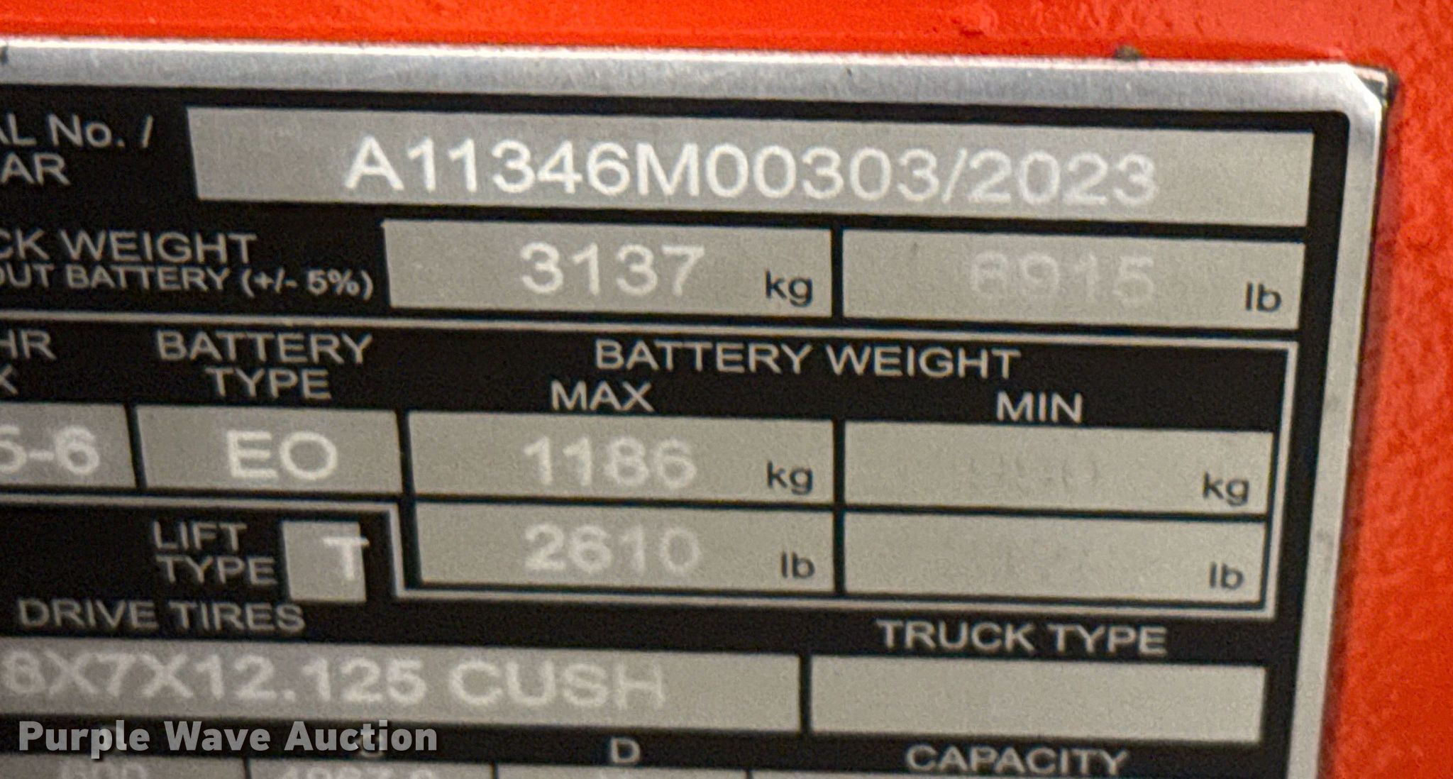 2023 Linde E18S forklift. Hours: 4 on meter, Serial: A11346M00303. Electric Motor Volts: 36, Charger: Viking Ferro Three phase, Battery: Crown 18-125LM-15 Serial 06375D3, 875AH, Water kit. Transmission Electric drive. Operators station OROPS. Features Maximum lift capacity: 3,275 lbs, Maximum lift height: 189", Collapsed mast height: 88", Mast stages: 3, Side shift, Mast tilt, Fork length: 42". Tires Front: 18x7x12 1/8, Rear: 10x5x6.5, Solid. Notes 3 year or 6,000 hour warranty valid after predelivery inspection by licensed Linde dealer is complete. Fees apply. Prologis - Linde Warranty Available. Lewisville, TX 75067