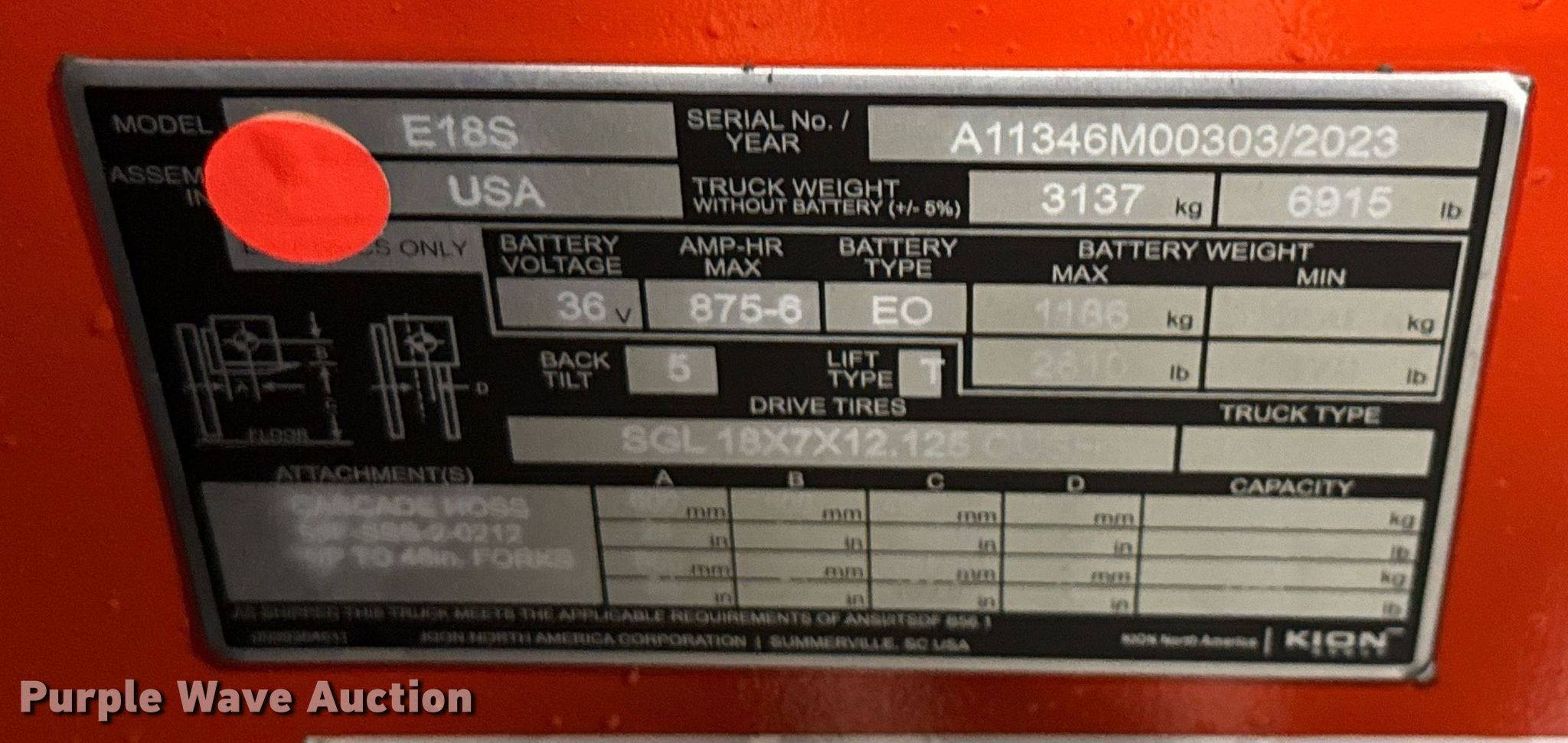 Purple Wave is selling a used Warehouse Forklift in Texas. This item is a 2023 Linde E18S forklift with the following: Hours: 4 on meter, Serial: A11346M00303