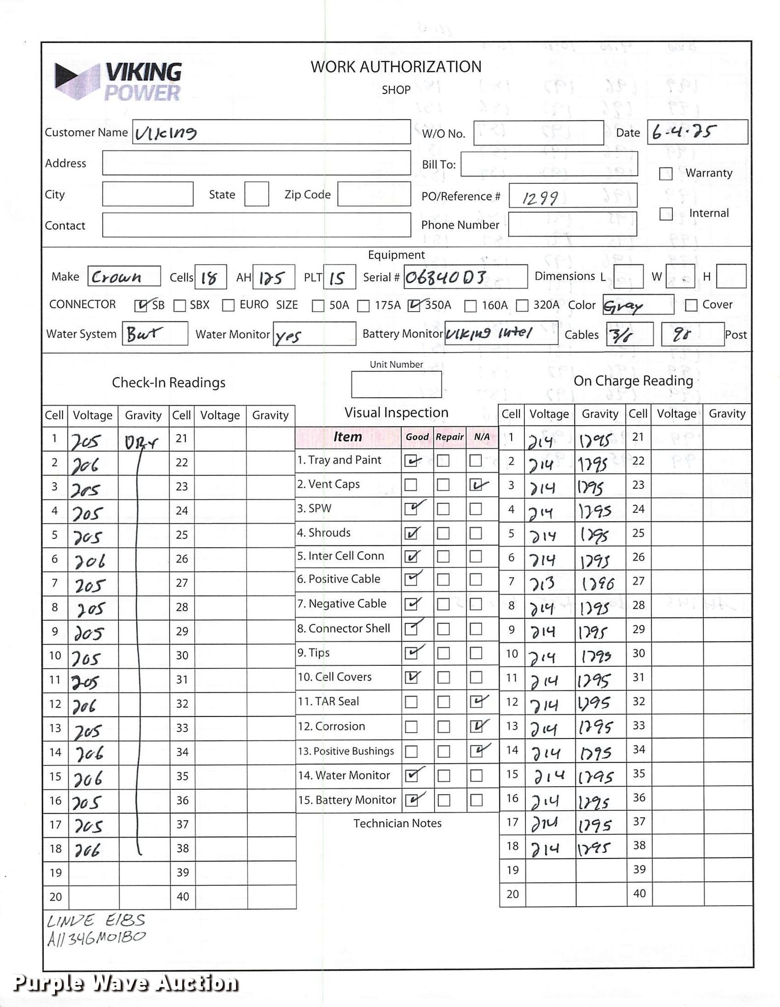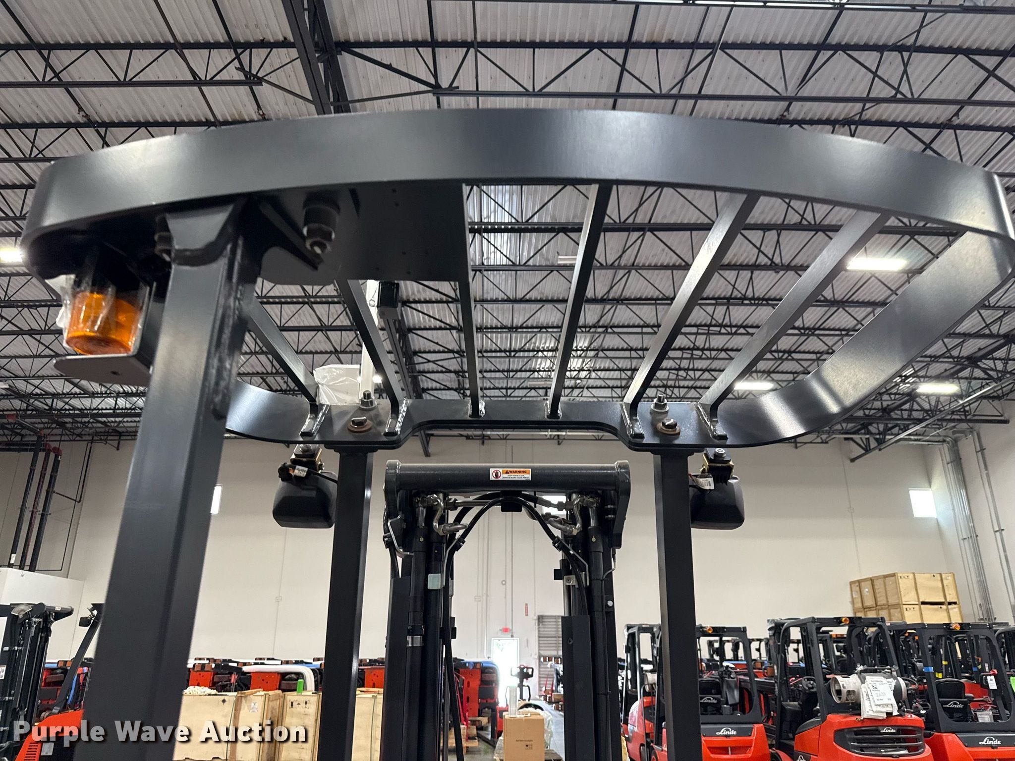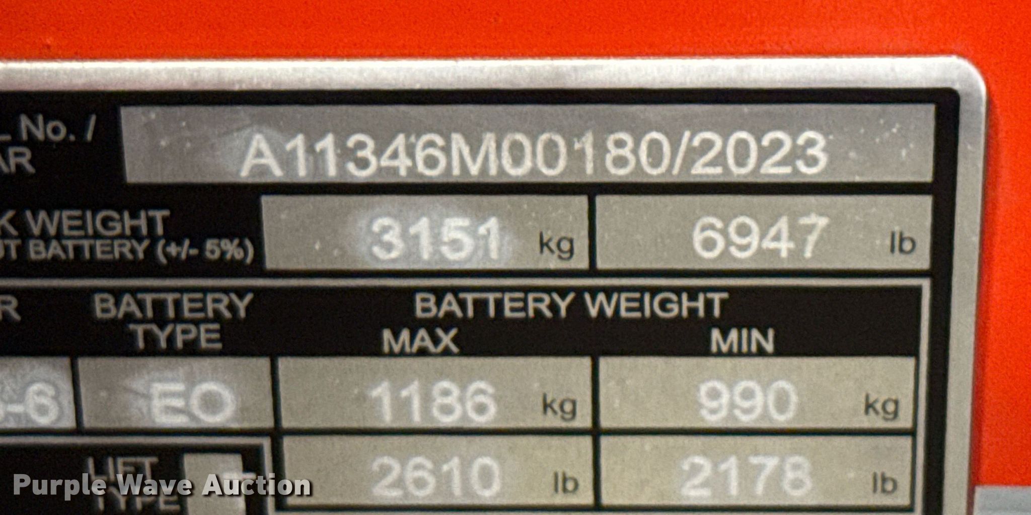 2023 Linde E18S forklift. Hours: 4 on meter, Serial: A11346M00180. Electric Motor Volts: 36, Charger: Viking Ferro Three phase, Battery: Crown 18-125LM-15 Serial 06340D3, 875AH, Water kit. Transmission Electric drive. Operators station OROPS. Features Maximum lift capacity: 3,275 lbs, Maximum lift height: 189", Collapsed mast height: 88", Mast stages: 3, Side shift, Mast tilt, Fork length: 42". Tires Front: 18x7x12 1/8, Rear: 10x5x6.5, Solid. Notes 3 year or 6,000 hour warranty valid after predelivery inspection by licensed Linde dealer is complete. Fees apply. Prologis - Linde Warranty Available. Lewisville, TX 75067