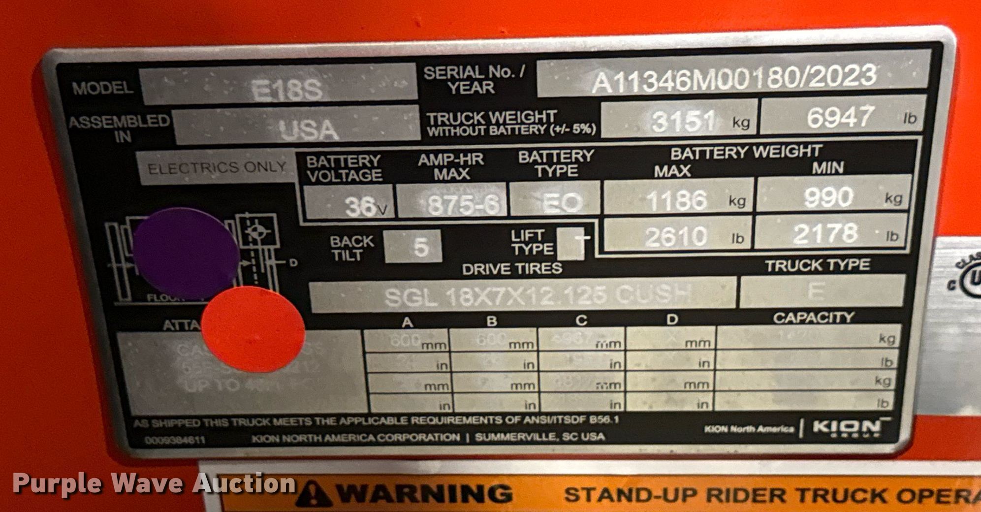 Purple Wave is selling a used Warehouse Forklift in Texas. This item is a 2023 Linde E18S forklift with the following: Hours: 4 on meter, Serial: A11346M00180