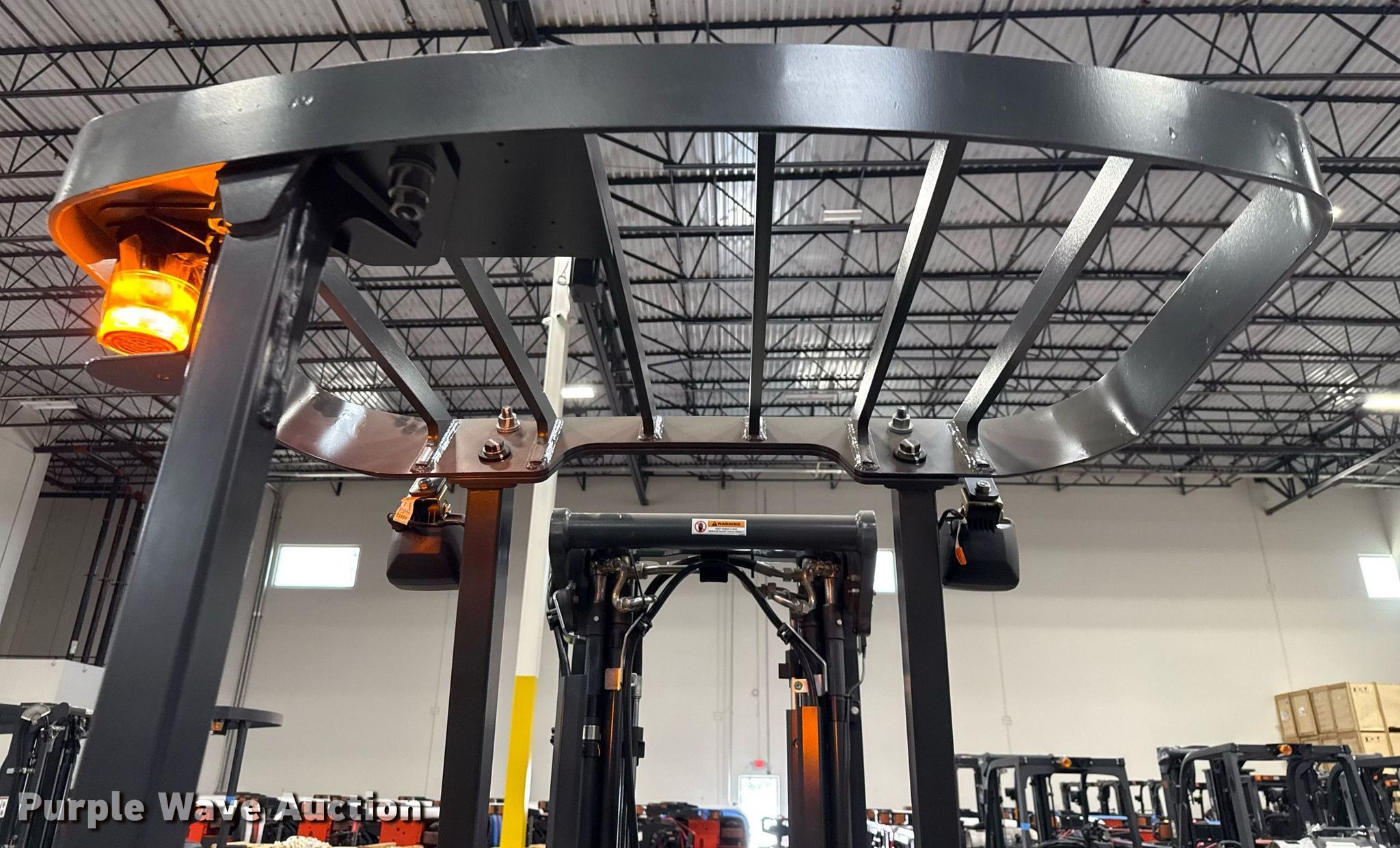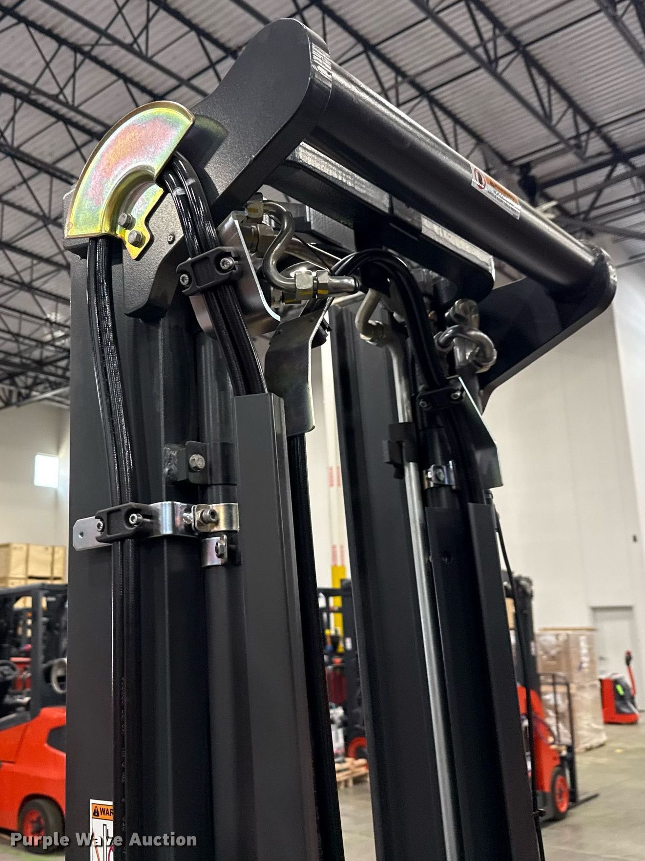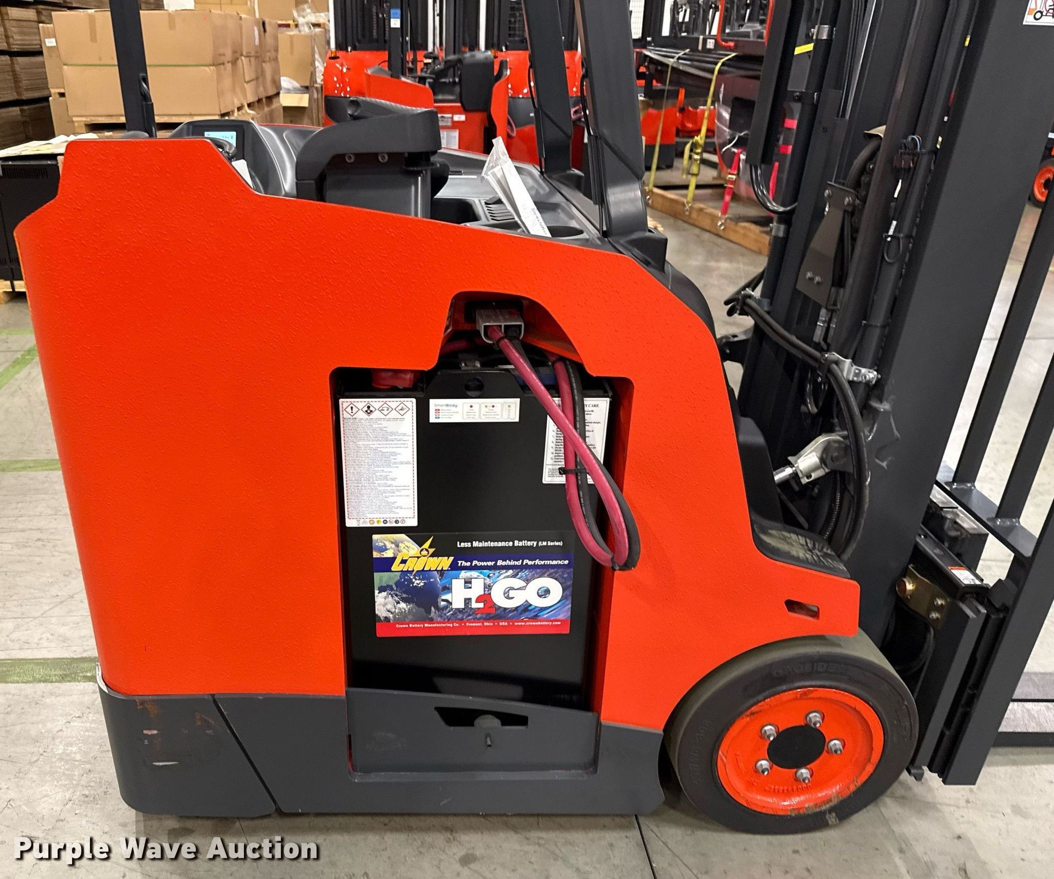 2023 Linde E18S forklift. Hours: 3 on meter, Serial: A11346M00298. Electric Motor Volts: 36, Charger: Viking Ferro Three phase, Battery: Crown 18-125LM-15 Serial 06292D3, 875AH, Water kit. Transmission Electric drive. Operators station OROPS. Features Maximum lift capacity: 3,275 lbs, Maximum lift height: 189", Collapsed mast height: 88", Mast stages: 3, Side shift, Mast tilt, Fork length: 42". Tires Front: 18x7x12 1/8, Rear: 10x5x6.5, Solid. Notes 3 year or 6,000 hour warranty valid after predelivery inspection by licensed Linde dealer is complete. Fees apply. Prologis - Linde Warranty Available. Lewisville, TX 75067