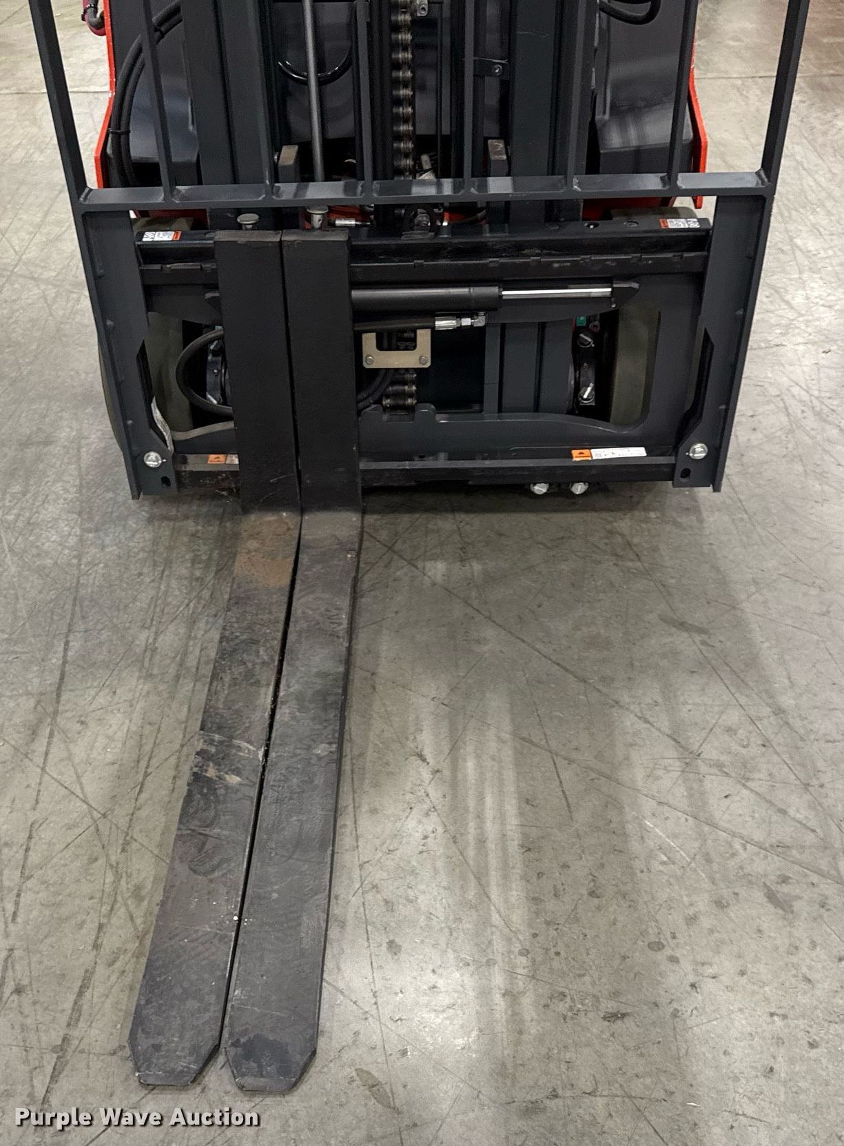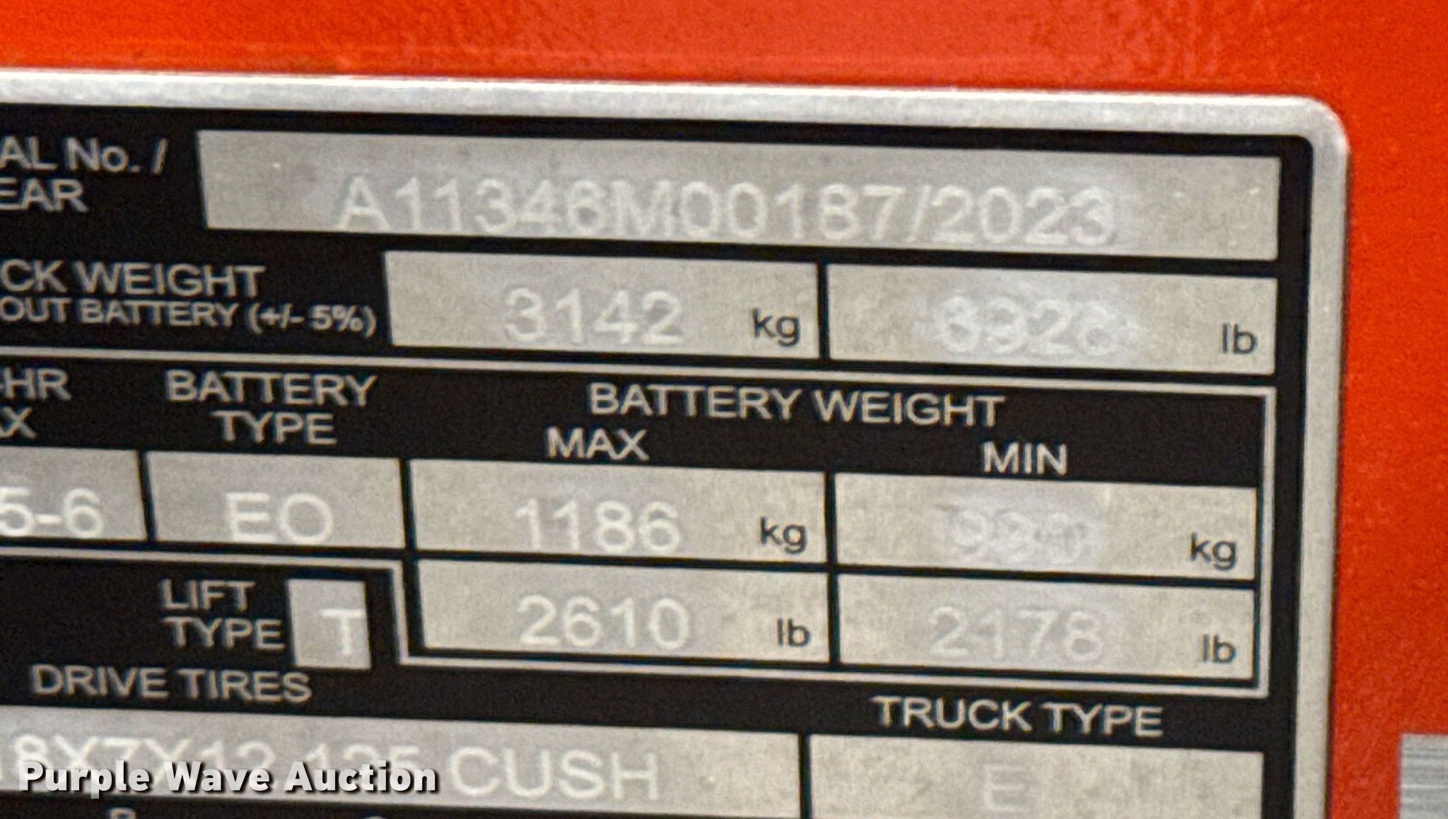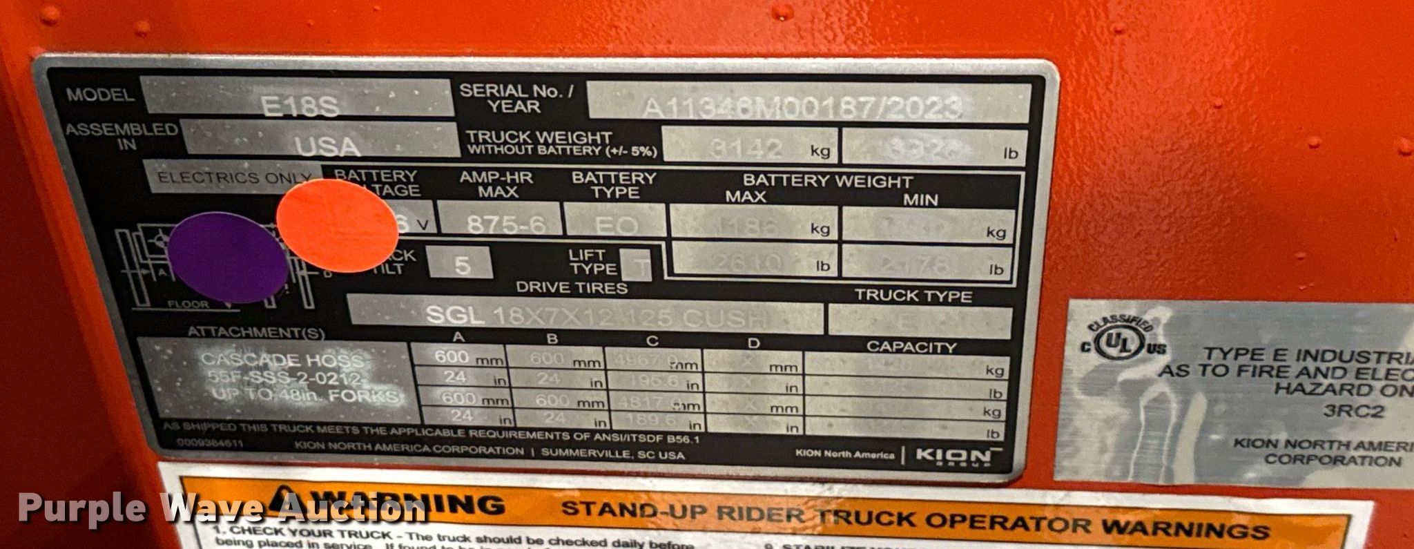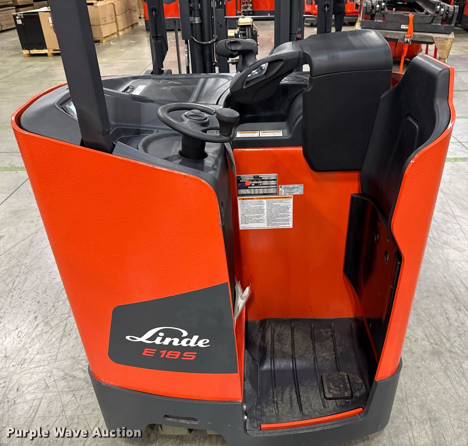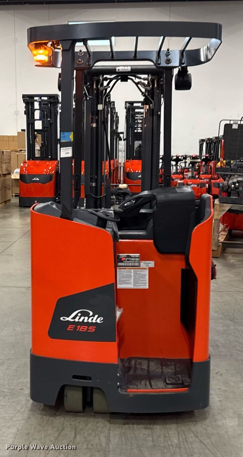 2023 Linde E18S forklift. Hours: 7 on meter, Serial: A11346M00187. Electric Motor Volts: 36, Charger: Viking Ferro Three phase, Battery: Crown 18-125LM-15 Serial 06322D3, 875AH, Water kit. Transmission Electric drive. Operators station OROPS. Features Maximum lift capacity: 3,275 lbs, Maximum lift height: 189", Collapsed mast height: 88", Mast stages: 3, Side shift, Mast tilt, Fork length: 42". Tires Front: 18x7x12 1/8, Rear: 10x5x6.5, Solid. Notes 3 year or 6,000 hour warranty valid after predelivery inspection by licensed Linde dealer is complete. Fees apply. Prologis - Linde Warranty Available. Lewisville, TX 75067