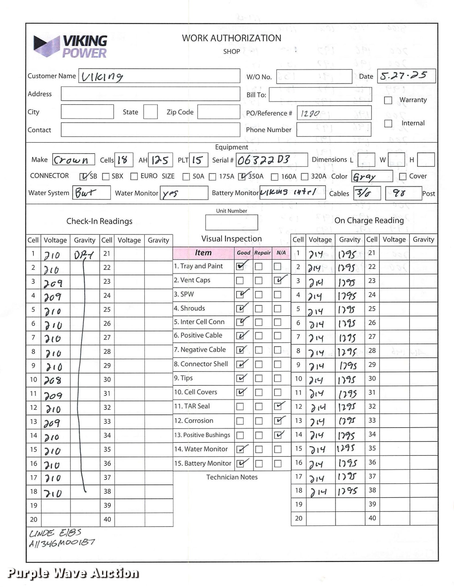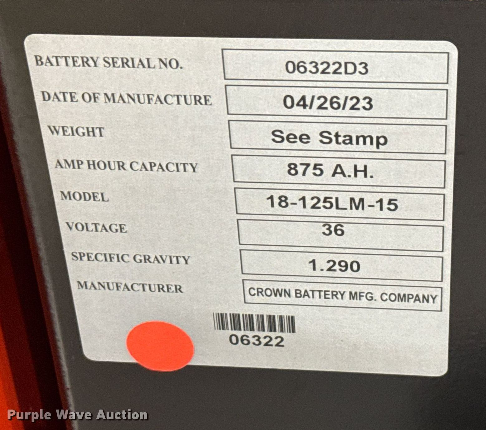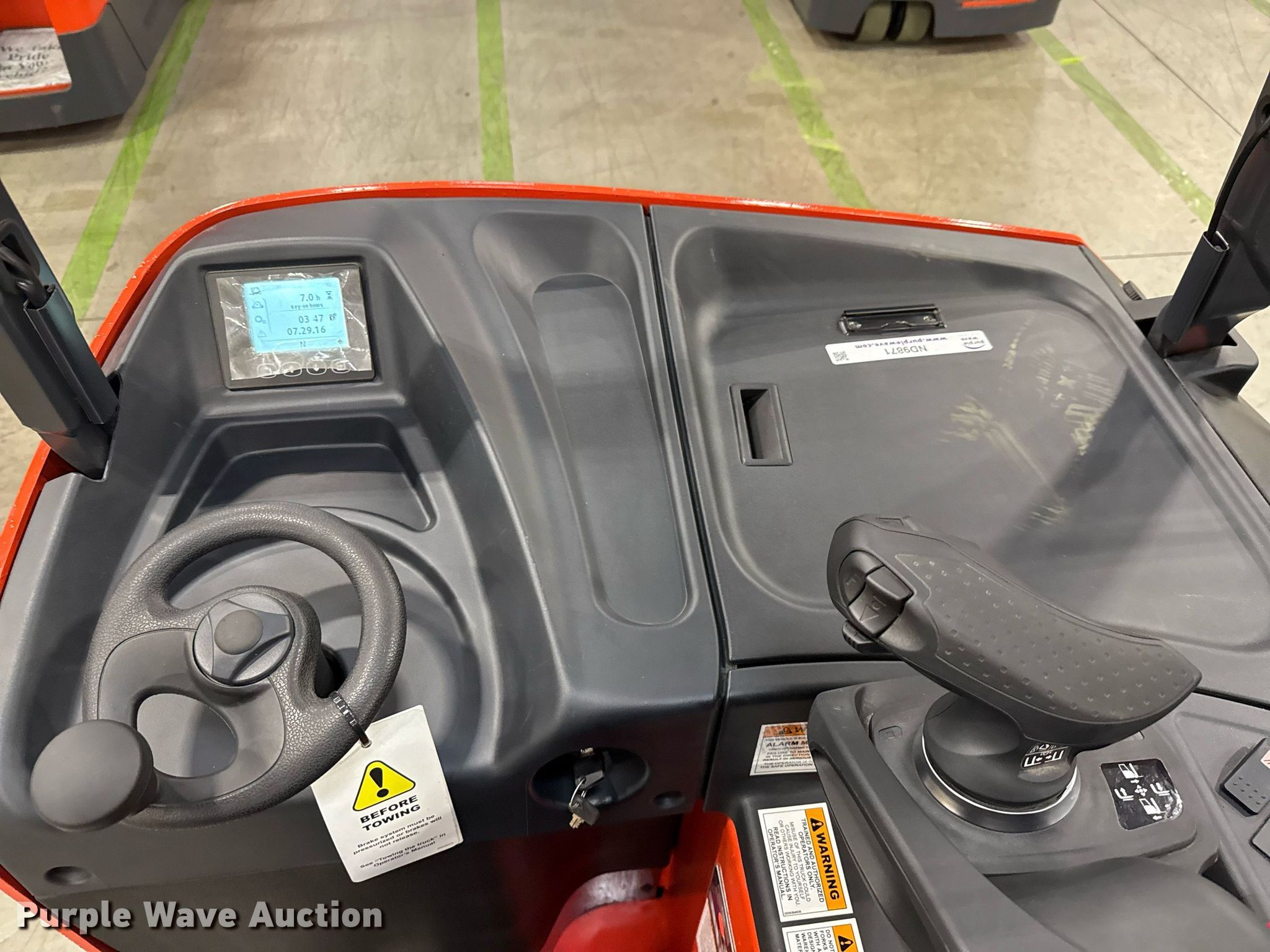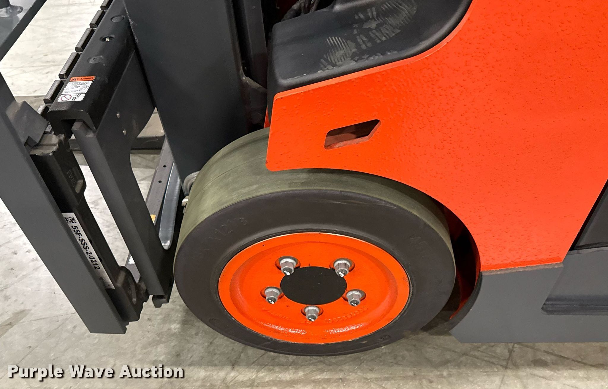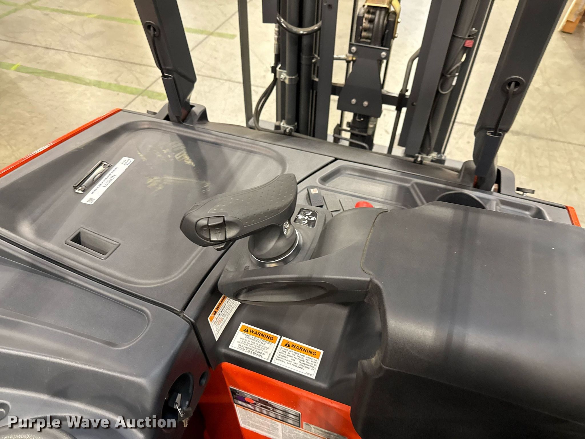 2023 Linde E18S forklift. Hours: 7 on meter, Serial: A11346M00187. Electric Motor Volts: 36, Charger: Viking Ferro Three phase, Battery: Crown 18-125LM-15 Serial 06322D3, 875AH, Water kit. Transmission Electric drive. Operators station OROPS. Features Maximum lift capacity: 3,275 lbs, Maximum lift height: 189", Collapsed mast height: 88", Mast stages: 3, Side shift, Mast tilt, Fork length: 42". Tires Front: 18x7x12 1/8, Rear: 10x5x6.5, Solid. Notes 3 year or 6,000 hour warranty valid after predelivery inspection by licensed Linde dealer is complete. Fees apply. Prologis - Linde Warranty Available. Lewisville, TX 75067