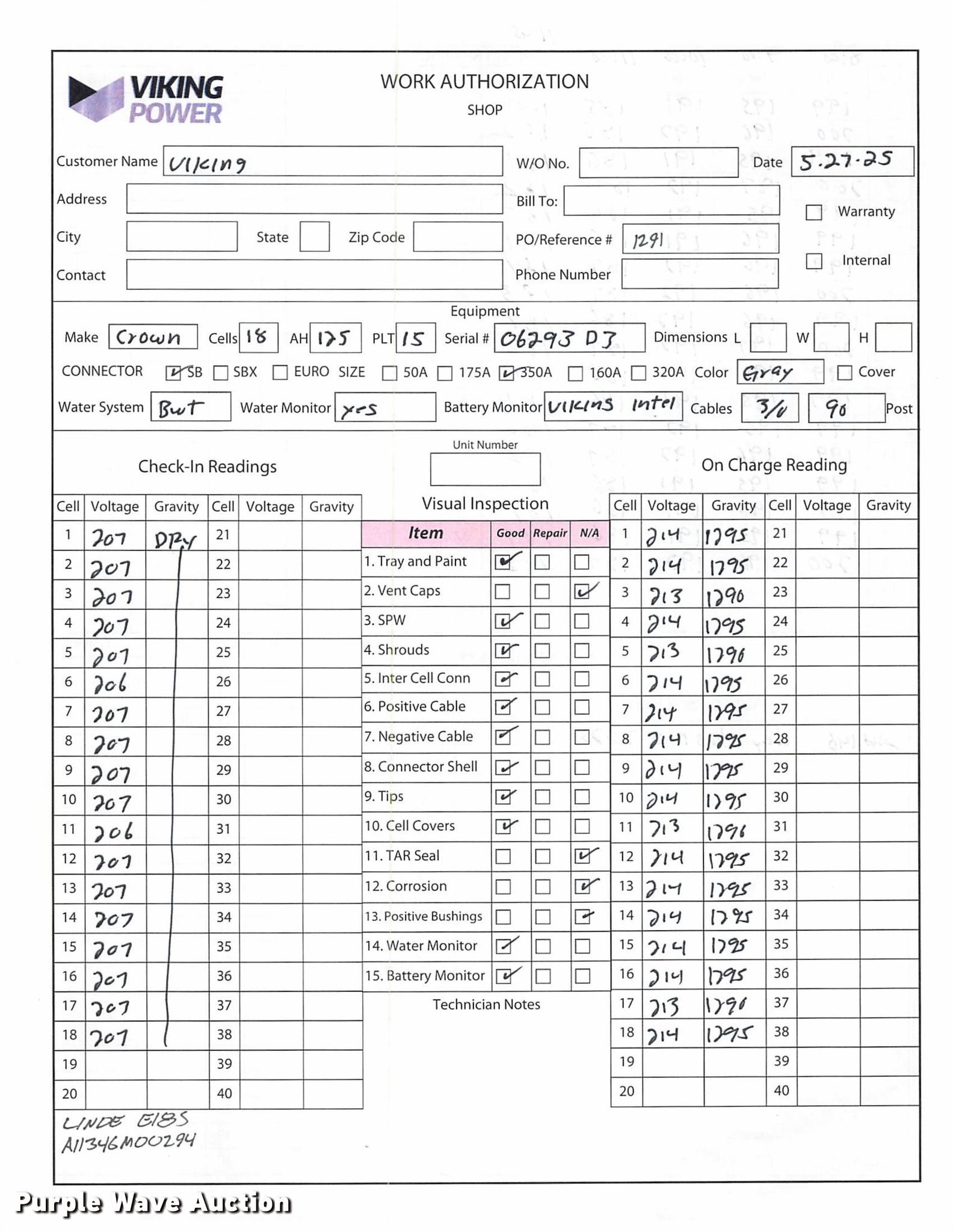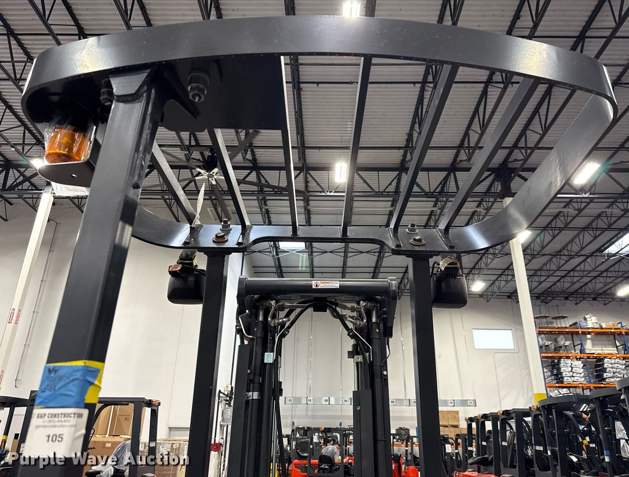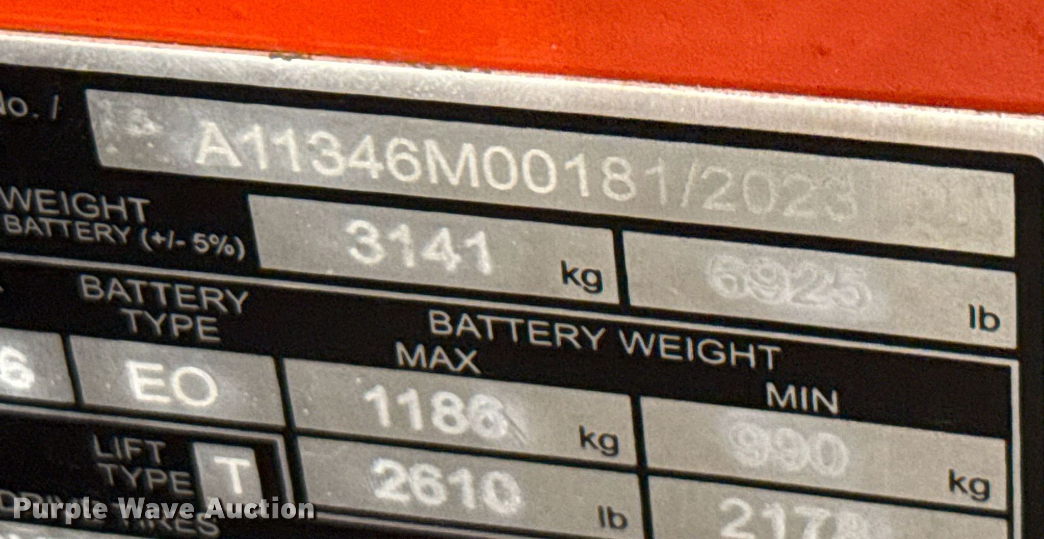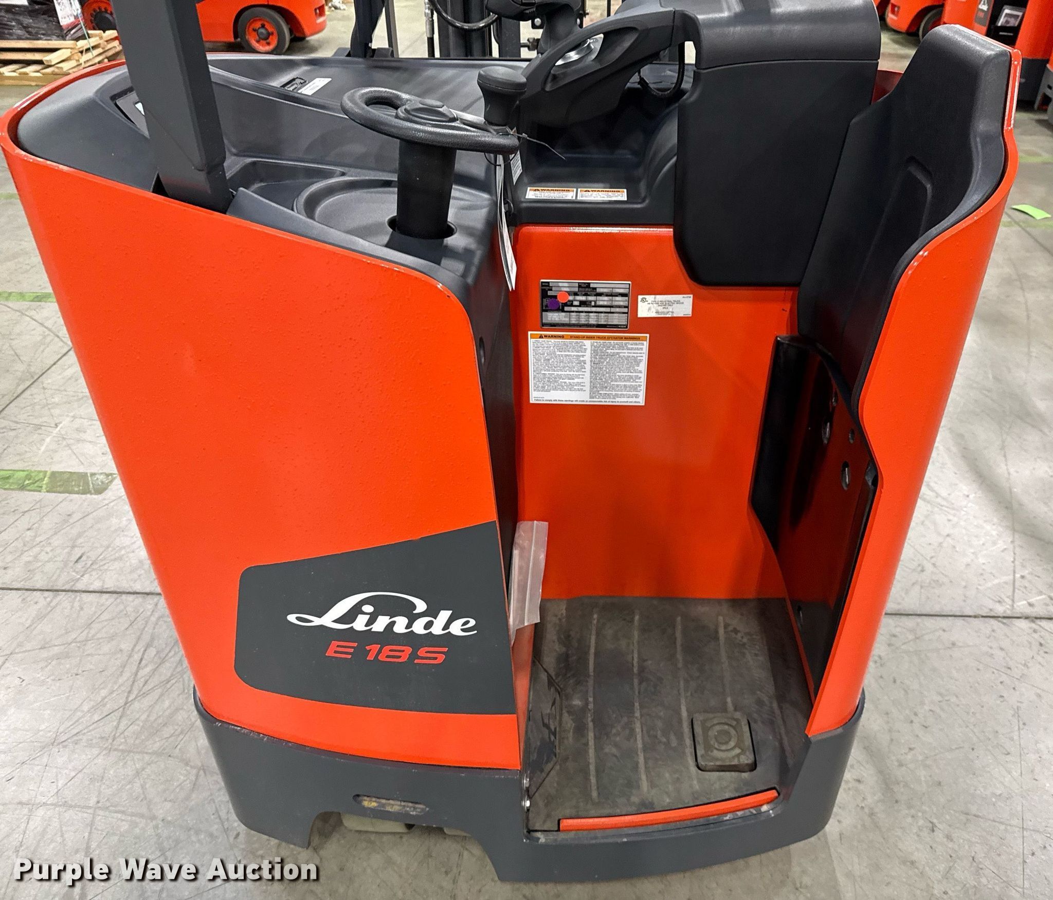 2023 Linde E18S forklift. Hours: 3 on meter, Serial: A11346M00181. Electric Motor Volts: 36, Charger: Viking Ferro Three phase, Battery: Crown 18-125LM-15 Serial 06293D3, 875AH, Water kit. Transmission Electric drive. Operators station OROPS. Features Maximum lift capacity: 3,275 lbs, Maximum lift height: 189", Collapsed mast height: 88", Mast stages: 3, Side shift, Mast tilt, Fork length: 42". Tires Front: 18x7x12 1/8, Rear: 10x5x6.5, Solid. Notes 3 year or 6,000 hour warranty valid after predelivery inspection by licensed Linde dealer is complete. Fees apply. Prologis - Linde Warranty Available. Lewisville, TX 75067