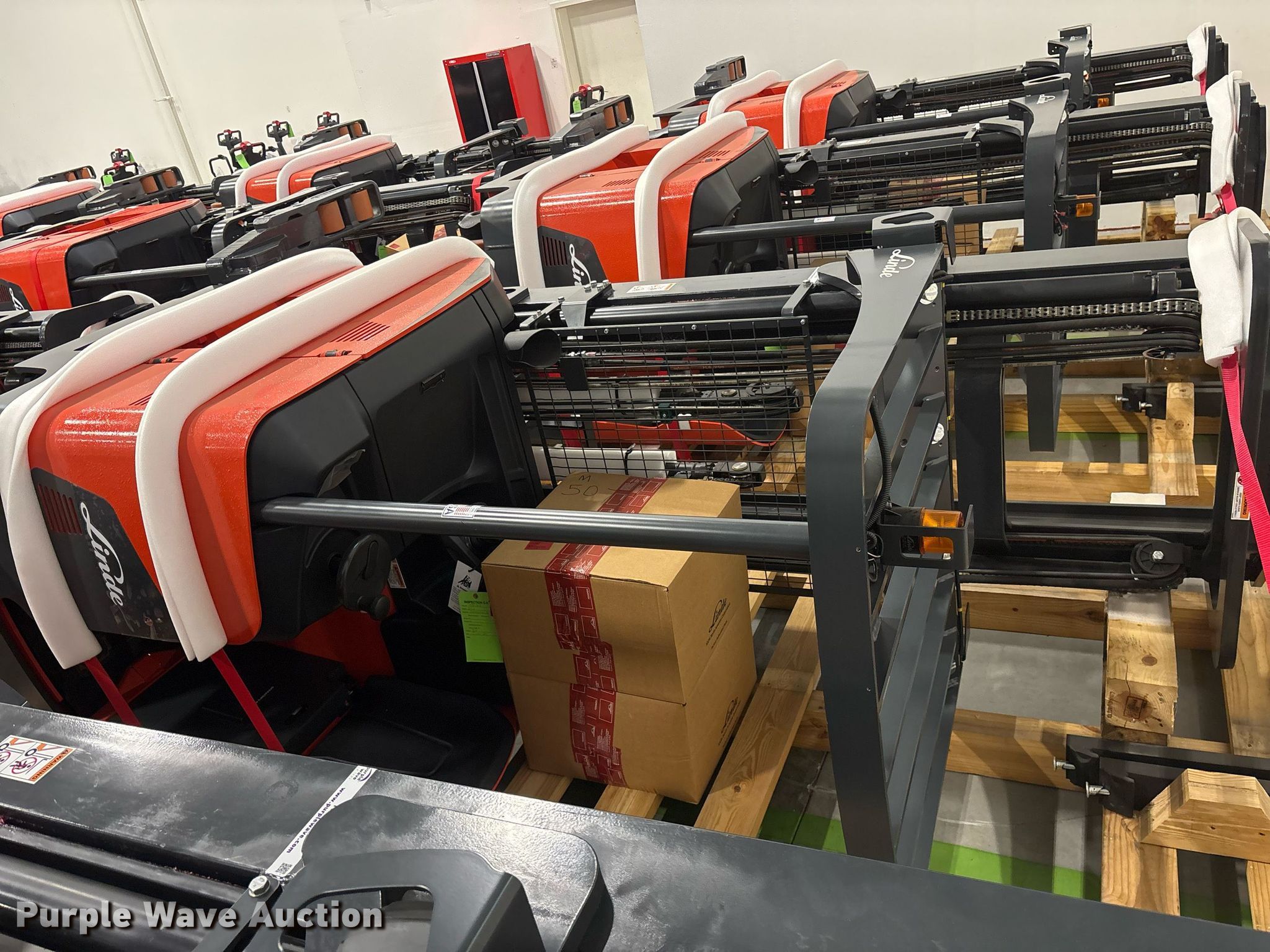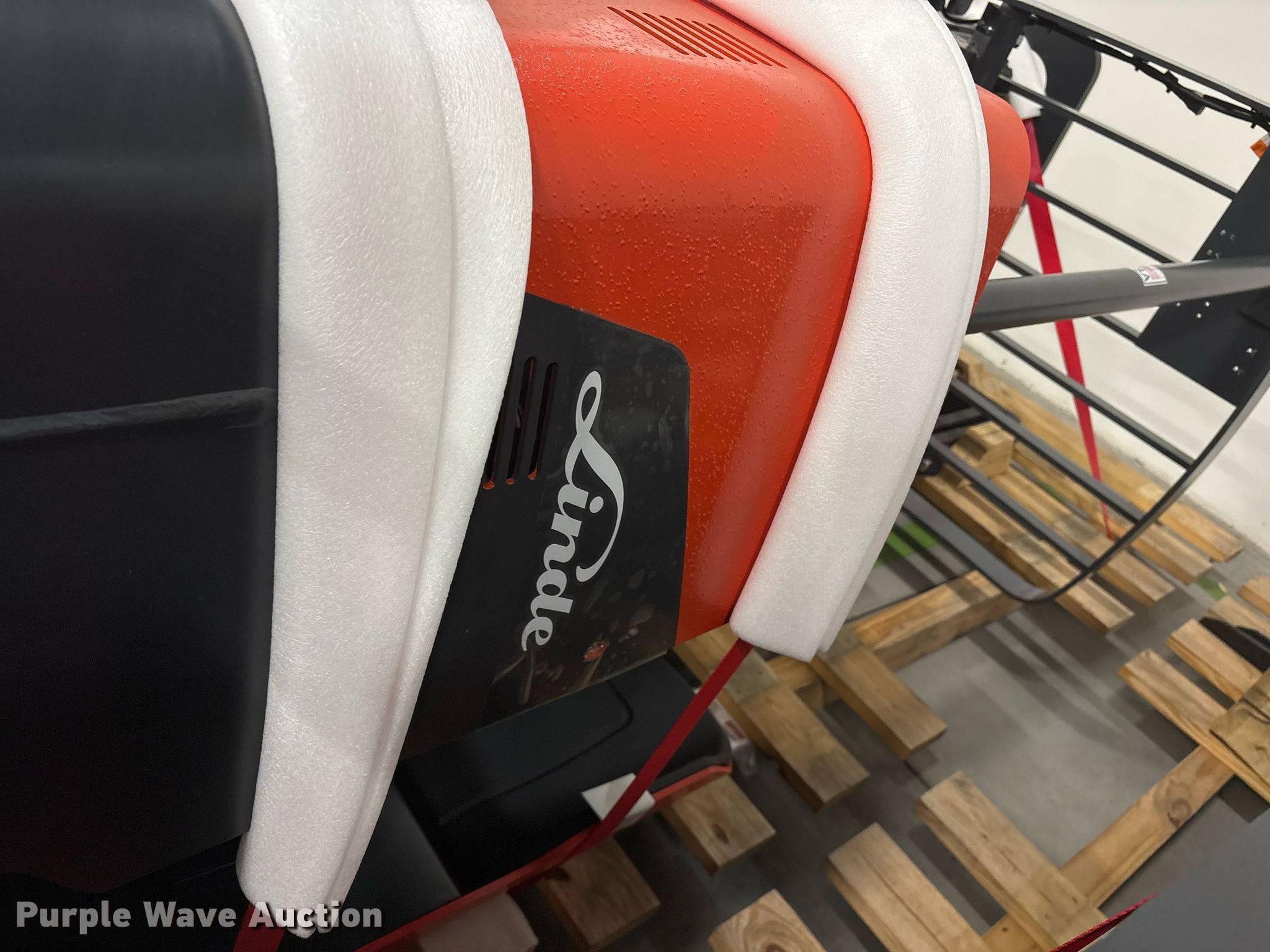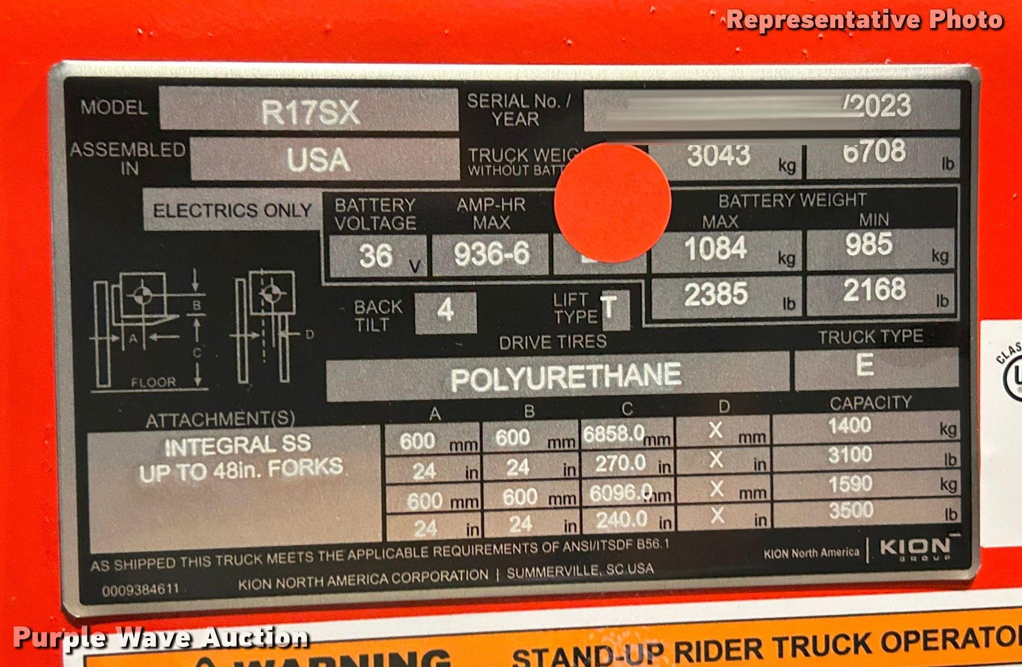 2023 Linde R17SX reach truck. Serial: C25195M00507. Electric Motor Volts: 36, Charger: Tricom Opps Phase: Three, Amps: 200, Battery: Crown 18-125LM-13 Serial: 06689E4, Amp hour: 750. Transmission Electric drive. Operators station OROPS. Features Maximum lift capacity: 3,500 lbs, Maximum lift height: 270", Collapsed mast height: 119", Mast stages: 3, Side shift, Mast tilt, Fork length: 42". Tires Solid, Non-marking. Notes Unused, 3 year or 6,000 hour warranty valid after predelivery inspection by licensed Linde dealer is complete. Fees apply. Representative photos. Prologis - Linde Warranty Available. Lewisville, TX 75067