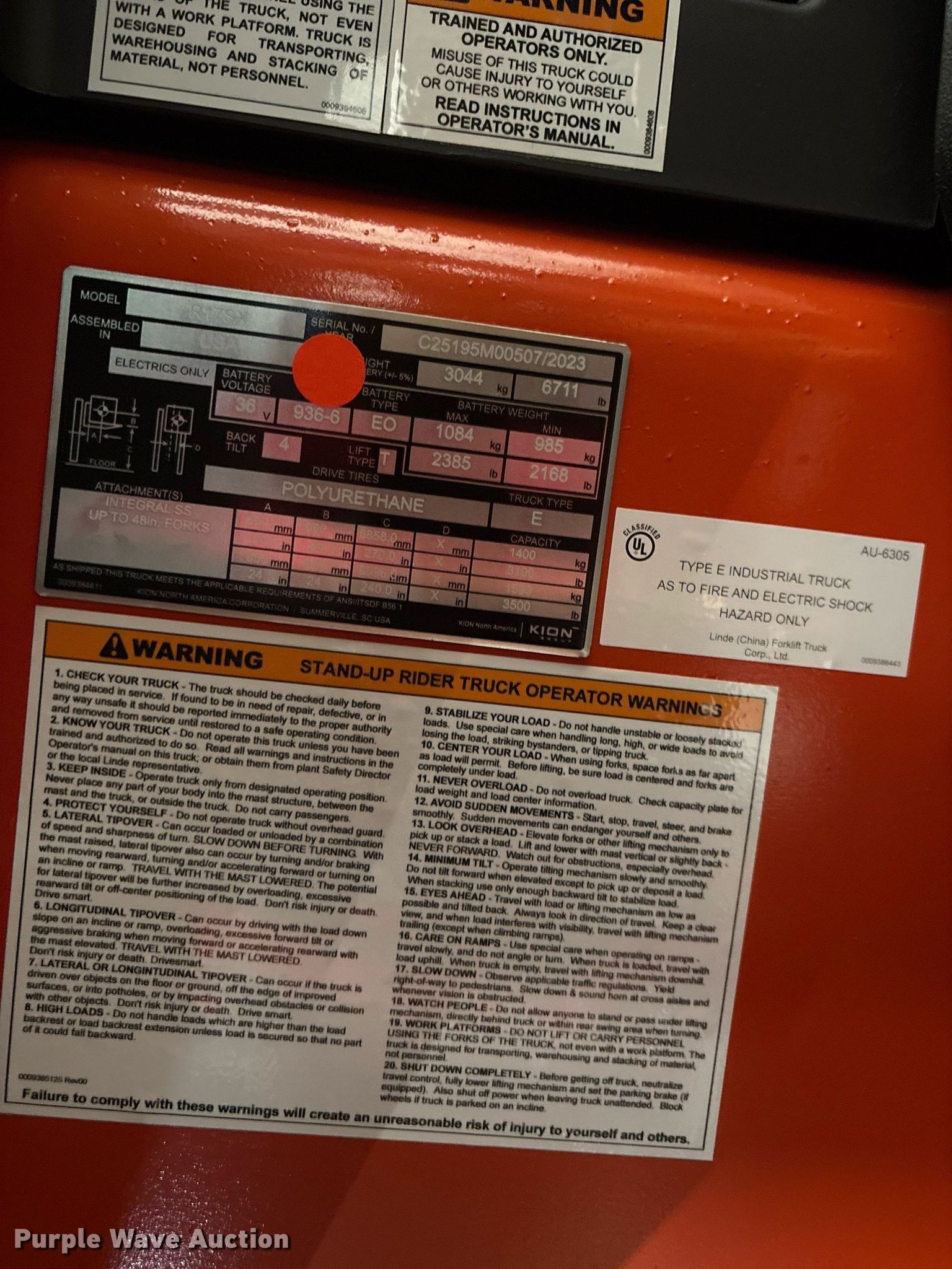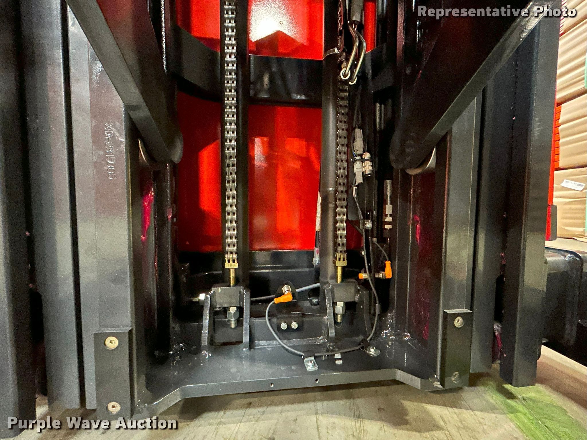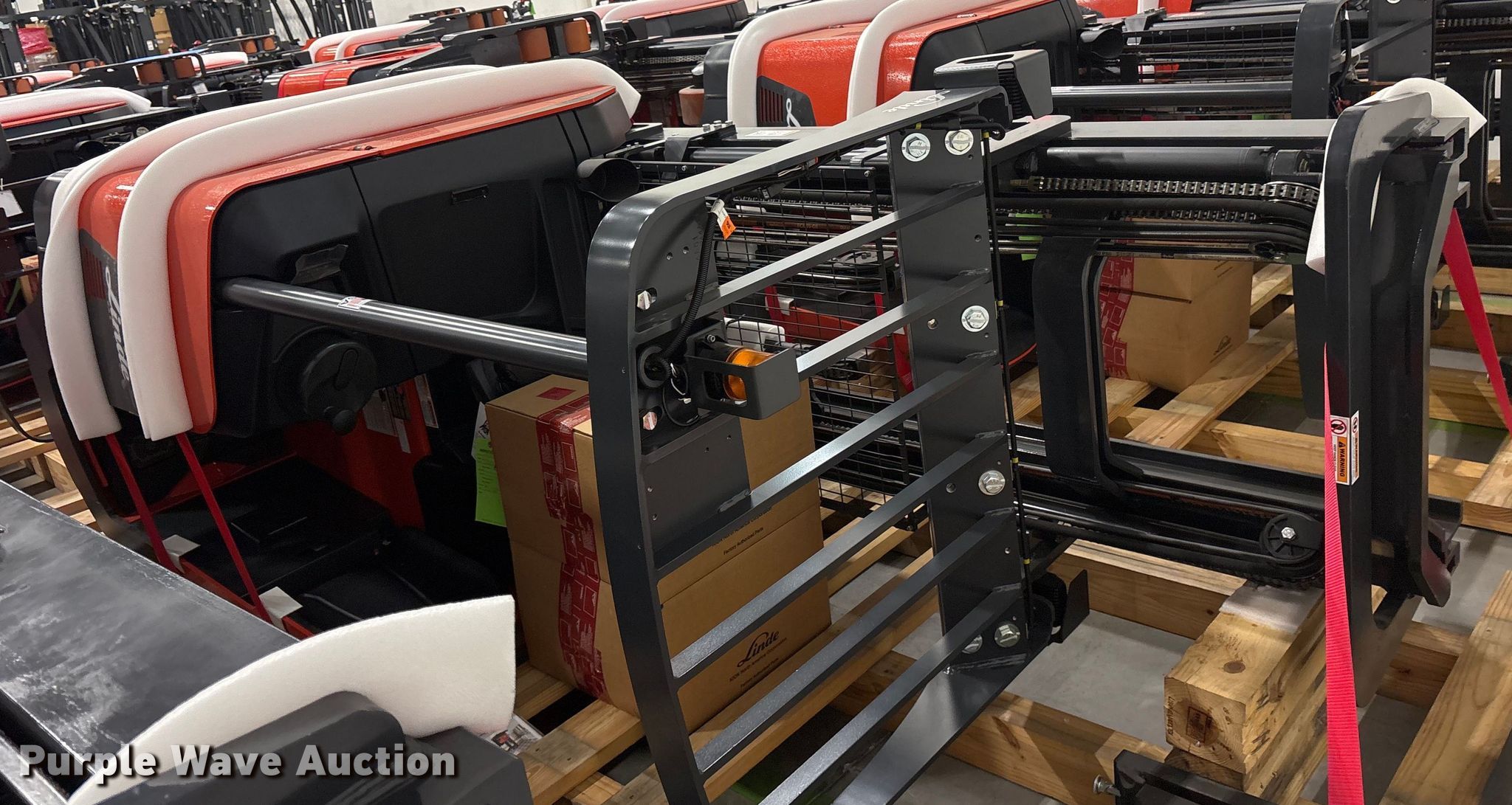 2023 Linde R17SX reach truck. Serial: C25195M00507. Electric Motor Volts: 36, Charger: Tricom Opps Phase: Three, Amps: 200, Battery: Crown 18-125LM-13 Serial: 06689E4, Amp hour: 750. Transmission Electric drive. Operators station OROPS. Features Maximum lift capacity: 3,500 lbs, Maximum lift height: 270", Collapsed mast height: 119", Mast stages: 3, Side shift, Mast tilt, Fork length: 42". Tires Solid, Non-marking. Notes Unused, 3 year or 6,000 hour warranty valid after predelivery inspection by licensed Linde dealer is complete. Fees apply. Representative photos. Prologis - Linde Warranty Available. Lewisville, TX 75067