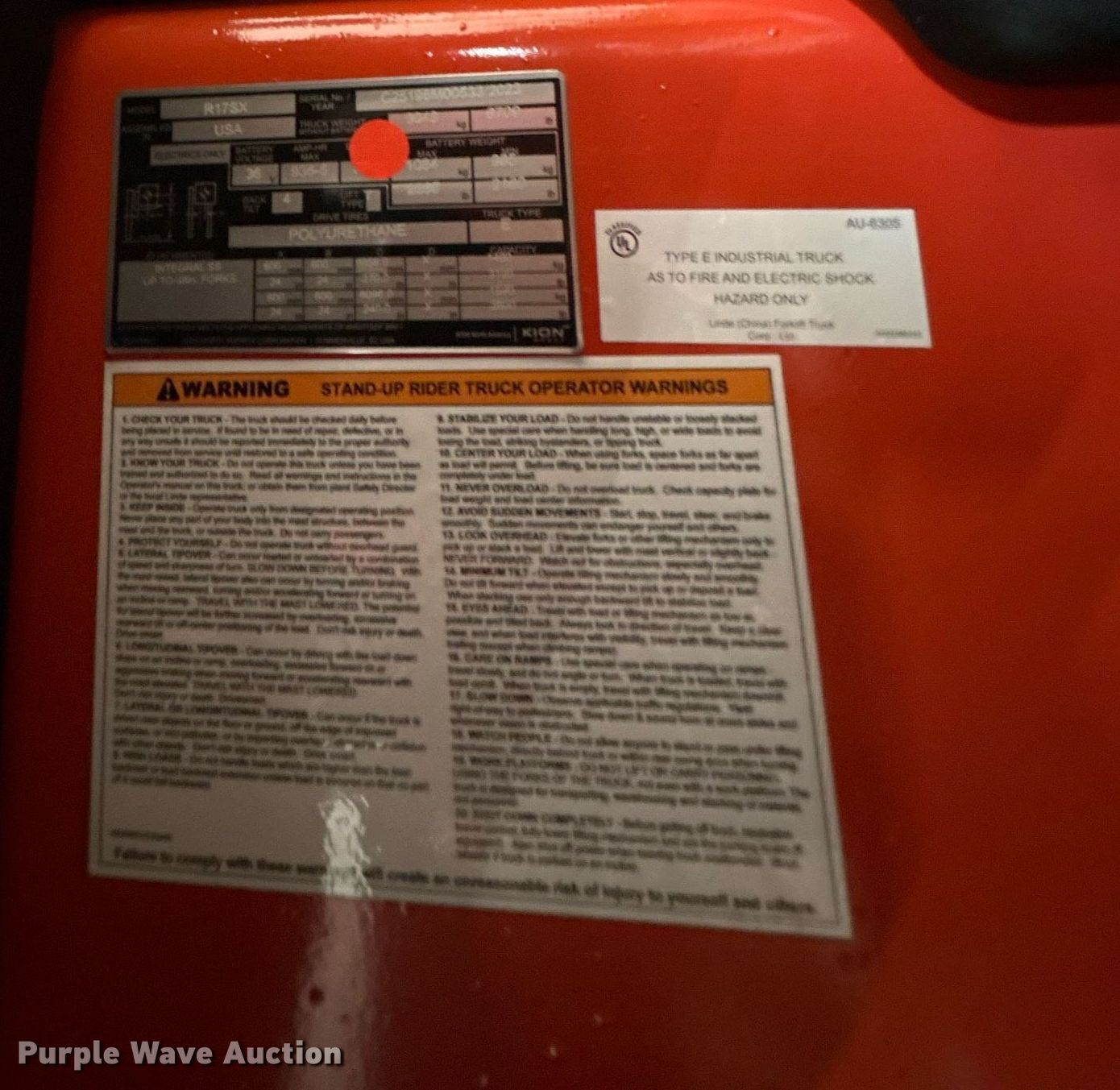 2023 Linde R17SX reach truck. Serial: C25195M00533. Electric Motor Volts: 36, Charger: Tricom Opps Phase: Three, Amps: 200, Battery: Crown 18-125LM-13 Serial: 06438A4, Amp hour: 750. Transmission Electric drive. Operators station OROPS. Features Maximum lift capacity: 3,500 lbs, Maximum lift height: 270", Collapsed mast height: 119", Mast stages: 3, Side shift, Mast tilt, Fork length: 42". Tires Solid, Non-marking. Notes Unused, 3 year or 6,000 hour warranty valid after predelivery inspection by licensed Linde dealer is complete. Fees apply. Representative photos. Prologis - Linde Warranty Available. Lewisville, TX 75067