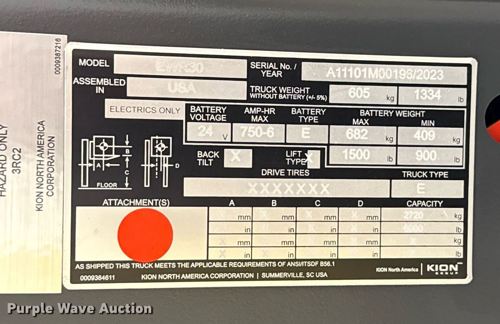 Purple Wave is selling a used Warehouse Forklift in Texas. This item is a 2023 Linde EWR30 pallet jack with the following: Hours: 1 on meter, Serial: A11101M00196