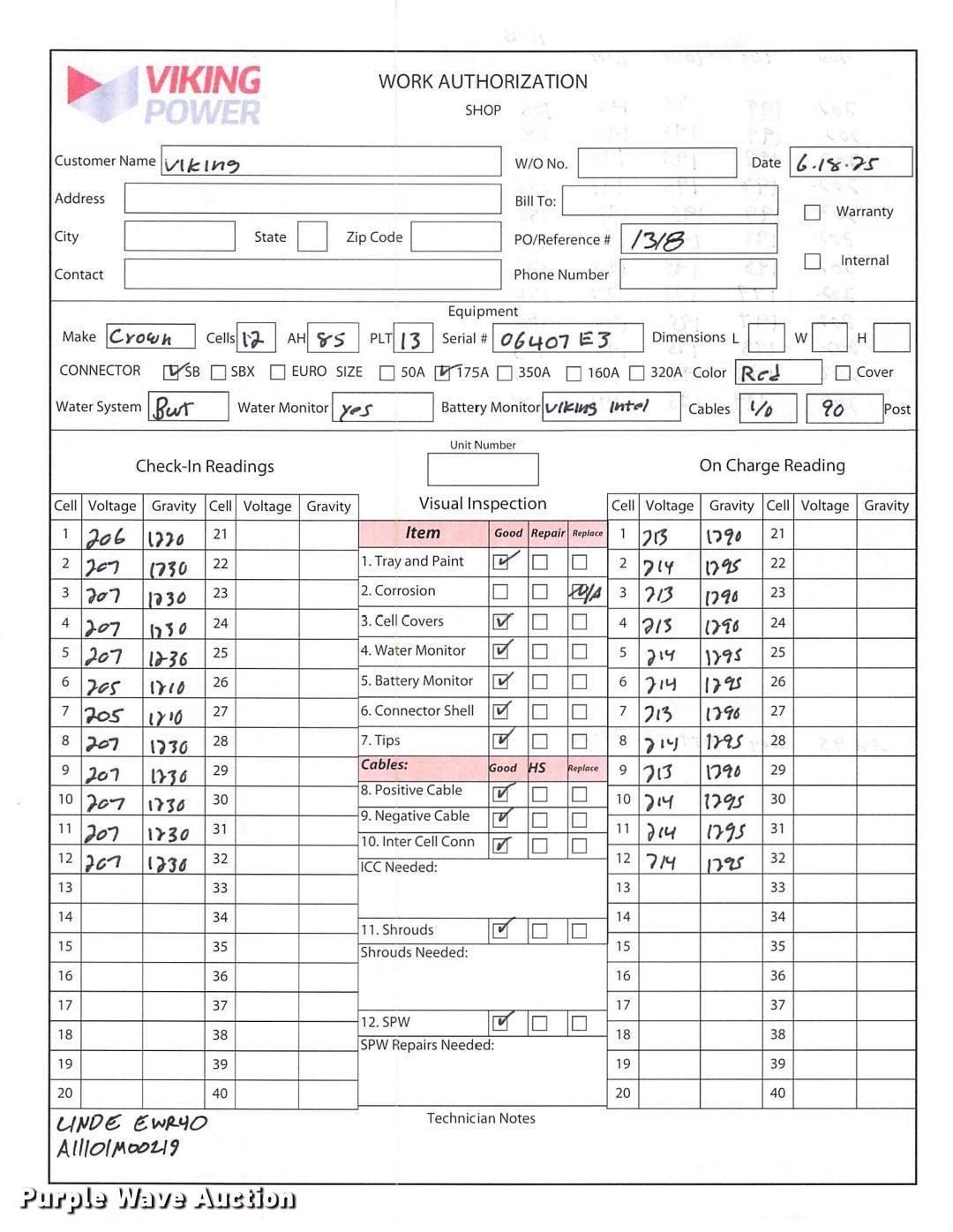 2023 Linde EWR40 pallet jack. Hours: 1 on meter, Serial: A11101M00219. Electric Motor Volts: 24, Phase: Three, Charger: Viking Ferro Three phase, Battery: Crown 12-85-LM-13 Serial 06407E3, 510AH, Water kit. Transmission Electric drive. Features Maximum lift capacity: 8,000 lbs, Fork length: 96". Tires Solid, Non-marking. Notes 2 year or 4,000 hour warranty valid after predelivery inspection by licensed Linde dealer is complete. Fees apply. Prologis - Linde Warranty Available. Lewisville, TX 75067