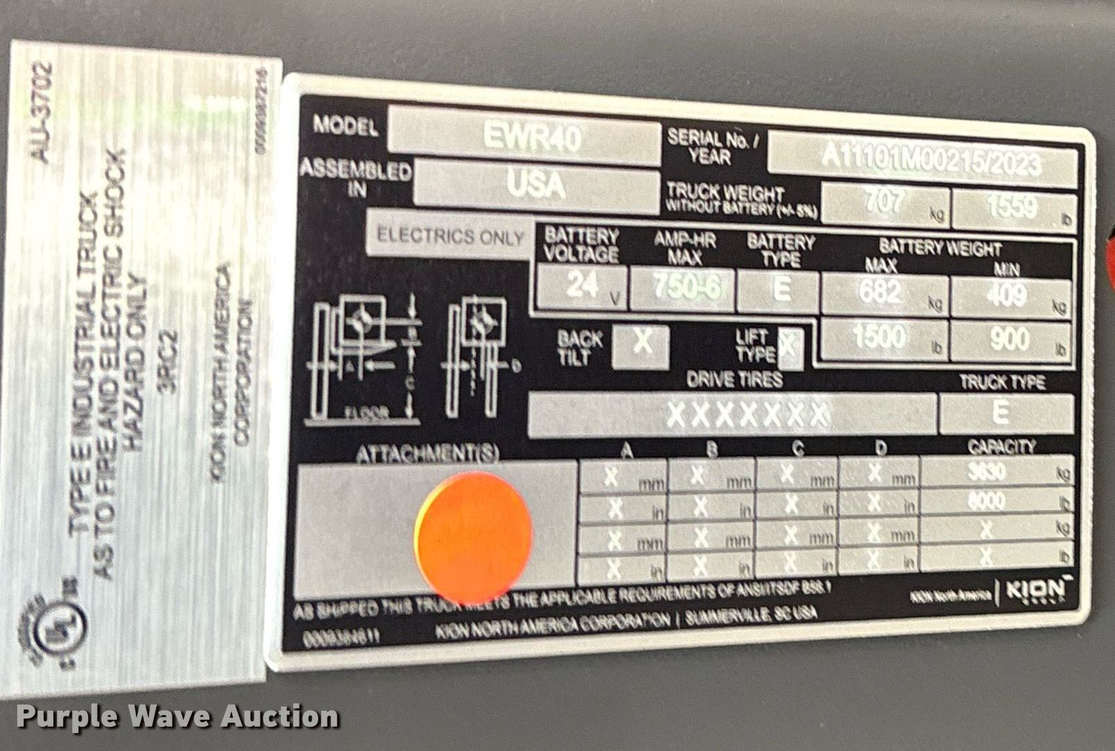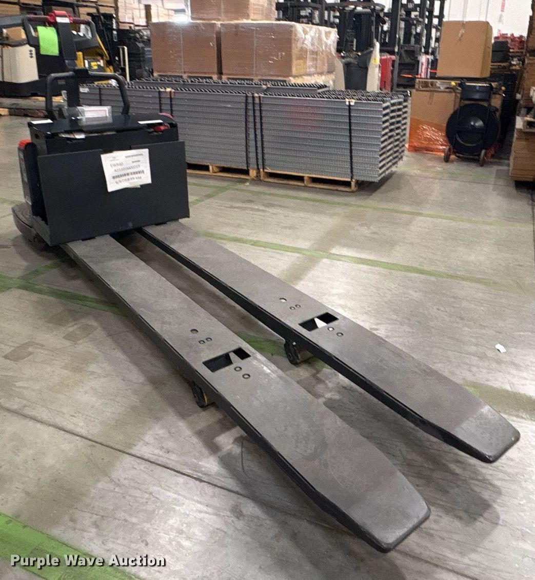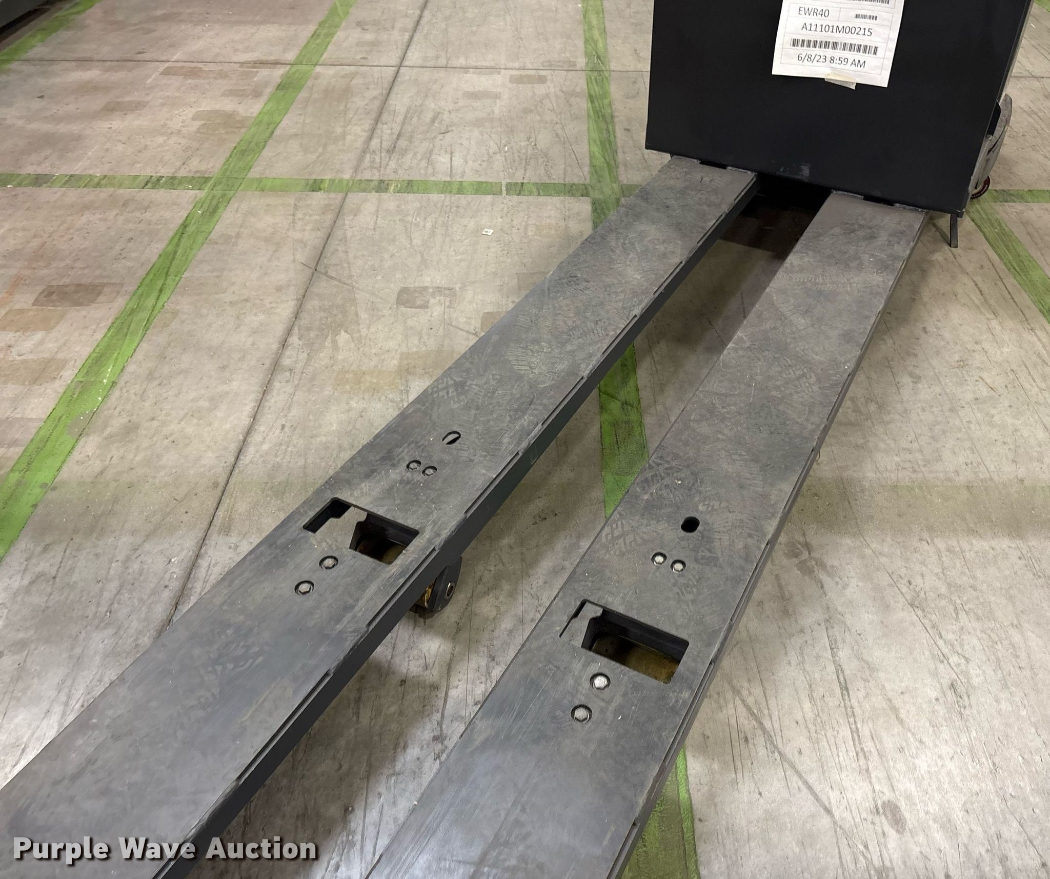 2023 Linde EWR40 pallet jack. Hours: 1 on meter, Serial: A11101M00215. Electric Motor Volts: 24, Phase: Three, Charger: Viking Ferro Three phase, Battery: Viking 510AH, Water kit. Transmission Electric drive. Features Maximum lift capacity: 8,000 lbs, Fork length: 96". Tires Solid, Non-marking. Notes 2 year or 4,000 hour warranty valid after predelivery inspection by licensed Linde dealer is complete. Fees apply. Prologis - Linde Warranty Available. Lewisville, TX 75067