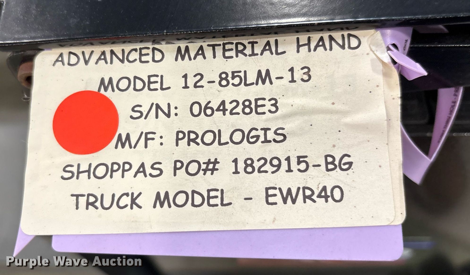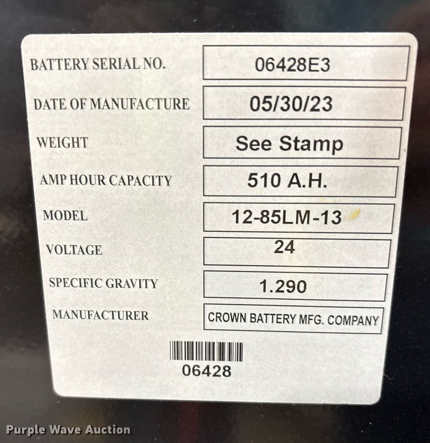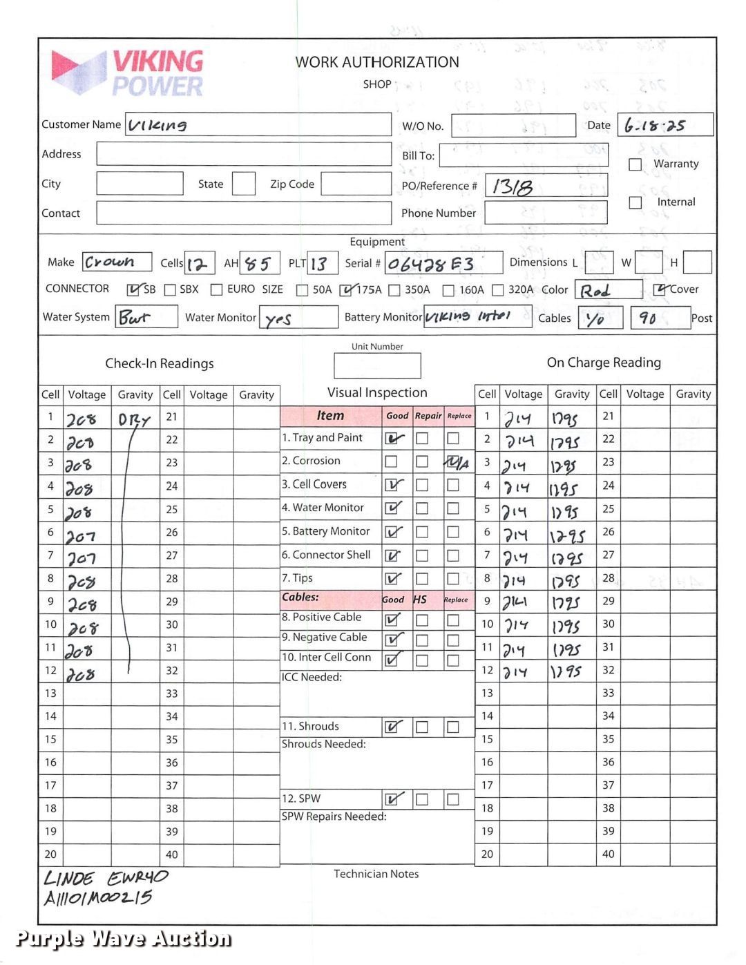 2023 Linde EWR40 pallet jack. Hours: 1 on meter, Serial: A11101M00215. Electric Motor Volts: 24, Phase: Three, Charger: Viking Ferro Three phase, Battery: Viking 510AH, Water kit. Transmission Electric drive. Features Maximum lift capacity: 8,000 lbs, Fork length: 96". Tires Solid, Non-marking. Notes 2 year or 4,000 hour warranty valid after predelivery inspection by licensed Linde dealer is complete. Fees apply. Prologis - Linde Warranty Available. Lewisville, TX 75067