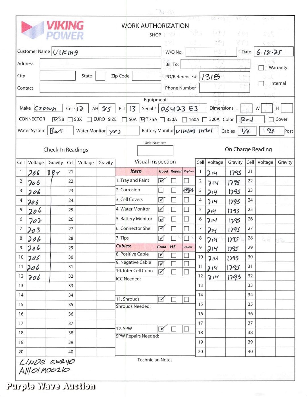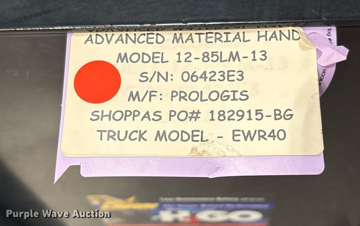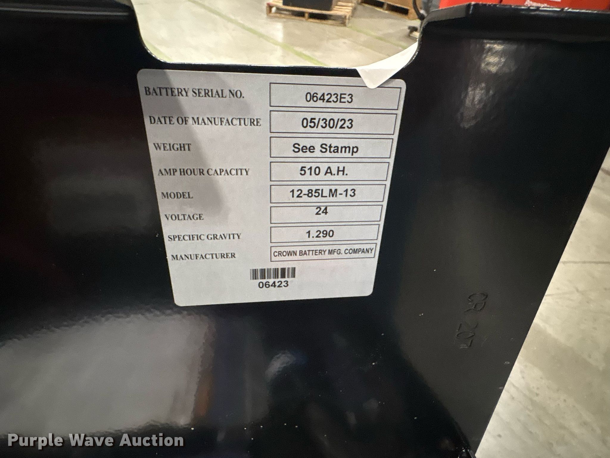 2023 Linde EWR40 pallet jack. Hours: 1 on meter, Serial: A11101M00210. Electric Motor Volts: 24, Phase: Three, Charger: Viking Ferro Three phase, Battery: Crown 12-85-LM-13 Serial 06423E3, 510AH, Water kit. Transmission Electric drive. Features Maximum lift capacity: 8,000 lbs, Fork length: 96". Tires Solid, Non-marking. Notes 2 year or 4,000 hour warranty valid after predelivery inspection by licensed Linde dealer is complete. Fees apply. Prologis - Linde Warranty Available. Lewisville, TX 75067