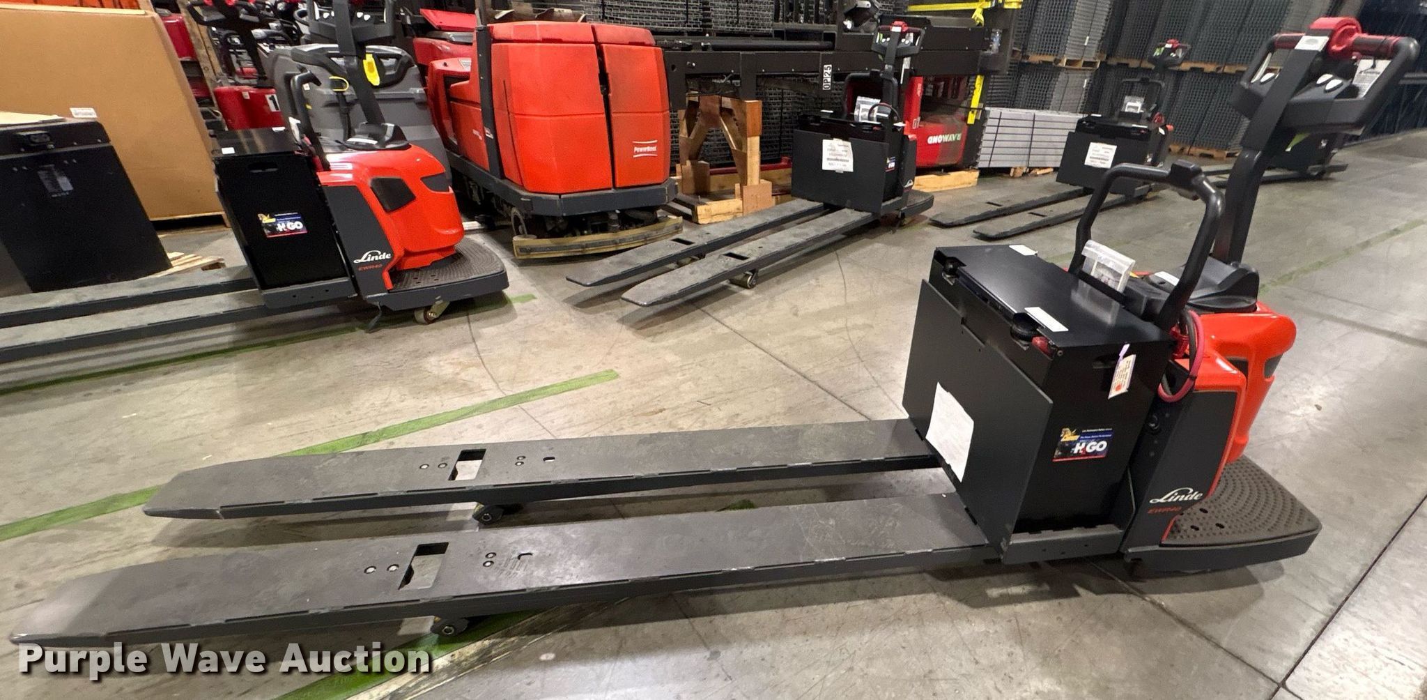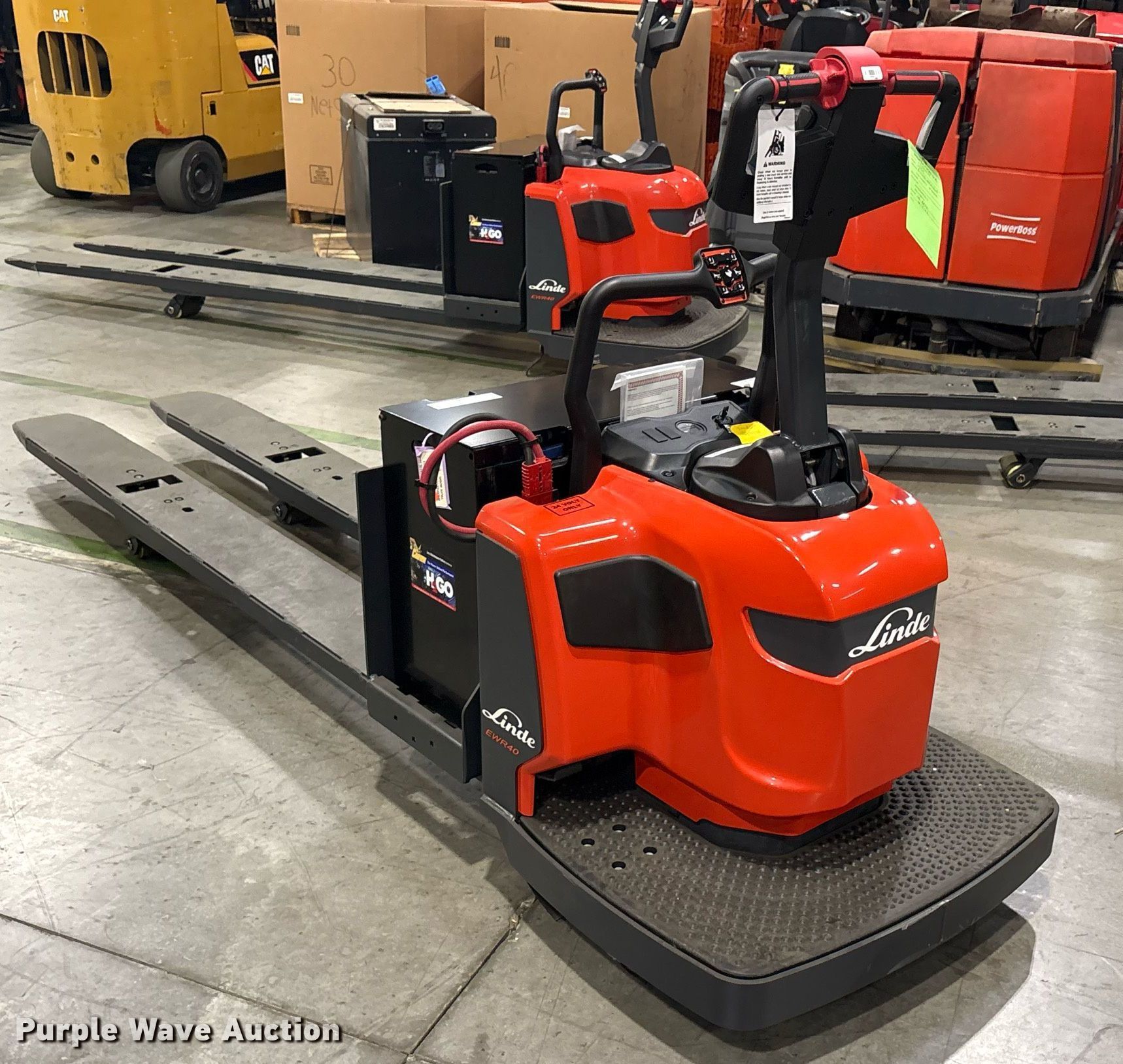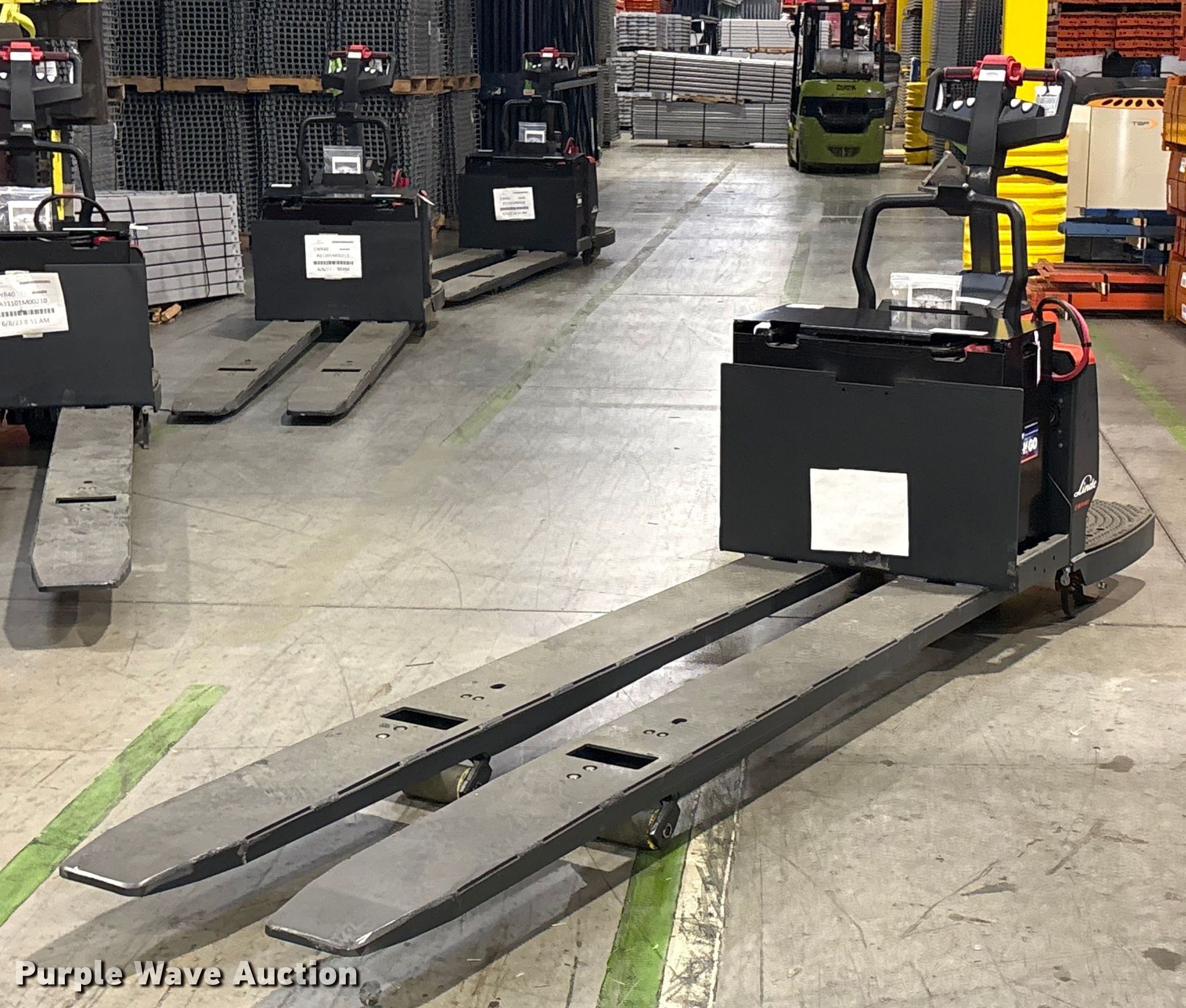 Purple Wave is selling a used Warehouse Forklift in Texas. This item is a 2023 Linde EWR40 pallet jack with the following: Hours: 1 on meter, Serial: A11101M00214