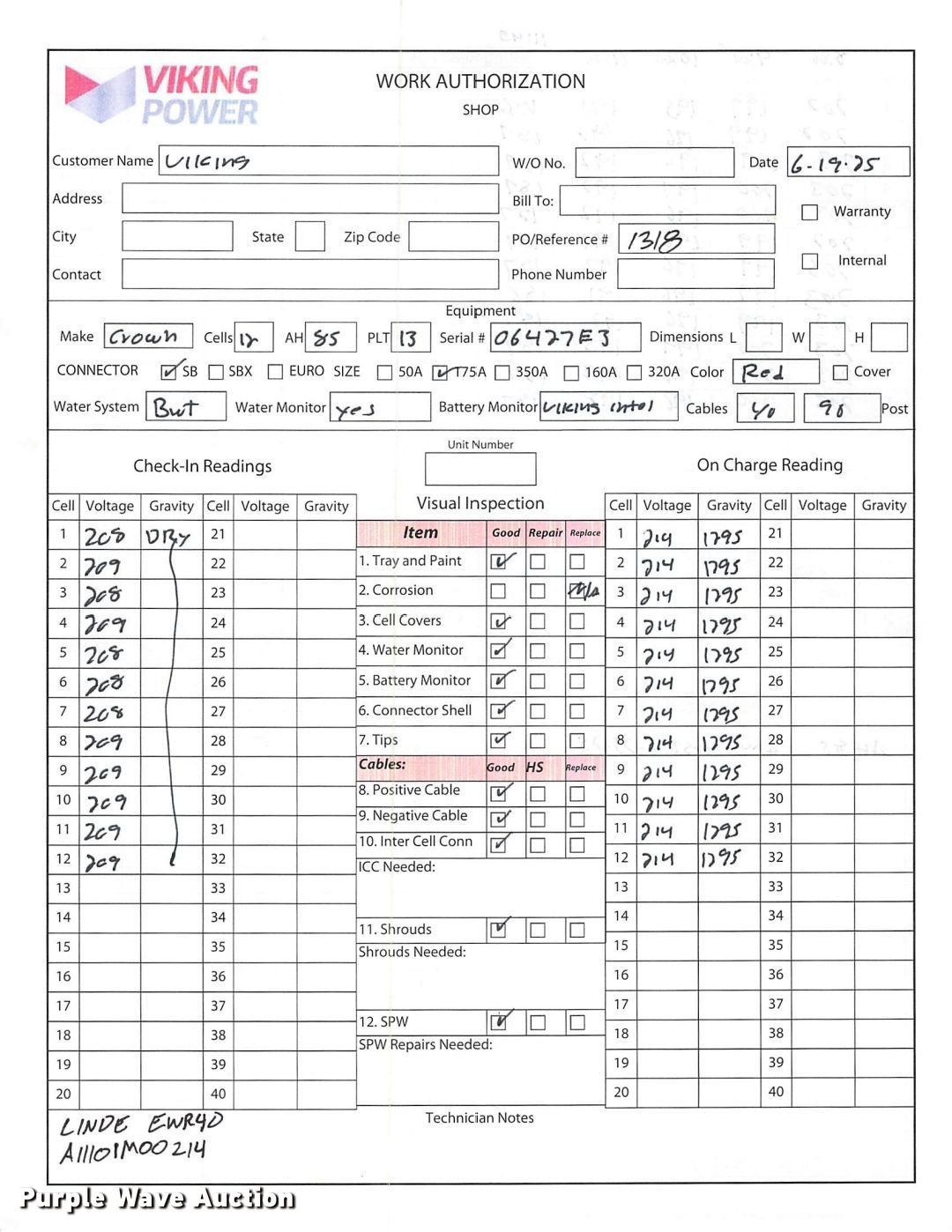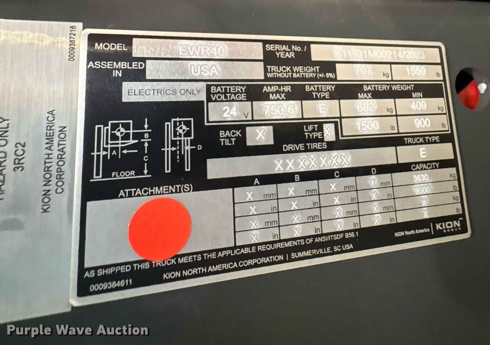 2023 Linde EWR40 pallet jack. Hours: 1 on meter, Serial: A11101M00214. Electric Motor Volts: 24, Phase: Three, Charger: Viking Ferro Three phase, Battery: Viking 510AH, Water kit. Transmission Electric drive. Features Maximum lift capacity: 8,000 lbs, Fork length: 96". Tires Solid, Non-marking. Notes 2 year or 4,000 hour warranty valid after predelivery inspection by licensed Linde dealer is complete. Fees apply. Prologis - Linde Warranty Available. Lewisville, TX 75067