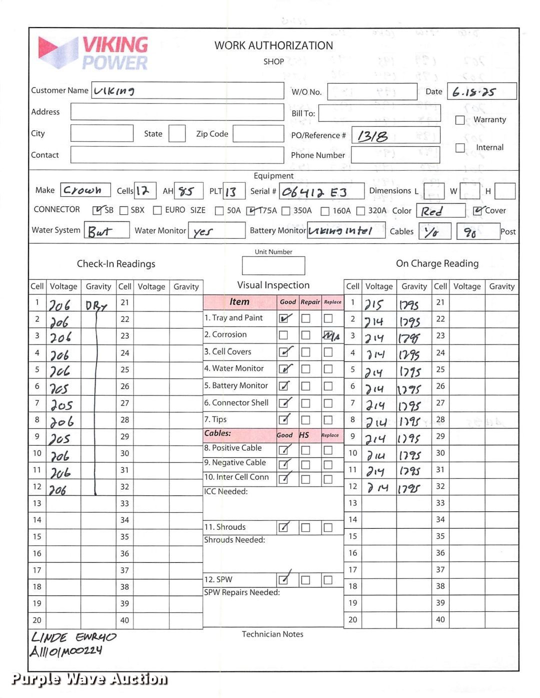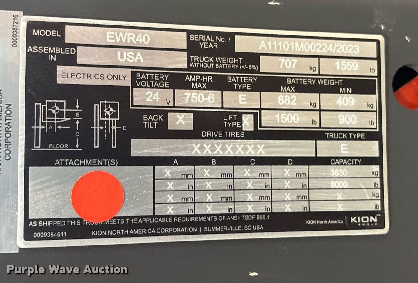 2023 Linde EWR40 pallet jack. Hours: 1 on meter, Serial: A11101M00224. Electric Motor Volts: 24, Phase: Three, Charger: Viking Ferro Three phase, Battery: Crown 12-85-LM-13 Serial 06412E3, 510AH, Water kit. Transmission Electric drive. Features Maximum lift capacity: 8,000 lbs, Fork length: 96". Tires Solid, Non-marking. Notes 2 year or 4,000 hour warranty valid after predelivery inspection by licensed Linde dealer is complete. Fees apply. Prologis - Linde Warranty Available. Lewisville, TX 75067
