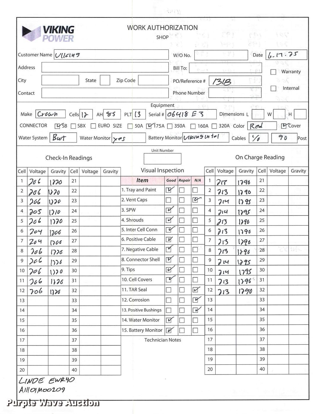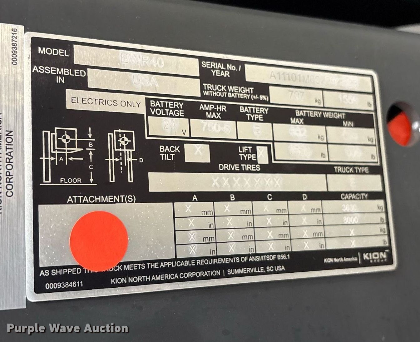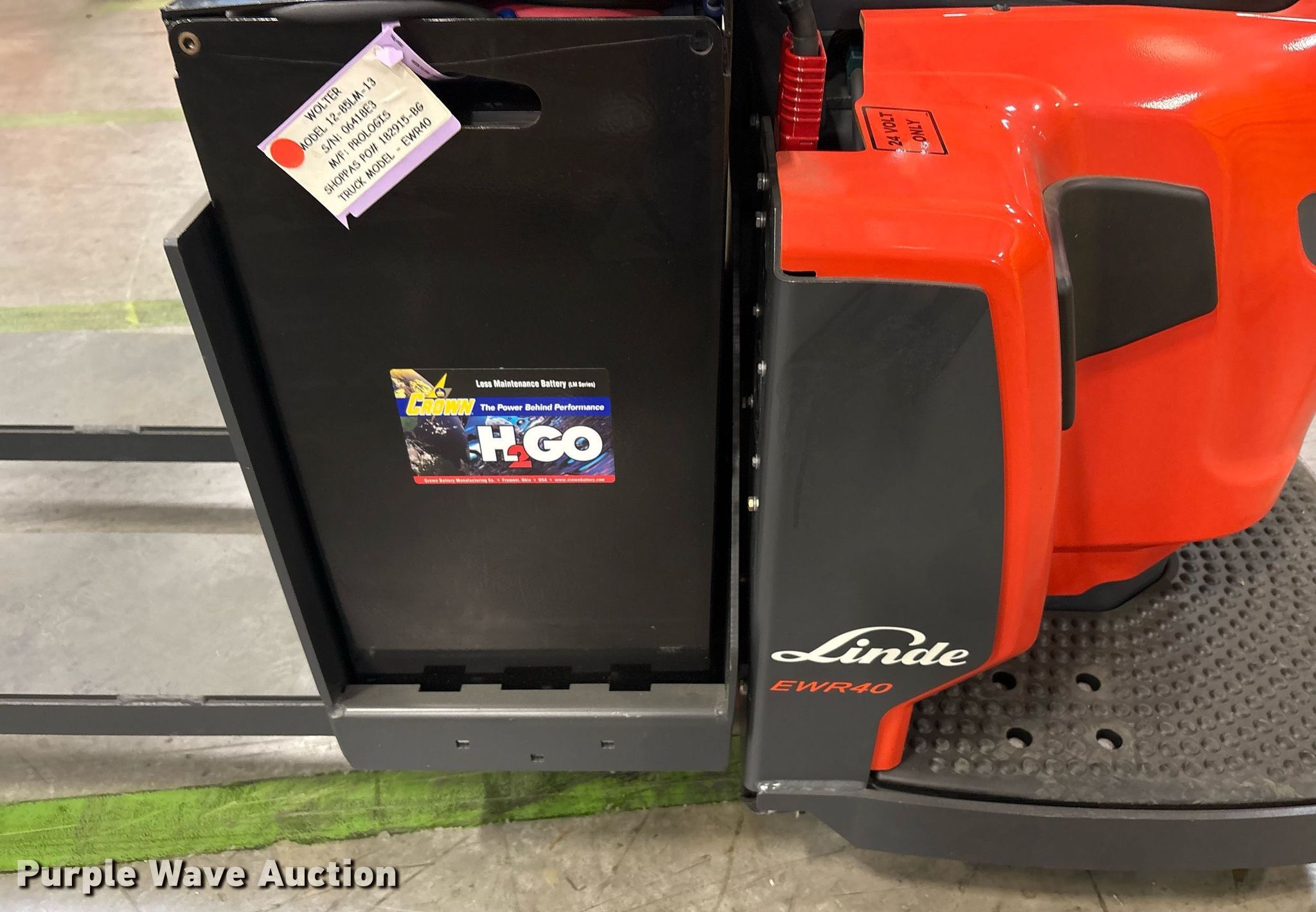 2023 Linde EWR40 pallet jack. Hours: 1 on meter, Serial: A11101M00209. Electric Motor Volts: 24, Phase: Three, Charger: Viking Ferro Three phase, Battery: Crown 12-85-LM-13 Serial 06418E3, 510AH, Water kit. Transmission Electric drive. Features Maximum lift capacity: 8,000 lbs, Fork length: 96". Tires Solid, Non-marking. Notes 2 year or 4,000 hour warranty valid after predelivery inspection by licensed Linde dealer is complete. Fees apply. Prologis - Linde Warranty Available. Lewisville, TX 75067