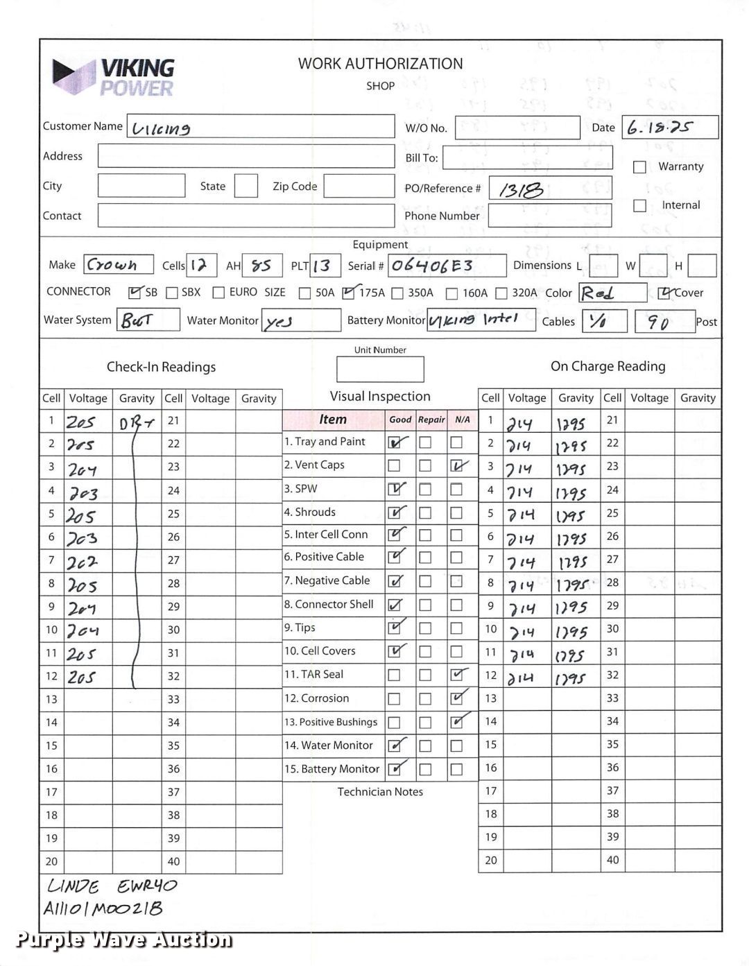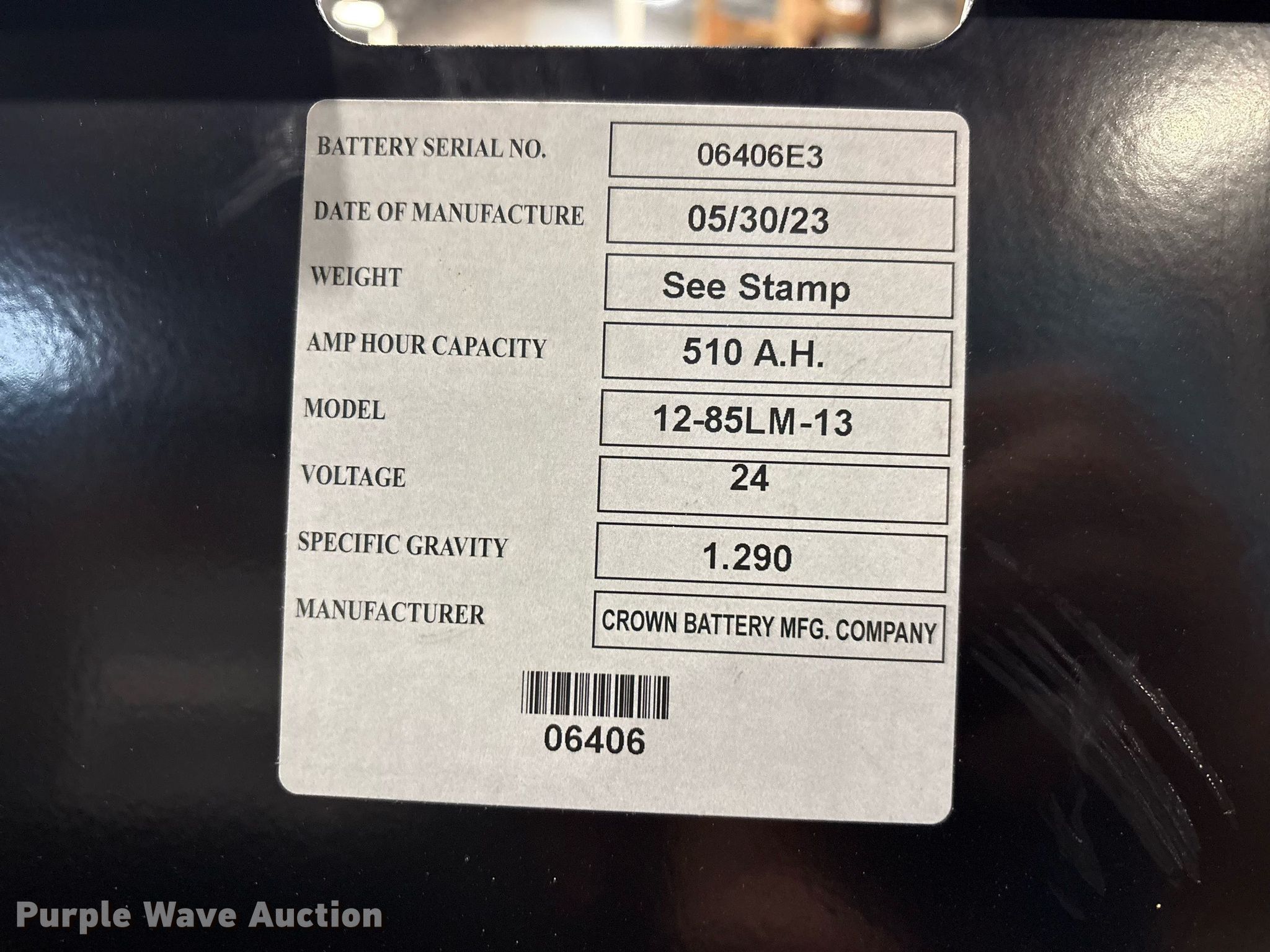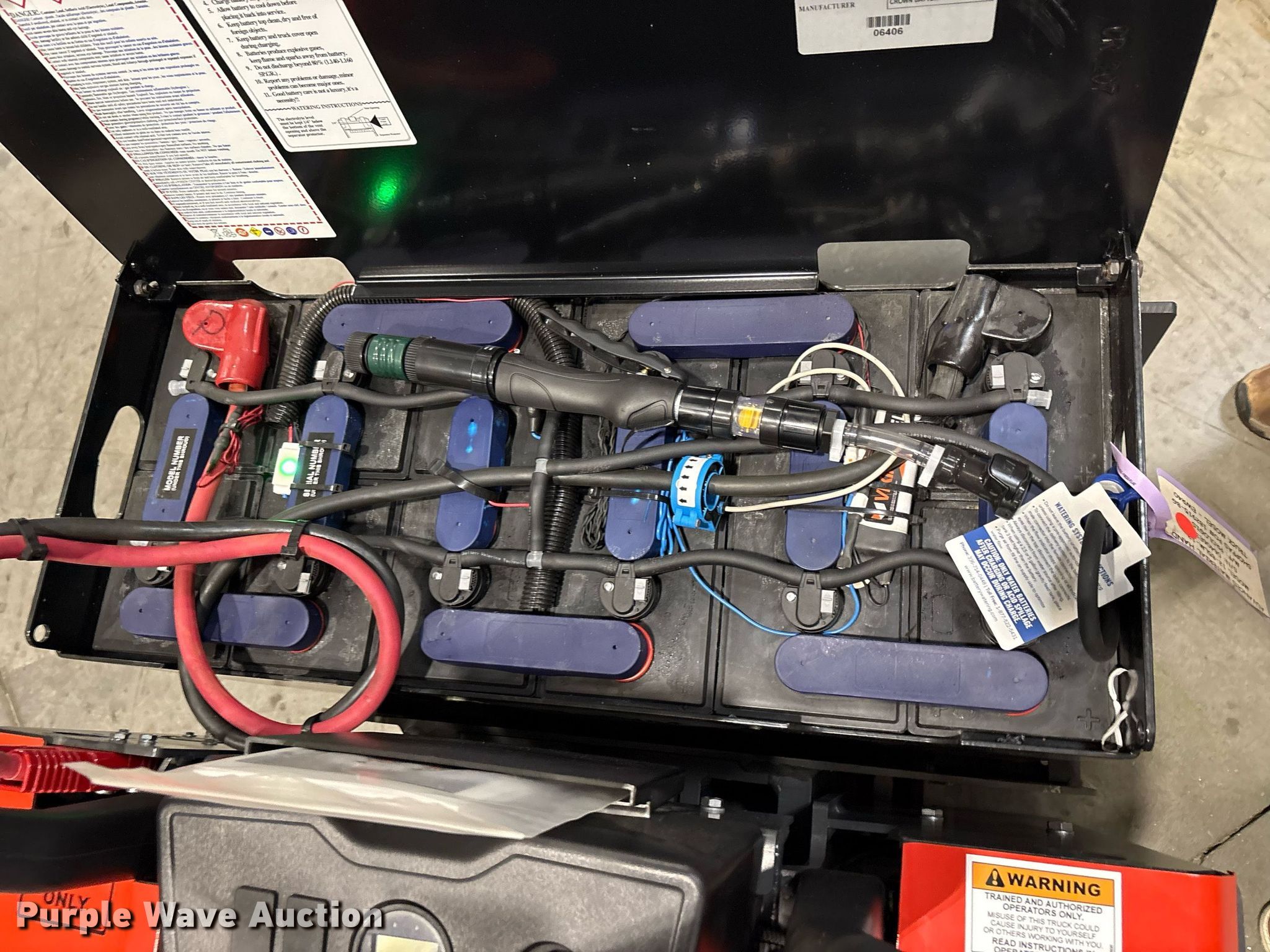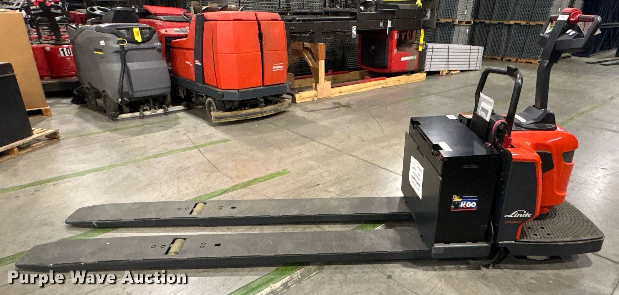 2023 Linde EWR40 pallet jack. Hours: 1 on meter, Serial: A11101M00218. Electric Motor Volts: 24, Phase: Three, Charger: Viking Ferro Three phase, Battery: Crown 12-85-LM-13 Serial 06406E3, 510AH, Water kit. Transmission Electric drive. Features Maximum lift capacity: 8,000 lbs, Fork length: 96". Tires Solid, Non-marking. Notes 2 year or 4,000 hour warranty valid after predelivery inspection by licensed Linde dealer is complete. Fees apply. Prologis - Linde Warranty Available. Lewisville, TX 75067