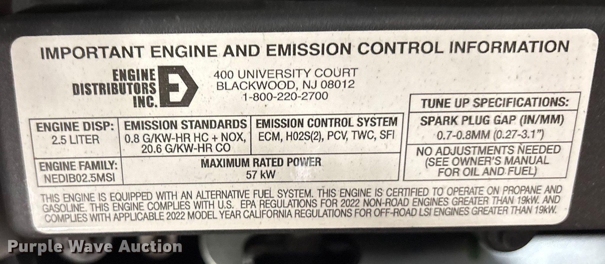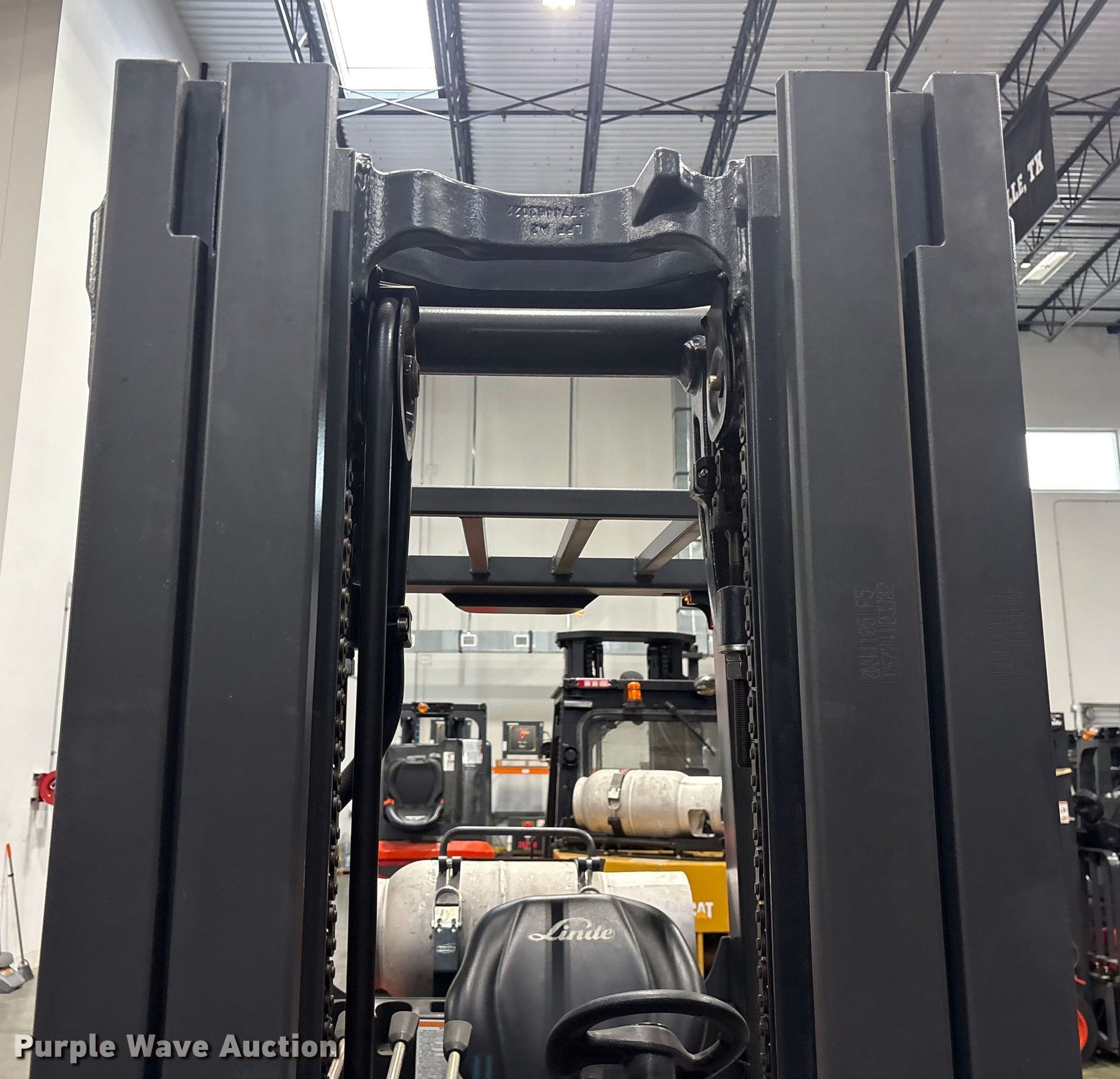 2023 Linde HT27CT forklift. Hours: 2 on meter, Serial: A11319M00027. Engine Engine Distributors Inc, Displacement: 2.5L, Cylinders: 4, Fuel type: LPG LP bottle: Not included. Transmission Powershift. Operators station OROPS. Features Maximum lift capacity: 5,500 lbs, Maximum lift height: 186", Collapsed mast height: 84", Mast stages: 3, Side shift, Mast tilt. Tires Front: 21x8x15, Rear: 16x6x10 1/2, Solid. Notes Dead battery, Forks not included, 3 year or 6,000 hour warranty valid after predelivery inspection by licensed Linde dealer is complete. Fees apply. Prologis - Linde Warranty Available. Lewisville, TX 75067