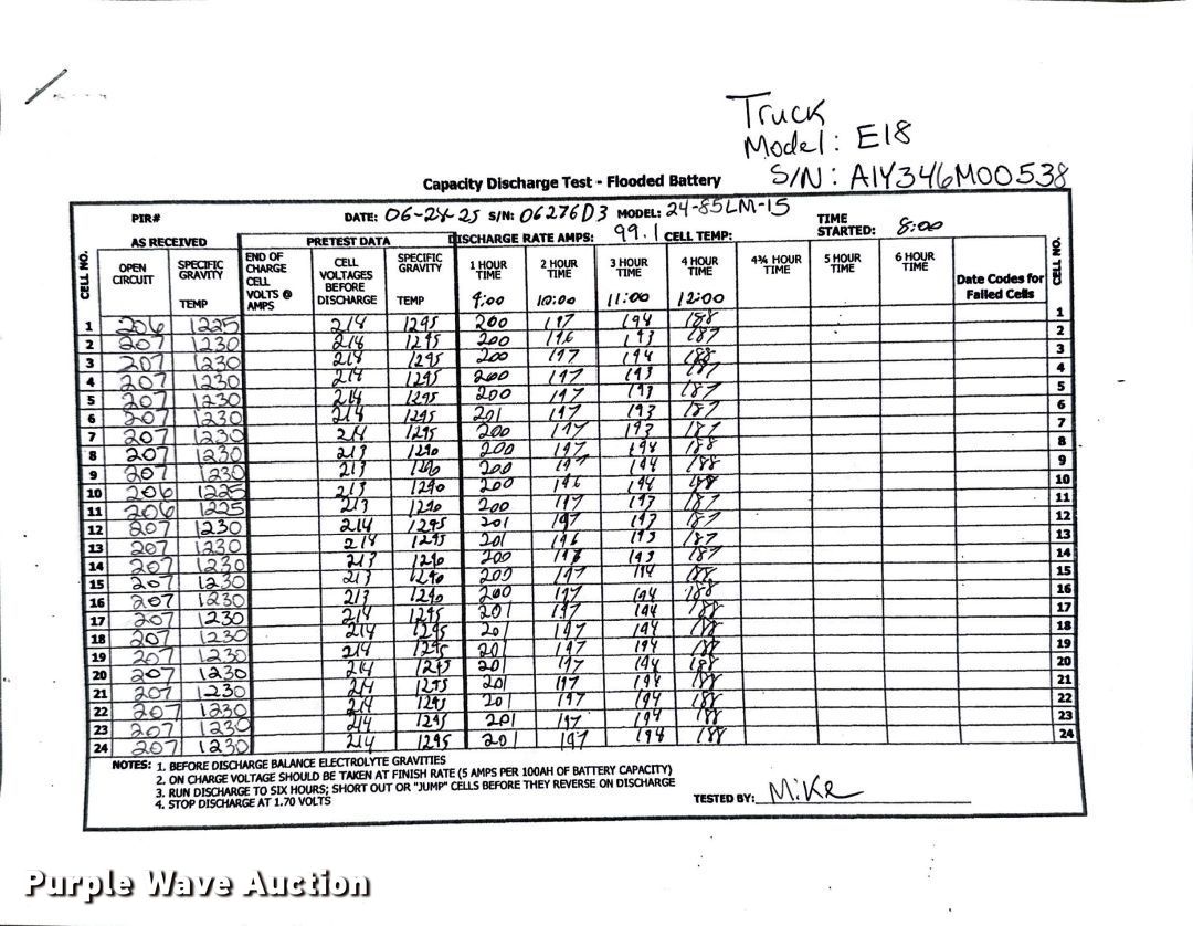 2023 Linde E18 forklift. Hours: 1 on meter, Serial: A1Y346M00538. Electric Motor Volts: 48, Phase: Three, Charger: Viking Ferro Phase: Three, Battery: Viking Intel Amp hour: 595. Transmission Electric drive. Operators station OROPS. Features Maximum lift capacity: 3,250 lbs, Maximum lift height: 188", Collapsed mast height: 84", Mast stages: 3, Side shift, Mast tilt, Fork length: 42". Tires Front: 18x7x12 1/8, Rear: 15x5x11 1/4, Solid. Notes 3 year or 6,000 hour warranty valid after predelivery inspection by licensed Linde dealer is complete Fees apply. Prologis - Linde Warranty Available. Lewisville, TX 75067