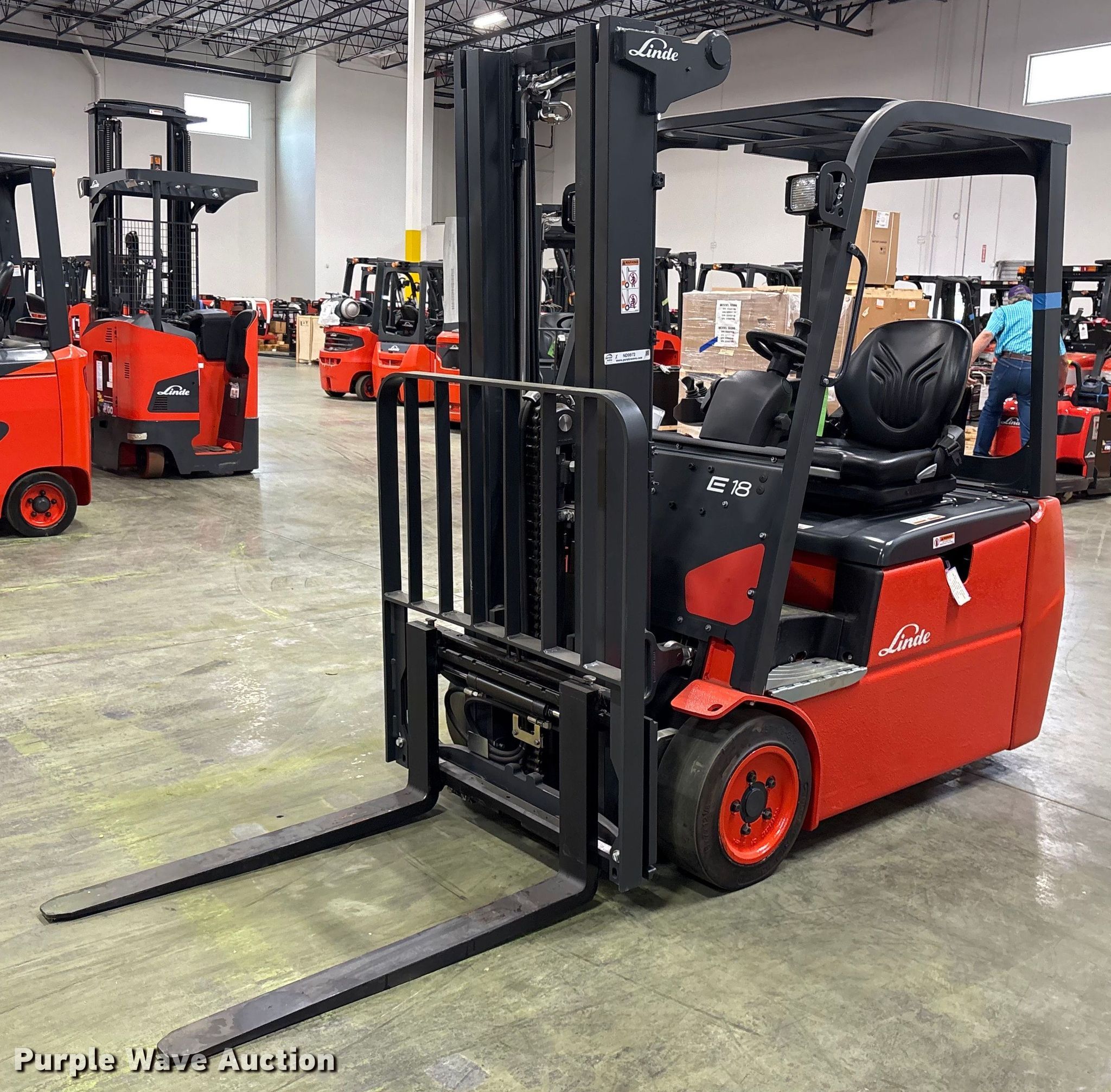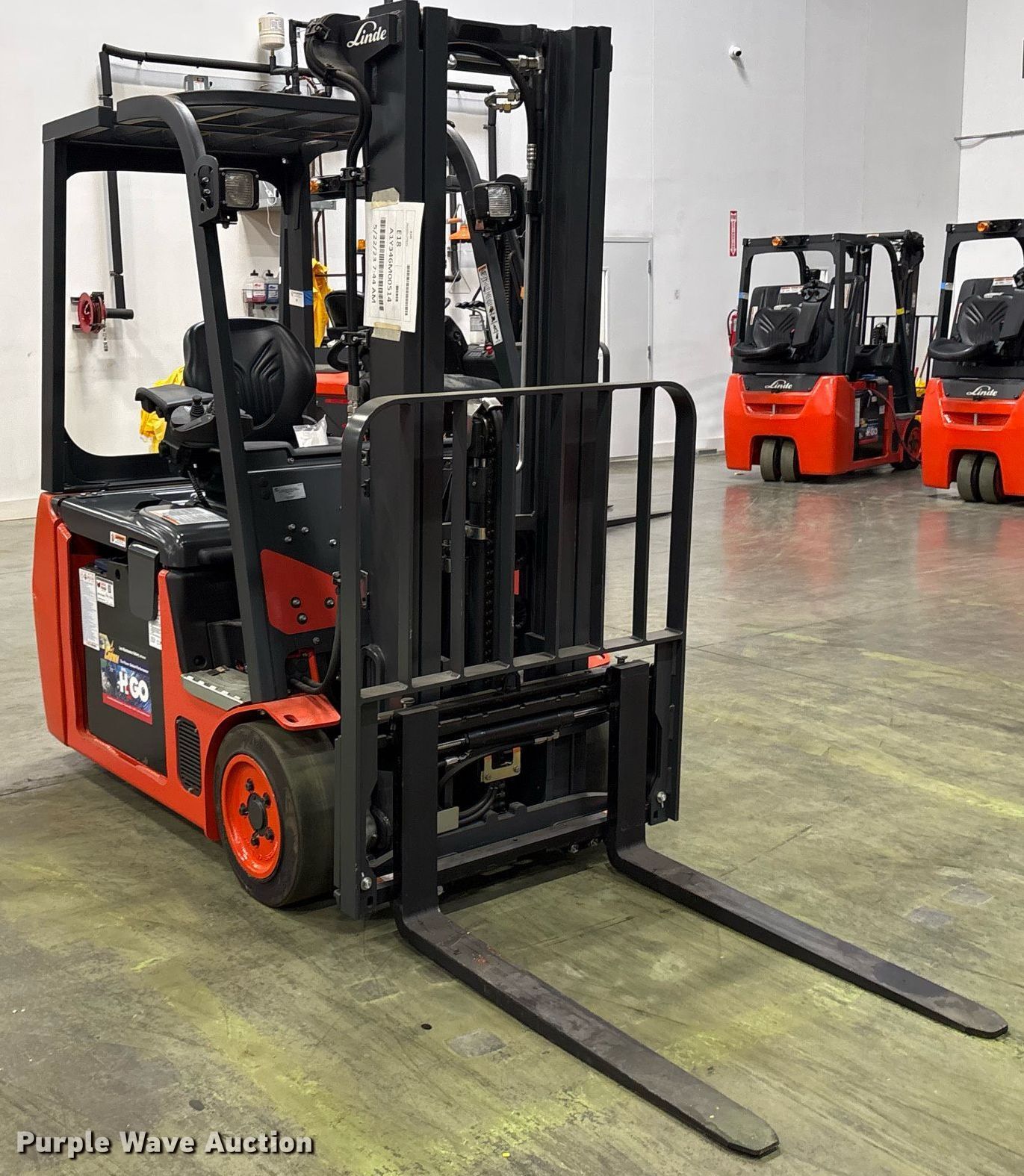 Purple Wave is selling a used Warehouse Forklift in Texas. This item is a 2023 Linde E18 forklift with the following: Hours: 1 on meter, Serial: A1Y346M00514